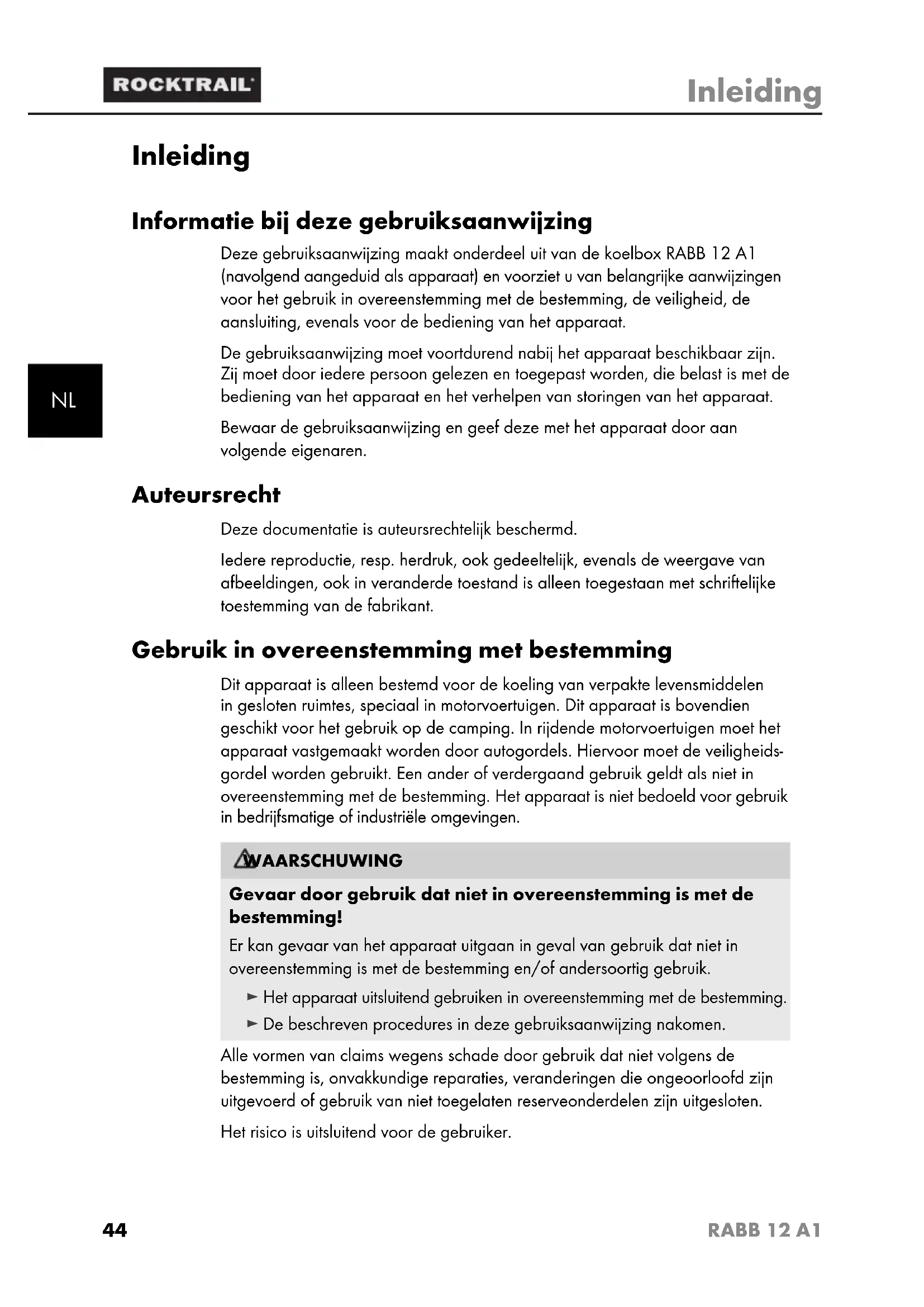 Inleiding Informatie bij deze gebruiksaanwijzing Deze gebruiksaanwijzing maakt onderdeel uit van de koelbox RABB 12 A1 (navolgend aangeduid als apparaat) en voorziet u van belangrijke aanwijzingen voor het gebruik in overeenstemming met de bestemming, de veiligheid, de aansluiting, evenals voor de bediening van het apparaat.De gebruiksaanwijzing moet voortdurend nabij het apparaat beschikbaar zijn. Zij moet door iedere persoon gelezen en toegepast worden, die belast is met de bediening van het apparaat en het verhelpen van storingen van het apparaat.Bewaar de gebruiksaanwijzing en geef deze met het apparaat door aan volgende eigenaren. Auteursrecht Deze documentatie is auteursrechtelijk beschermd.Iedere reproductie, resp. herdruk, ook gedeeltelijk, evenals de weergave van afbeeldingen, ook in veranderde toestand is alleen toegestaan met schriftelijke toestemming van de fabrikant. Gebruik in overeenstemming met bestemming Dit apparaat is alleen bestemd voor de koeling van verpakte levensmiddelen in gesloten ruimtes, speciaal in motorvoertuigen. Dit apparaat is bovendien geschikt voor het gebruik op de camping. In rijdende motorvoertuigen moet het apparaat vastgemaakt worden door autogordels. Hiervoor moet de veiligheids-gordel worden gebruikt. Een ander of verdergaand gebruik geldt als niet in overeenstemming met de bestemming. Het apparaat is niet bedoeld voor gebruik in bedrijfsmatige of industriële omgevingen. WAARSCHUWINGGevaar door gebruik dat niet in overeenstemming is met de bestemming!Er kan gevaar van het apparaat uitgaan in geval van gebruik dat niet in overeenstemming is met de bestemming en/of andersoortig gebruik. ► Het apparaat uitsluitend gebruiken in overeenstemming met de bestemming. ► De beschreven procedures in deze gebruiksaanwijzing nakomen.Alle vormen van claims wegens schade door gebruik dat niet volgens de bestemming is, onvakkundige reparaties, veranderingen die ongeoorloofd zijn uitgevoerd of gebruik van niet toegelaten reserveonderdelen zijn uitgesloten.Het risico is uitsluitend voor de gebruiker. Buch_61537_LB1.indb Abs1:2Buch_61537_LB1.indb Abs1:2 24.01.12 17:1824.01.12 17:1845 Inleiding RABB 12 A1