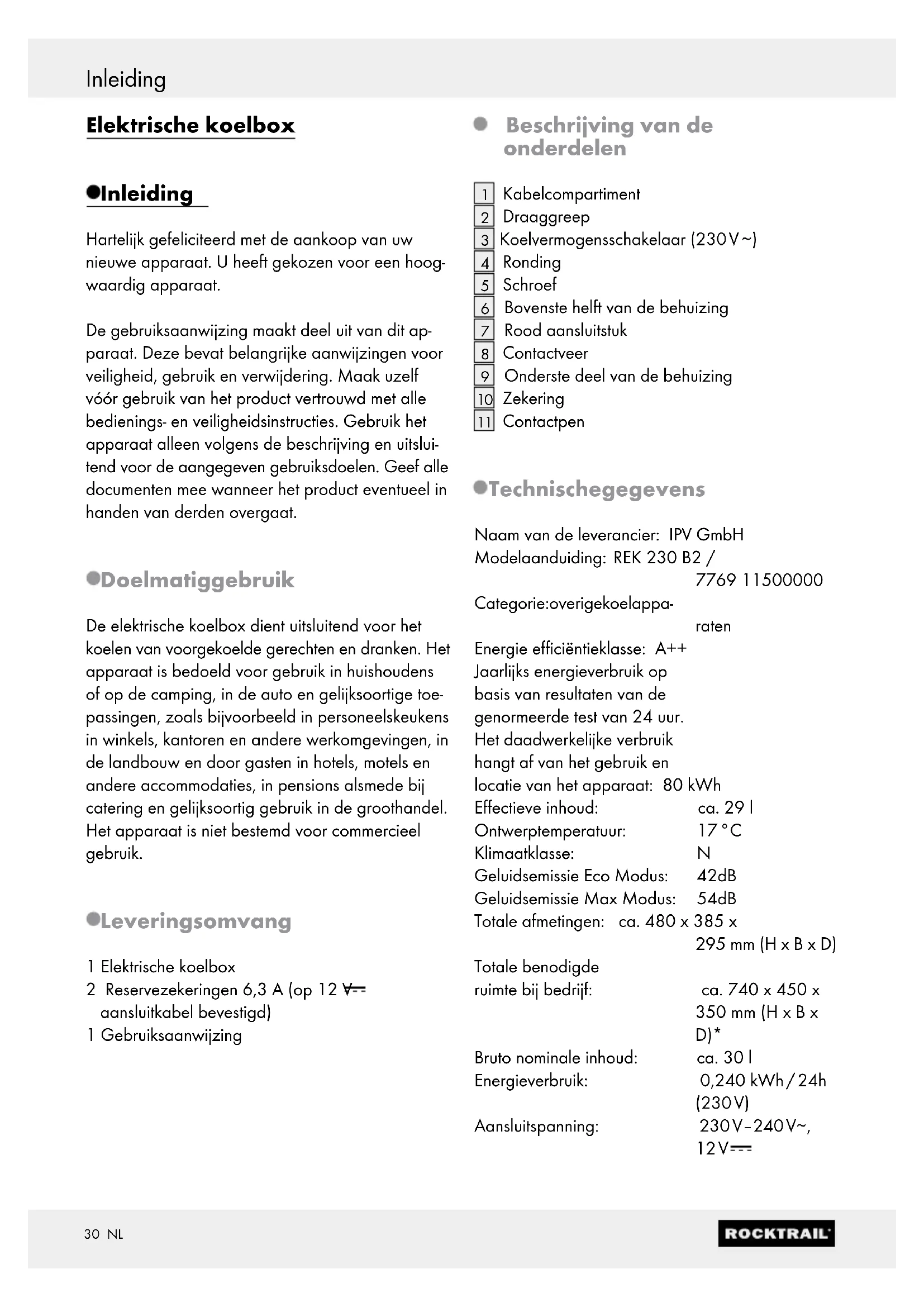 029 NL Inhoudsopgave Inleiding Doelmatig gebruik........................................................................................................................... Pagina 30 Leveringsomvang ............................................................................................................................ Pagina 30 Beschrijving van de onderdelen ..................................................................................................... Pagina 30 Technische gegevens ...................................................................................................................... Pagina 30 Algemene veiligheidsinstructies Veiligheid bij gebruik van het apparaat ........................................................................................ Pagina 31 Algemene aanwijzingen voor het gebruik .................................................... Pagina 32 Bediening Werking bij 230 V bedrijf in “eco-modus“ .................................................................................... Pagina 32 Werking bij 12 V bedrijf ................................................................................................................. Pagina 33 Tips voor de beste koelcapaciteit en energiebesparing ..................... Pagina 33 12 V-zekering vervangen .............................................................................................. Pagina 33 Mogelijke functiestoringen .......................................................................................... Pagina 33 Reiniging en onderhoud ................................................................................................. Pagina 34 Verwijdering ............................................................................................................................ Pagina 34 Garantie ....................................................................................................................................... Pagina 34 Garantieperiode en wettelijke aansprakelijkheid voor defecten ................................................. Pagina 35 Omvang van de garantie ............................................................................................................... Pagina 35 Afwikkeling in geval van garantie ................................................................................................. Pagina 35 Producent / Service .............................................................................................................. Pagina 3630 NL Inleiding Elektrische koelbox Inleiding Hartelijk gefeliciteerd met de aankoop van uw nieuwe apparaat. U heeft gekozen voor een hoog- waardig apparaat. De gebruiksaanwijzing maakt deel uit van dit ap- paraat. Deze bevat belangrijke aanwijzingen voor veiligheid, gebruik en verwijdering. Maak uzelf vóór gebruik van het product vertrouwd met alle bedienings- en veiligheidsinstructies. Gebruik het apparaat alleen volgens de beschrijving en uitslui- tend voor de aangegeven gebruiksdoelen. Geef alle documenten mee wanneer het product eventueel in handen van derden overgaat. Doelmatig gebruik De elektrische koelbox dient uitsluitend voor het koelen van voorgekoelde gerechten en dranken. Het apparaat is bedoeld voor gebruik in huishoudens of op de camping, in de auto en gelijksoortige toe- passingen, zoals bijvoorbeeld in personeelskeukens in winkels, kantoren en andere werkomgevingen, in de landbouw en door gasten in hotels, motels en andere accommodaties, in pensions alsmede bij catering en gelijksoortig gebruik in de groothandel. Het apparaat is niet bestemd voor commercieel gebruik. Leveringsomvang 1 Elektrische koelbox 2 Reservezekeringen 6,3 A (op 12 V aansluitkabel bevestigd) 1 Gebruiksaanwijzing Beschrijving van de onderdelen