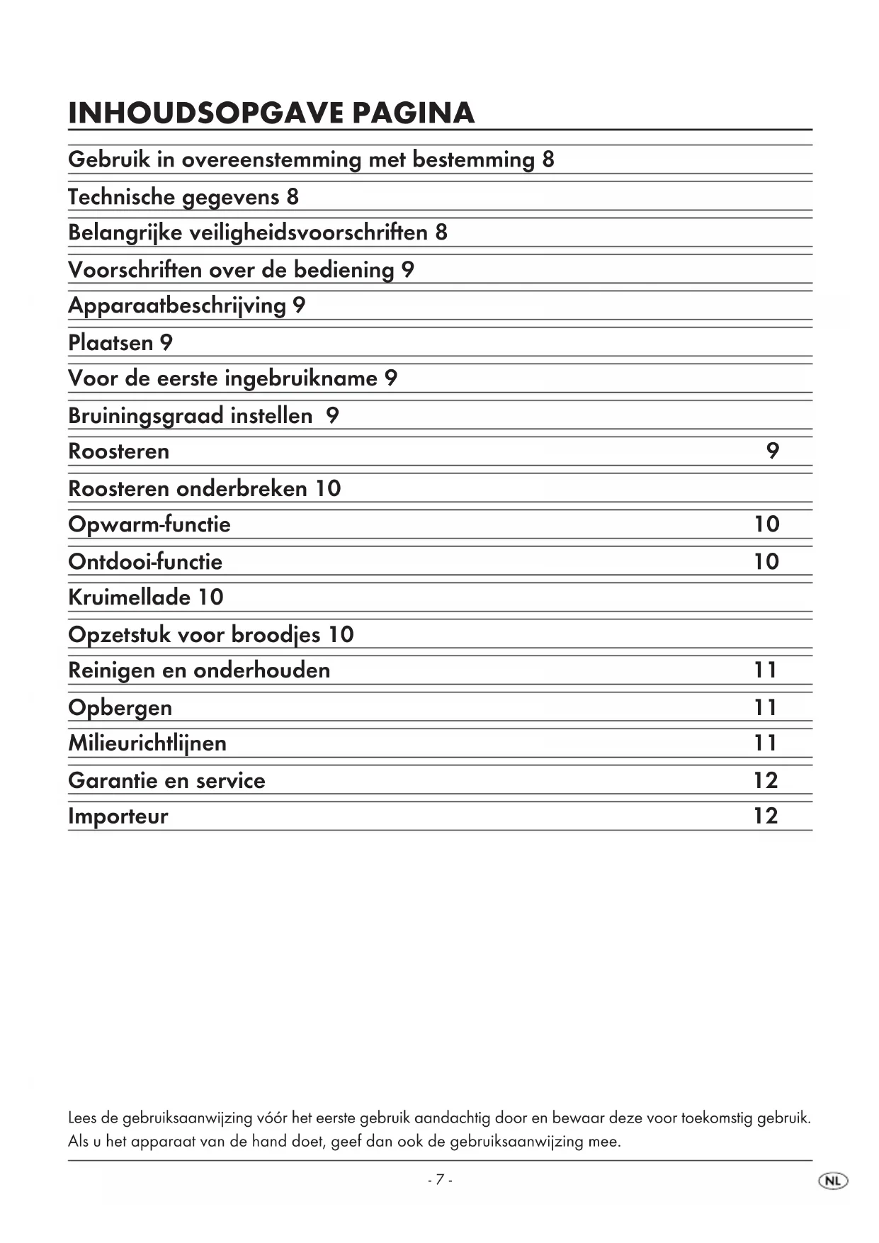 - Verschillende broodsoorten, vochtigheid en dikte van de individuele schijven hebben invloed op het bruinen van het geroosterde brood. Daarom het toastbrood naar mogelijkheid in een afgeslo- ten verpakking bewaren. Apparaatbeschrijving 1 Opzetstuk voor broodjes 2 Roosterschachten 3 Bedienknop 4 Toets voor ontdooi-functie 5 Toets voor opwarm-functie 6 Stoptoets om de roosterprocedure te onderbreken 7 Bruiningsregelaar 8 Kruimellade 9 Toets opzetstuk voor broodjes Plaatsen