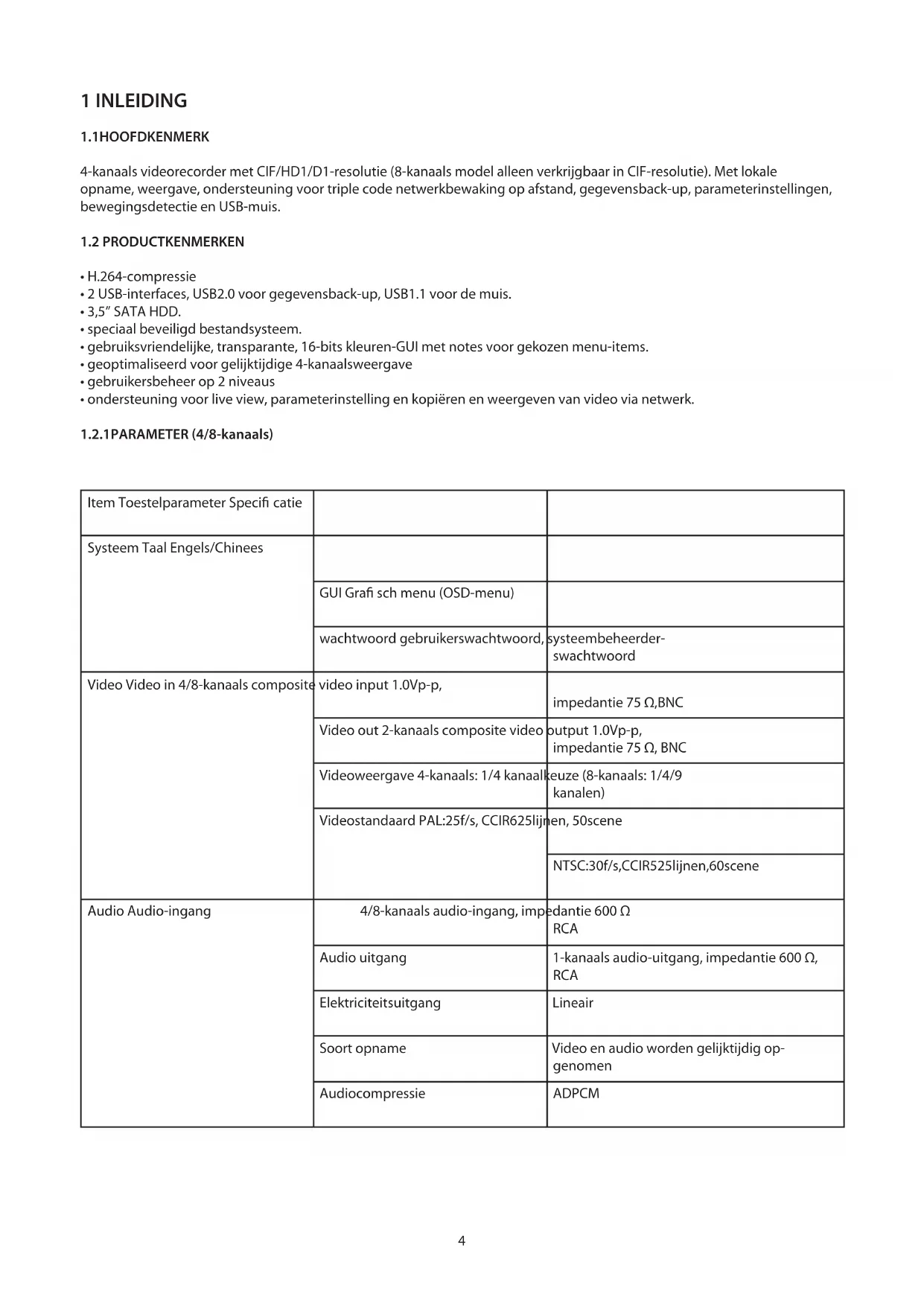 INHOUDSOPGAVE4 1 INLEIDING 1.1HOOFDKENMERK 4-kanaals videorecorder met CIF/HD1/D1-resolutie (8-kanaals model alleen verkrijgbaar in CIF-resolutie). Met lokale opname, weergave, ondersteuning voor triple code netwerkbewaking op afstand, gegevensback-up, parameterinstellingen, bewegingsdetectie en USB-muis.