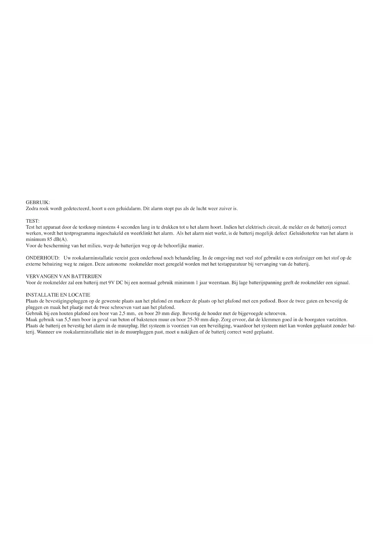 Principal fonte de alimentação Autonomia Dispositivo interligável Adequado para instalação num veículo recreativo Indicador individual alarme Facilidade prevenção alarme Tecto Baterias (xx/xx/xxxx) 1 ano Não Não Sim NãoGEBRUIK: Zodra rook wordt gedetecteerd, hoort u een geluidalarm. Dit alarm stopt pas als de lucht weer zuiver is. TEST: Test het apparaat door de testknop minstens 4 seconden lang in te drukken tot u het alarm hoort. Indien het elektrisch circuit, de melder en de batterij correct werken, wordt het testprogramma ingeschakeld en weerklinkt het alarm. Als het alarm niet werkt, is de batterij mogelijk defect .Geluidssterkte van het alarm is minimum 85 dB(A). Voor de bescherming van het milieu, werp de batterijen weg op de behoorlijke manier. ONDERHOUD: Uw rookalarminstallatie vereist geen onderhoud noch behandeling. In de omgeving met veel stof gebruikt u een stofzuiger om het stof op de externe behuizing weg te zuigen. Deze autonome rookmelder moet geregeld worden met het testapparatuur bij vervanging van de batterij.