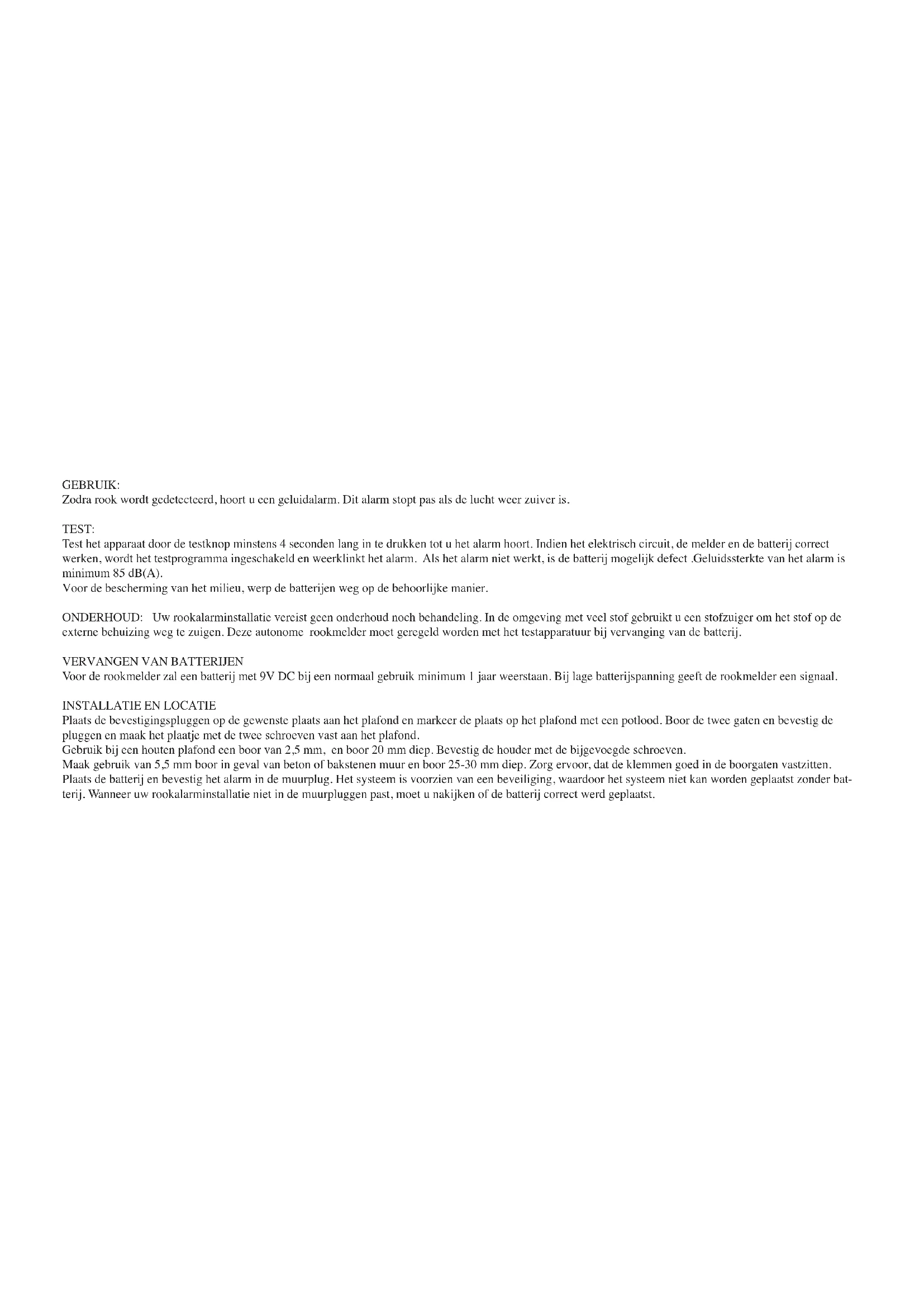 Principal fonte de alimentação Autonomia Dispositivo interligável Adequado para instalação num veículo recreativo Indicador individual alarme Facilidade prevenção alarme Tecto Baterias (xx/xx/xxxx) 1 ano Não Não Sim NãoGEBRUIK: Zodra rook wordt gedetecteerd, hoort u een geluidalarm. Dit alarm stopt pas als de lucht weer zuiver is. TEST: Test het apparaat door de testknop minstens 4 seconden lang in te drukken tot u het alarm hoort. Indien het elektrisch circuit, de melder en de batterij correct werken, wordt het testprogramma ingeschakeld en weerklinkt het alarm. Als het alarm niet werkt, is de batterij mogelijk defect .Geluidssterkte van het alarm is minimum 85 dB(A). Voor de bescherming van het milieu, werp de batterijen weg op de behoorlijke manier. ONDERHOUD: Uw rookalarminstallatie vereist geen onderhoud noch behandeling. In de omgeving met veel stof gebruikt u een stofzuiger om het stof op de externe behuizing weg te zuigen. Deze autonome rookmelder moet geregeld worden met het testapparatuur bij vervanging van de batterij.