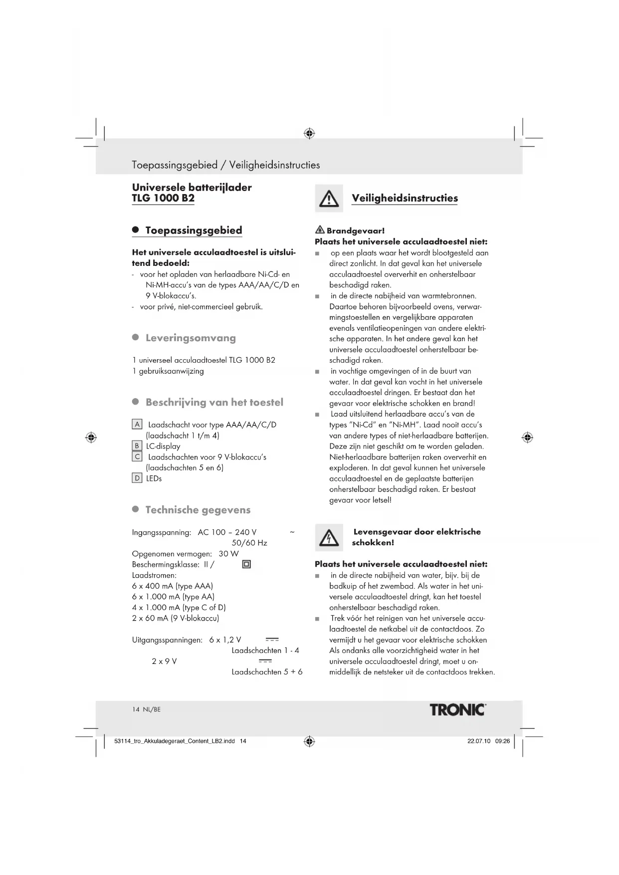 50/60 Hz Opgenomen vermogen: 30 W Beschermingsklasse: II / Laadstromen: 6 x 400 mA (type AAA) 6 x 1.000 mA (type AA) 4 x 1.000 mA (type C of D) 2 x 60 mA (9 V-blokaccu) Uitgangsspanningen: 6 x 1,2 V Laadschachten 1 - 4 2 x 9 V Laadschachten 5 + 6 Veiligheidsinstructies Brandgevaar! Plaats het universele acculaadtoestel niet: J op een plaats waar het wordt blootgesteld aan direct zonlicht. In dat geval kan het universele acculaadtoestel oververhit en onherstelbaar beschadigd raken. J in de directe nabijheid van warmtebronnen. Daartoe behoren bijvoorbeeld ovens, verwar- mingstoestellen en vergelijkbare apparaten evenals ventilatieopeningen van andere elektri- sche apparaten. In het andere geval kan het universele acculaadtoestel onherstelbaar be- schadigd raken. J in vochtige omgevingen of in de buurt van water. In dat geval kan vocht in het universele acculaadtoestel dringen. Er bestaat dan het gevaar voor elektrische schokken en brand! J Laad uitsluitend herlaadbare accu’s van de types “Ni-Cd” en “Ni-MH”. Laad nooit accu’s van andere types of niet-herlaadbare batterijen. Deze zijn niet geschikt om te worden geladen. Niet-herlaadbare batterijen raken oververhit en exploderen. In dat geval kunnen het universele acculaadtoestel en de geplaatste batterijen onherstelbaar beschadigd raken. Er bestaat gevaar voor letsel! Levensgevaar door elektrische schokken! Plaats het universele acculaadtoestel niet: J in de directe nabijheid van water, bijv. bij de badkuip of het zwembad. Als water in het uni- versele acculaadtoestel dringt, kan het toestel onherstelbaar beschadigd raken. J Trek vóór het reinigen van het universele accu- laadtoestel de netkabel uit de contactdoos. Zo vermijdt u het gevaar voor elektrische schokken Als ondanks alle voorzichtigheid water in het universele acculaadtoestel dringt, moet u on- middellijk de netsteker uit de contactdoos trekken. 53114_tro_Akkuladegeraet_Content_LB2.indd 14 22.07.10 09:2615 NL/BE Veiligheidsinstructies / Ingebruikname J Het toestel is alleen geschikt voor gebruik binnenshuis. Gevaar voor letsel! J Bewaar accu’s altijd buiten het bereik van kin- deren! Het gevaar bestaat dat kinderen accu’s inslikken! Vanwege de giftige inhoudsstoffen van de accu’s bestaat levensgevaar! J Houd tijdens het opladen van accu’s altijd toezicht op het universele acculaadtoestel. J De accu’s kunnen heet worden tijdens het laden. Raak nooit hete accu’s aan! Er bestaat dan kans op verbrandingen! Trek vóór het reinigen van het universele acculaadtoestel altijd eerst de netkabel van het universele acculaadtoestel uit de contactdoos. Laat accu’s na het laden eerst afkoelen voordat u ze uit het universele accu- laadtoestel neemt. J Voorkom mogelijke gevaren en laat een defecte netkabel altijd onmiddellijk vervangen door een servicepartner. J Het universele acculaadtoestel bevat geen delen die door de gebruiker kunnen worden onderhouden. Als de behuizing van het univer- sele acculaadtoestel wordt geopend, komt de garantie te vervallen! Wanneer iets gerepareerd moet worden, kunt u de reparatie laten uitvoe- ren door een van onze servicepartners bij u in de buurt. J De fabrikant kan niet aansprakelijk worden gesteld / verleent geen garantie voor schade die ontstaat door het openen van de behuizing, door ongekwalificeerde reparatiepogingen of door ondoelmatig gebruik van het universele laadtoestel. J Met name uit oude accu’s kan batterijzuur lekken. Verwijder daarom alle accu’s uit het universele acculaadtoestel als u het langere tijd niet gebruikt. Zo beschermt u het universele acculaadtoestel tegen schade als gevolg van lekkend accuzuur. J Dit toestel mag niet worden gebruikt door per- sonen (inclusief kinderen) met beperkte fysieke, sensorische of geestelijke vermogens of gebrek- kige ervaring en/of kennis, tenzij een voor hun veiligheid verantwoordelijke persoon toezicht houdt of hun vooraf instructies gegeven heeft voor het gebruik van het product. J Op kinderen dient toezicht te worden gehouden om te voorkomen dat ze met het product spelen.