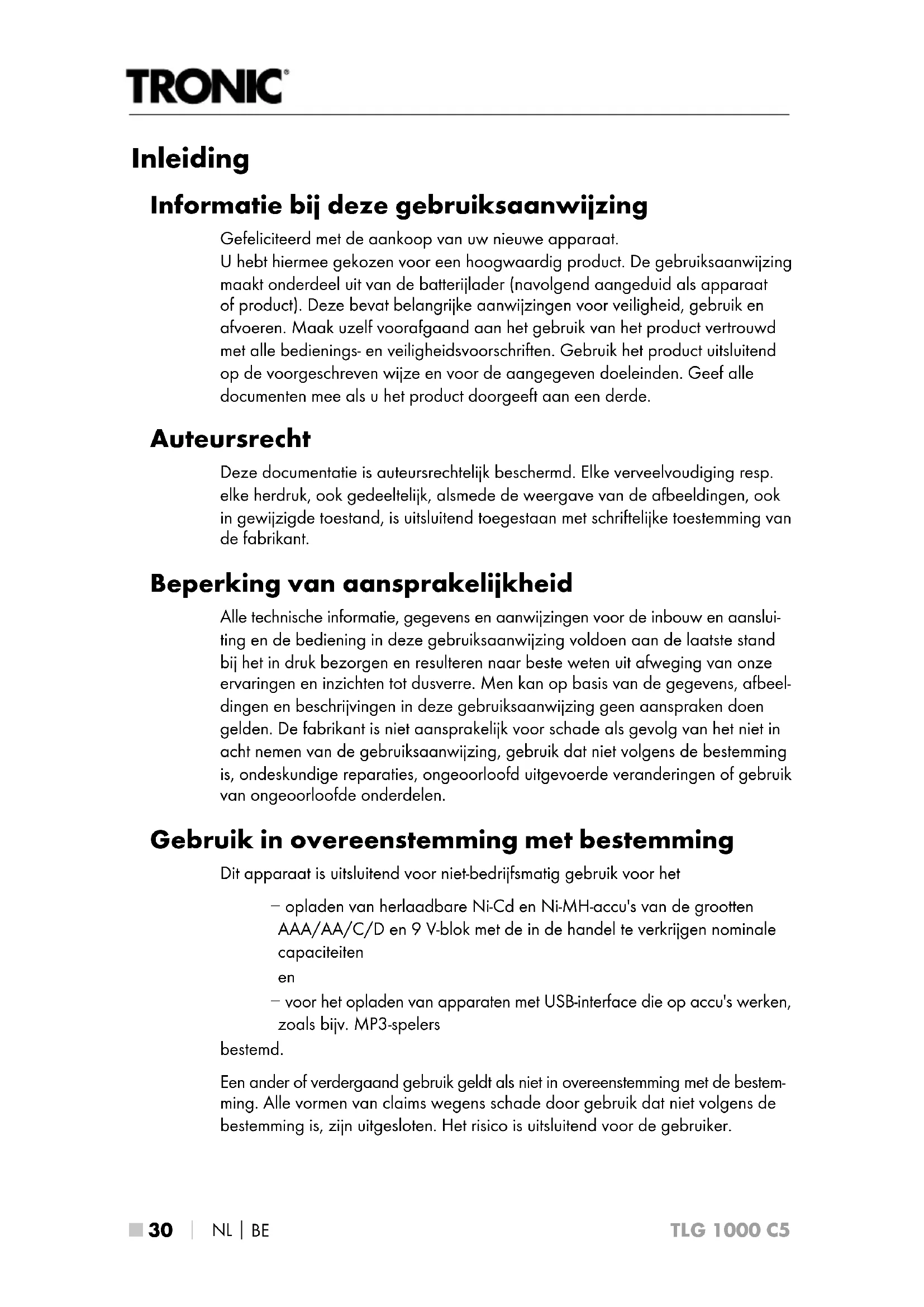 TLG 1000 C5 Inleiding Informatie bij deze gebruiksaanwijzing Gefeliciteerd met de aankoop van uw nieuwe apparaat. U hebt hiermee gekozen voor een hoogwaardig product. De gebruiksaanwijzing maakt onderdeel uit van de batterijlader (navolgend aangeduid als apparaat of product). Deze bevat belangrijke aanwijzingen voor veiligheid, gebruik en afvoeren. Maak uzelf voorafgaand aan het gebruik van het product vertrouwd met alle bedienings- en veiligheidsvoorschriften. Gebruik het product uitsluitend op de voorgeschreven wijze en voor de aangegeven doeleinden. Geef alle documenten mee als u het product doorgeeft aan een derde. Auteursrecht Deze documentatie is auteursrechtelijk beschermd. Elke verveelvoudiging resp. elke herdruk, ook gedeeltelijk, alsmede de weergave van de afbeeldingen, ook in gewijzigde toestand, is uitsluitend toegestaan met schriftelijke toestemming van de fabrikant. Beperking van aansprakelijkheid Alle technische informatie, gegevens en aanwijzingen voor de inbouw en aanslui- ting en de bediening in deze gebruiksaanwijzing voldoen aan de laatste stand bij het in druk bezorgen en resulteren naar beste weten uit afweging van onze ervaringen en inzichten tot dusverre. Men kan op basis van de gegevens, afbeel- dingen en beschrijvingen in deze gebruiksaanwijzing geen aanspraken doen gelden. De fabrikant is niet aansprakelijk voor schade als gevolg van het niet in acht nemen van de gebruiksaanwijzing, gebruik dat niet volgens de bestemming is, ondeskundige reparaties, ongeoorloofd uitgevoerde veranderingen of gebruik van ongeoorloofde onderdelen. Gebruik in overeenstemming met bestemming Dit apparaat is uitsluitend voor niet-bedrijfsmatig gebruik voor het − opladen van herlaadbare Ni-Cd en Ni-MH-accu's van de grootten AAA/AA/C/D en 9 V-blok met de in de handel te verkrijgen nominale capaciteiten