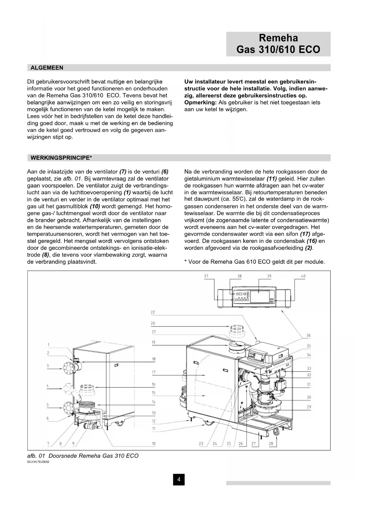 Generalites 12 Principe de fonctionnement 12 Tableau de bord 14 Mise en service 15 Mise a l’arret 15 Purger l’ installation 15 En cas de panne 15 INHALTSVERZEICHNIS Allgemeines 16 Arbeitsprinzip 16 Aufbau des Kesselschaltfeldes 18 So nehmen Sie den Kessel in betrieb 19 So nehmen Sie den Kessel ausser betrieb 19 So entlüften Sie Ihre Heizungsanlage 19 Was ist bei Störungen zu tun? 194 Remeha Gas 310/610 ECO ALGEMEEN Dit gebruikersvoorschrift bevat nuttige en belangrijke informatie voor het goed functioneren en onderhouden van de Remeha Gas 310/610 ECO. Tevens bevat het belangrijke aanwijzingen om een zo veilig en storingsvrij mogelijk functioneren van de ketel mogelijk te maken. Lees vóór het in bedrijfstellen van de ketel deze handlei- ding goed door, maak u met de werking en de bediening van de ketel goed vertrouwd en volg de gegeven aan- wijzingen stipt op. Uw installateur levert meestal een gebruikersin- structie voor de hele installatie. Volg, indien aanwe- zig, allereerst deze gebruikersinstructies op. Opmerking: Als gebruiker is het niet toegestaan iets aan uw ketel te wijzigen. WERKINGSPRINCIPE* Aan de inlaatzijde van de ventilator (7) is de venturi (6) geplaatst, zie afb. 01. Bij warmtevraag zal de ventilator gaan voorspoelen. De ventilator zuigt de verbrandings- lucht aan via de luchttoevoeropening (1) waarbij de lucht in de venturi en verder in de ventilator optimaal met het gas uit het gasmultiblok (10) wordt gemengd. Het homo- gene gas-/ luchtmengsel wordt door de ventilator naar de brander gebracht. Afhankelijk van de instellingen en de heersende watertemperaturen, gemeten door de temperatuursensoren, wordt het vermogen van het toe- stel geregeld. Het mengsel wordt vervolgens ontstoken door de gecombineerde ontstekings- en ionisatie-elek- trode (8), die tevens voor vlambewaking zorgt, waarna de verbranding plaatsvindt. Na de verbranding worden de hete rookgassen door de gietaluminium warmtewisselaar (11) geleid. Hier zullen de rookgassen hun warmte afdragen aan het cv-water in de warmtewisselaar. Bij retourtemperaturen beneden het dauwpunt (ca. 55°), zal de waterdamp in de rook- gassen condenseren in het onderste deel van de warm- tewisselaar. De warmte die bij dit condensatieproces vrijkomt (de zogenaamde latente of condensatiewarmte) wordt eveneens aan het cv-water overgedragen. Het gevormde condenswater wordt via een sifon (17) afge- voerd. De rookgassen keren in de condensbak (16) en worden afgevoerd via de rookgasafvoerleiding (2).