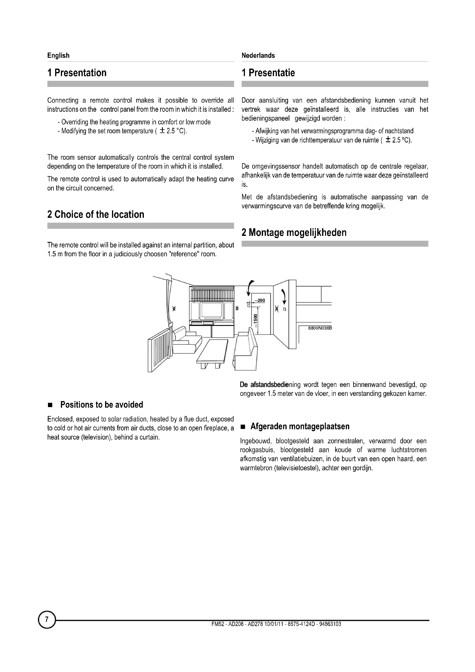 Under no circumstances must sensor cables (very low voltage) be placed in cable ducts or channels carrying cables supplying 230 V. Furthermore, a minimum distance of 10 cm should be kept between cables supplying very low voltage and cables supplying 230 V.10 10/01/11 - 8575-4124D - 94863103 FM52 - AD208 - AD278Nederlands 5 Beschrijving Instelling van de temperatuur Met de instelknop kan de richtwaarde van de "dag"-temperatuurtussen 0 en ± 2.5 °C gevarieerd worden. Deze temperatuur wordt ingesteld bij de centrale regelaar, wat neerkomt op het merkteken "_" (middenpositie).Draai voor het verhogen van de kamertemperatuur de knop naar