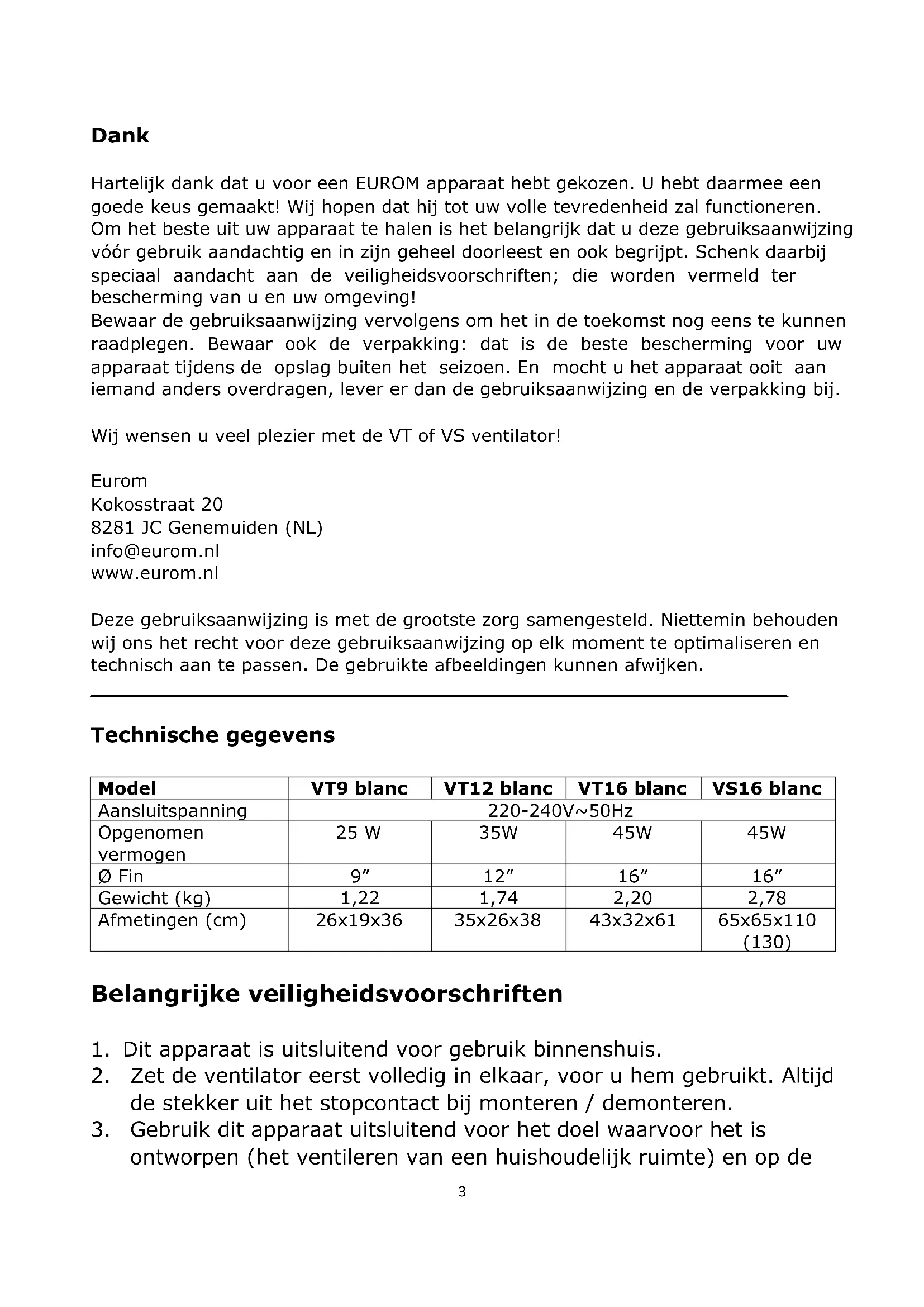 vast met de fixatiebout. Werking De ventilatoren kunnen op verschillende snelheden draaien: de VT9 blanc op twee standen, de VT12 blanc, VT16 blanc en VS16 blanc op drie standen. Alle types zijn voorzien van een zwenkfunctie (45°). Wanneer: - de ventilator volledig in elkaar is gezet - alle verbindingen stevig vastgedraaid zitten - alle veiligheidsvoorschriften in acht genomen zijn kunt u de ventilator in gebruik nemen: Steek de stekker in het stopcontact Kies vermogen: 0=uit, 1=standaard, 2=sterk en 3=extra sterk. De ventilator zal nu zijn werking starten. Druk indien gewenst de zwenkknop bovenop de motor in: de ventilator zal nu in een hoek van 45° gaan zwenken. Door deze knop weer uit te trekken schakelt u de zwenkfunctie (of: oscillatie) weer uit. Om de ventilator wat meer naar boven of beneden te laten blazen kunt u het motorblokje met de ventilator wat naar boven of beneden bijstellen t.o.v. de voet. Voor u dat doet eerst de ventilator uitschakelen en de stekker uit het stopcontact nemen! Om de ventilator uit te schakelen drukt u op de 0-knop. Wanneer u de werking langer dan enkele minuten wilt onderbreken dient u ook de stekker uit het stopcontact te nemen. Schoonmaak en onderhoud Schakel de ventilator uit en neem de stekker uit het stopcontact wanneer u hem wilt reinigen of onderhoud wilt uitvoeren. De ventilator vraag alleen wat algemeen, uitwendig onderhoud. Stof hem regelmatig af met een zachte doek of plumeau of zuig hem schoon met een zacht stofzuigerborsteltje. Is hij erg vuil, open dan het voorste rooster en neem roosters en bladen af met een licht-bevochtigde doek met een zacht huishoudelijk reinigingsmiddel. Droog alles goed na, laat de ventilator goed drogen en zet hem weer volledig in elkaar voor u hem weer in gebruik neemt. Zorg ervoor dat er geen water op andere delen dan rooster en bladen terechtkomt! Spoel of spuit de ventilator nooit af! Gebruik geen sprays. Om verkleuring of vervormingen van het materiaal te voorkomen nooit agressieve of bijtende (schoonmaak)middelen gebruiken.9 Wanneer u de ventilator aan het eind van het seizoen wilt opruimen, doe dat dan in de originele verpakking: die biedt de beste bescherming. Ruim hem weg op een veilige, droge, niet extreem warme of koude plaats. Problemen en oplossingen Het ventilatorblad draait niet terwijl de ventilator aangezet is Zit de stekker wel goed in het stopcontact? Staat er wel stroom op het stopcontact? Is knop 1, 2 of 3 ingedrukt? Wordt het blad niet ergens geblokkeerd, bijv. door een beschadiging, een vervorming van het beschermrooster of een vreemd voorwerp? Er doet zich een abnormaal geluid voor bij het opstarten Controleer of de ventilatorbladen zo ver mogelijk over de motor-as zijn geplaatst. Controleer of er zich wellicht fijne braampjes rond het vinnenblad bevinden. Controleer of het vinnenblad misschien een vervorming van het beschermrooster raakt. Waarschuwing: Reparaties dienen door daarvoor opgeleide monteurs te worden uitgevoerd. Dat geldt ook voor vervanging of reparatie van de elektrokabel en de stekker. Vraag bij reparatie altijd om originele onderdelen. In het apparaat aangebrachte wijzigingen en ondeskundig uitgevoerde reparaties doen de garantie en de aansprakelijkheid van leverancier, importeur en fabrikant vervallen. Verwijdering Binnen de EU betekent dit symbool dat dit product niet met het normale huishoudelijke afval mag worden afgevoerd. Afgedankte apparaten bevatten waardevolle materialen die hergebruikt kunnen en moeten worden, om het milieu en de gezondheid niet te schaden door ongereguleerde afvalinzameling. Breng afgedankte apparatuur daarom naar een daarvoor aangewezen inzamelpunt of wend u tot het bedrijf waar u het apparaat gekocht hebt. Zij kunnen er voor zorgen dat zoveel mogelijk onderdelen van het apparaat hergebruikt worden. CE - verklaring Zie pagina 46.10 Thank you Thank you very much for choosing for a EUROM device. You have made a good choice! We hope you will be satisfied about its functioning. To get maximum profit from your product, it is important to read this manual attentive and totally before use, and to understand what is written. Read especially the safety instructions: they are there to protect you and your environment. Keep the manual in a safe place for future reference. Store also the package: that is the best protection for your product in times of no-use. And if you at any time pass the appliance on, pass on the manual and package too. We wish you a lot of fun with the VT or VS Ventilator! Eurom Kokosstraat 20 8281 JC Genemuiden (NL) info@eurom.nl www.eurom.nl This manual has been complied with the utmost care. Nevertheless, we reserve the right to optimize this manual at any time and to adjust it technically. The image used may differ.