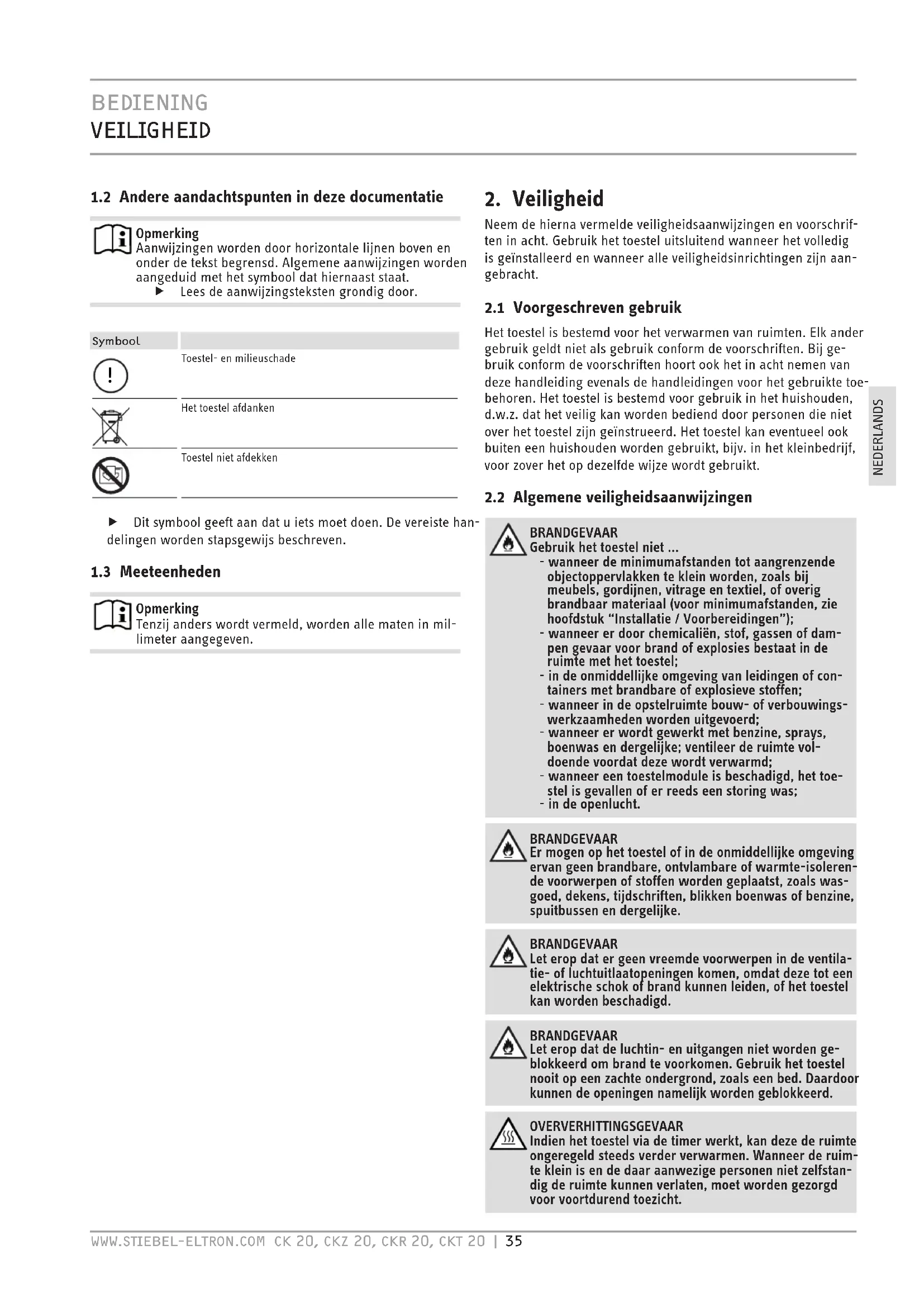 Controleer de ingestelde temperatuur op het toestel en de zekering van de huisinstallatie, wanneer het toestel niet verwarmt. Het toestel heeft een veiligheidsthermostaat die het toestel bij oververhitting uitschakelt. Na het verhelpen van de oorzaak (bij- voorbeeld afgedekte luchtuitlaat- of -inlaatopening) wordt het toestel na een afkoeltijd van enkele minuten weer ingeschakeld. Als u de oorzaak zelf niet kunt verhelpen, waarschuwt u de in- stallateur. Om u nog sneller en beter te kunnen helpen, deelt u hem het nummer op het typeplaatje mee (000000-0000-000000).NEDERLANDSWWW.stieBel-eltRon.coM cK 20, cKz 20, cKR 20, cKt 20 | 39 installatie Veiligheid installatie