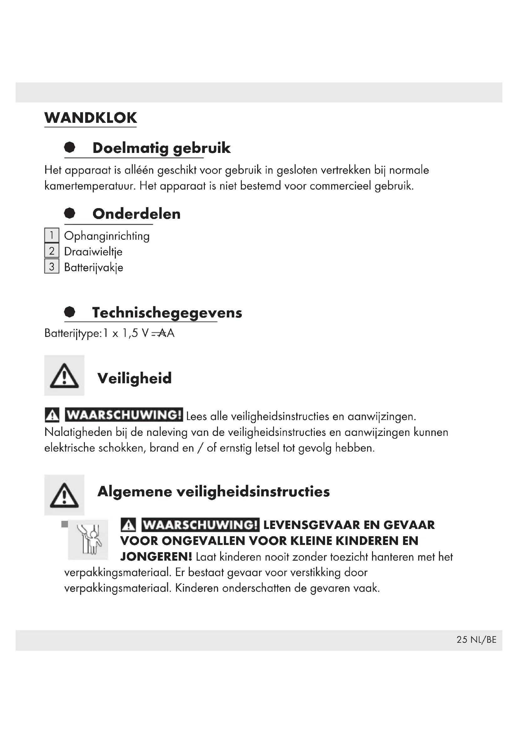 totdat de wijzers zich in de gewenste positie bevinden (zie fig. B). § Reiniging en onderhoud Reinig het apparaat alleen aan de buitenzijde met een zachte, droge doek. Verwijder de batterij als u de wandklok niet gebruikt.28 NL/BE § Verwijdering De verpakking bestaat uit milieuvriendelijke grondstoffen die U via de plaatselijke recyclecontainers kunt afvoeren. Informatie over de mogelijkheden om het uitgediende artikel na gebruik af te voeren, verstrekt uw gemeentelijke overheid. Gooi het produkt als U het niet meer gebruikt met het oog op milieu- bescherming niet bij het huisvuil, maar verwijder het deskundig. Over afgifteplaatsen en hun openingstijden kunt U zich bij uw aangewezen instantie informeren. Defecte of verbruikte batterijen moeten volgens de richtlijn 2006 / 66 / EC worden gerecycled. Geef batterijen en / of het apparaat af bij de daarvoor bestemde verzamelstations. Milieuschade door verkeerde afvoer van batterijen! Batterijen mogen niet via het huisafval worden afgevoerd. Ze kunnen giftig zwaar metaal bevatten en moeten worden behandeld als gevaarlijk afval. De chemische symbolen van de zware metalen zijn als volgt: Cd = cadmium, Hg = kwikzilver, Pb = lood. Geef verbruikte batterijen daarom af bij een gemeentelijk inzamelpunt.29 DE/AT/CH WANDUHR § Bestimmungsgemäße Verwendung Das Gerät ist nur für den Betrieb in geschlossenen Räumen bei normaler Zimmertemperatur geeignet. Das Gerät ist nicht für den gewerblichen Einsatz bestimmt. § Teilebeschreibung
