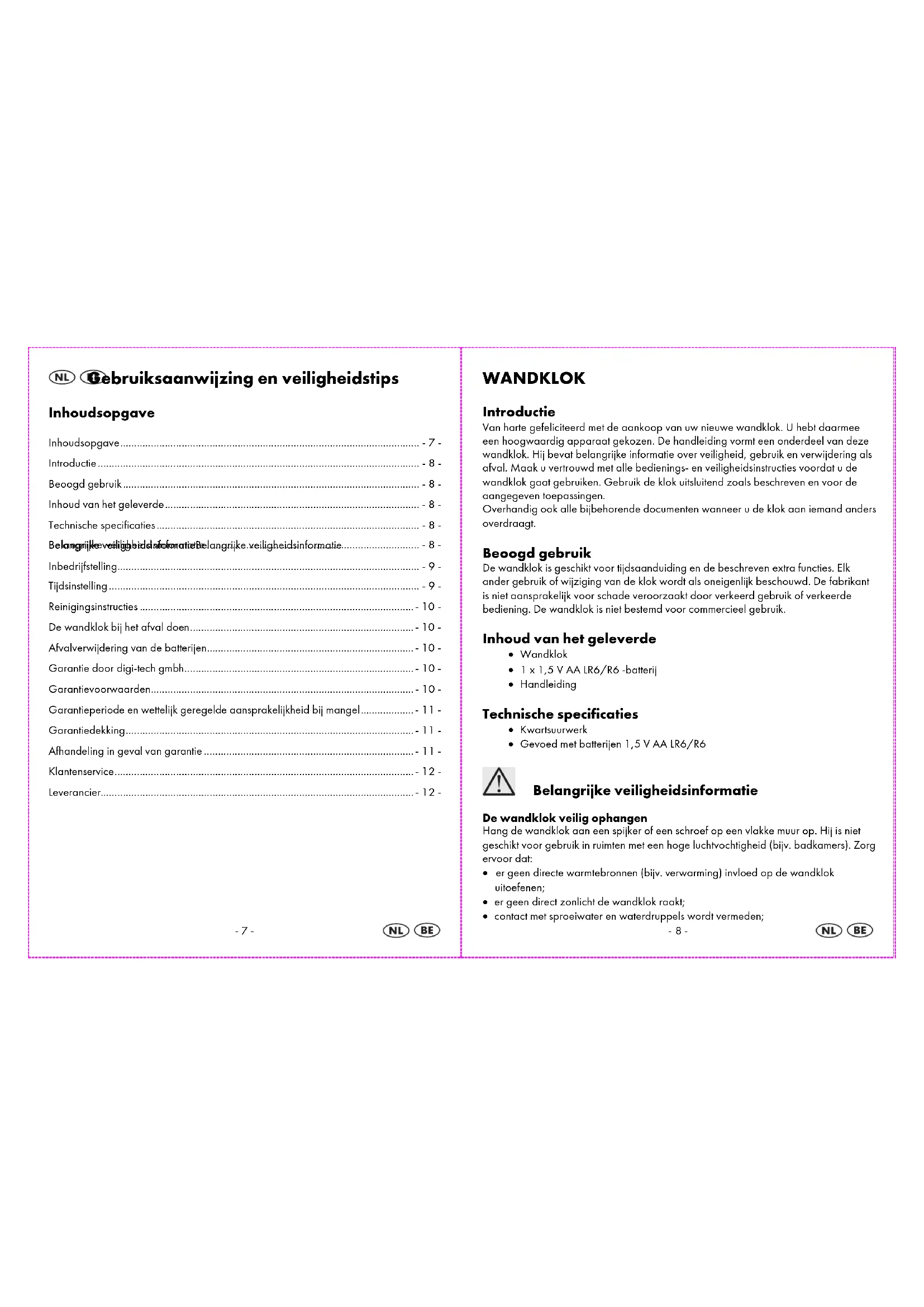 Reinigingsinstructies Reinig de wandklok met een droge, niet-pluizende doek, zoals gebruikt voor brillenglazen. De wandklok bij het afval doen Deze wandklok kan niet met het normale huisvuil worden weggegooid. Breng de wandklok naar een erkend afvalverwerkingsbedrijf of de gemeentereiniging. Neem de op dat moment geldende voorschriften in acht. Neem in geval van twijfel contact op met uw afvalverwijderingsbedrijf. Afvalverwijdering van de batterijen Deponeer de batterijen in de extra hiervoor opgestelde boxen e.d. Batterijen mogen niet in het gewone huisvuil. De afvoer van batterijen mag alleen via een erkend vuilverwerkingsbedrijf of milieu instelling worden doorgevoerd. Let ook op geldende voorschriften. In geval van twijfel contacteert u a.u.b. het betreffende bedrijf. Garantie door digi-tech gmbh U krijgt op deze wandklok 3 jaar garantie vanaf de datum van aankoop. In het geval dat deze wandklok gebreken vertoont, kunt u tegenover de verkoper van het product aanspraak maken op uw wettelijke rechten. Deze wettelijke rechten worden niet beïnvloed door onze hieronder weergegeven garantie. Garantievoorwaarden De garantieperiode begint op de datum van aankoop. Bewaar uw originele aankoopbon. Deze is nodig als bewijs van aankoop. Treedt binnen drie jaar na de datum van aankoop van deze wandklok een materiaal- of fabrikagefout op, dan wordt de wandklok door ons – naar eigen goeddunken - gratis gerepareerd of vervangen. Deze garantie vereist dat binnen de periode van drie jaar de defecte wandklok en het bewijs van aankoop (kassabon) worden overlegd en er schriftelijk kort wordt aangegeven waaruit het gebrek bestaat en wanneer het is opgetreden. Als het defect door onze garantie wordt gedekt, krijgt u een gerepareerde of nieuwe wandklok terug. Met de reparatie of vervanging van het product begint geen nieuwe garantieperiode.-