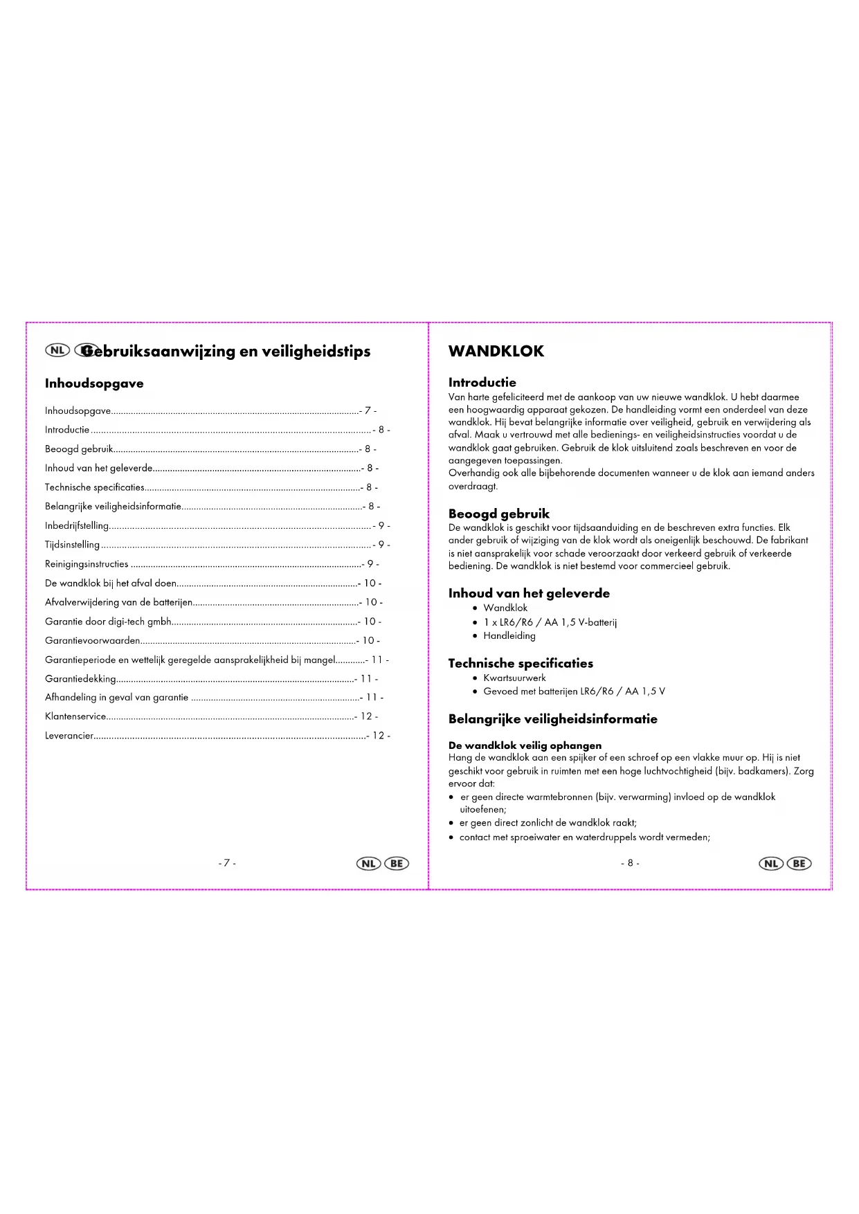 De wandklok bij het afval doen Deze wandklok kan niet met het normale huisvuil worden weggegooid. Breng de wandklok naar een erkend afvalverwerkingsbedrijf of de gemeentereiniging. Neem de op dat moment geldende voorschriften in acht. Neem in geval van twijfel contact op met uw afvalverwijderingsbedrijf. Afvalverwijdering van de batterijen Deponeer de batterijen in de extra hiervoor opgestelde boxen e.d. Batterijen mogen niet in het gewone huisvuil. De afvoer van batterijen mag alleen via een erkend vuilverwerkingsbedrijf of milieu instelling worden doorgevoerd. Let ook op geldende voorschriften. In geval van twijfel contacteert u a.u.b. het betreffende bedrijf. Garantie door digi-tech gmbh U krijgt op deze wandklok 3 jaar garantie vanaf de datum van aankoop. In het geval dat deze wandklok gebreken vertoont, kunt u tegenover de verkoper van het product aanspraak maken op uw wettelijke rechten. Deze wettelijke rechten worden niet beïnvloed door onze hieronder weergegeven garantie. Garantievoorwaarden De garantieperiode begint op de datum van aankoop. Bewaar uw originele aankoopbon. Deze is nodig als bewijs van aankoop. Treedt binnen drie jaar na de datum van aankoop van deze wandklok een materiaal- of fabrikagefout op, dan wordt de wandklok door ons – naar eigen goeddunken - gratis gerepareerd of vervangen. Deze garantie vereist dat binnen de periode van drie jaar de defecte wandklok en het bewijs van aankoop (kassabon) worden overlegd en er schriftelijk kort wordt aangegeven waaruit het gebrek bestaat en wanneer het is opgetreden. Als het defect door onze garantie wordt gedekt, krijgt u een gerepareerde of nieuwe wandklok terug. Met de reparatie of vervanging van het product begint geen nieuwe garantieperiode.-