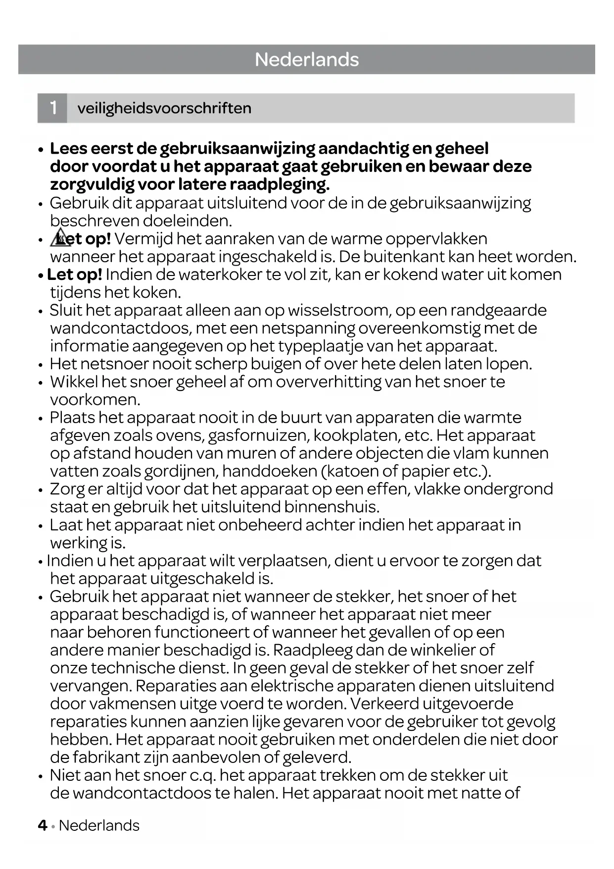 - Niet aan het snoer c.q. het apparaat trekken om de stekker uit de wandcontactdoos te halen. Het apparaat nooit met natte of Nederlands veiligheidsvoorschriften