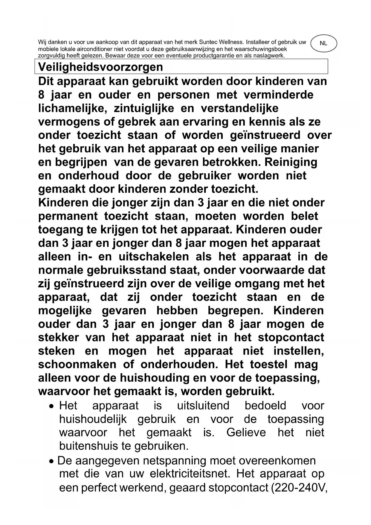 IMPULS Eco R290 SUNTEC WELLNESS GMBH / HOLZSTRASSE 2 / 40 221 DÜSSELDORF / GERMANIANL Wij danken u voor uw aankoop van dit apparaat van het merk Suntec Wellness. Installeer of gebruik uw mobiele lokale airconditioner niet voordat u deze gebruiksaanwijzing en het waarschuwingsboek zorgvuldig heeft gelezen. Bewaar deze voor een eventuele productgarantie en als naslagwerk. Veiligheidsvoorzorgen Dit apparaat kan gebruikt worden door kinderen van 8 jaar en ouder en personen met verminderde lichamelijke, zintuiglijke en verstandelijke vermogens of gebrek aan ervaring en kennis als ze onder toezicht staan of worden geïnstrueerd over het gebruik van het apparaat op een veilige manier en begrijpen van de gevaren betrokken. Reiniging en onderhoud door de gebruiker worden niet gemaakt door kinderen zonder toezicht. Kinderen die jonger zijn dan 3 jaar en die niet onder permanent toezicht staan, moeten worden belet toegang te krijgen tot het apparaat. Kinderen ouder dan 3 jaar en jonger dan 8 jaar mogen het apparaat alleen in- en uitschakelen als het apparaat in de normale gebruiksstand staat, onder voorwaarde dat zij geïnstrueerd zijn over de veilige omgang met het apparaat, dat zij onder toezicht staan en de mogelijke gevaren hebben begrepen. Kinderen ouder dan 3 jaar en jonger dan 8 jaar mogen de stekker van het apparaat niet in het stopcontact steken en mogen het apparaat niet instellen, schoonmaken of onderhouden. Het toestel mag alleen voor de huishouding en voor de toepassing, waarvoor het gemaakt is, worden gebruikt.