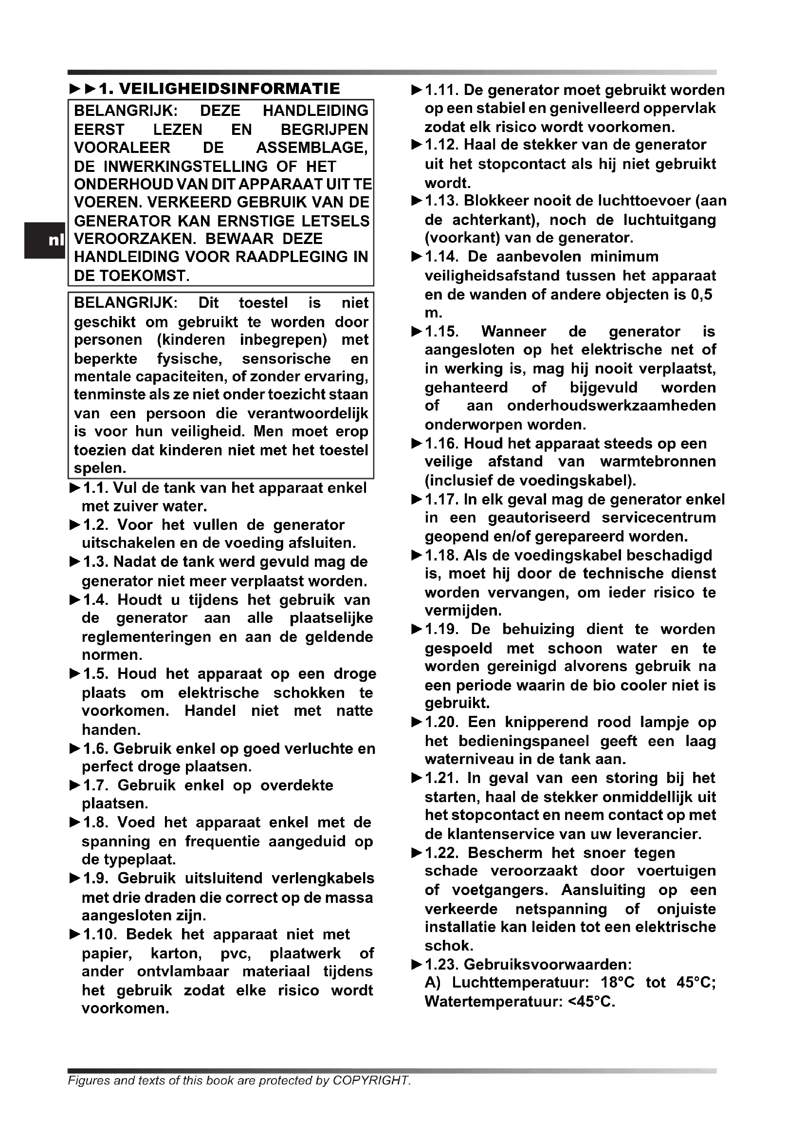 DE TOEKOMST. BELANGRIJK: Dit toestel is niet geschikt om gebruikt te worden door personen (kinderen inbegrepen) met beperkte fysische, sensorische en mentale capaciteiten, of zonder ervaring, tenminste als ze niet onder toezicht staan van een persoon die verantwoordelijk is voor hun veiligheid. Men moet erop toezien dat kinderen niet met het toestel spelen. ►1.1. Vul de tank van het apparaat enkel met zuiver water. ►1.2. Voor het vullen de generator uitschakelen en de voeding afsluiten. ►1.3. Nadat de tank werd gevuld mag de generator niet meer verplaatst worden. ►1.4. Houdt u tijdens het gebruik van de generator aan alle plaatselijke reglementeringen en aan de geldende normen. ►1.5. Houd het apparaat op een droge plaats om elektrische schokken te voorkomen. Handel niet met natte handen. ►1.6. Gebruik enkel op goed verluchte en perfect droge plaatsen. ►1.7. Gebruik enkel op overdekte plaatsen. ►1.8. Voed het apparaat enkel met de spanning en frequentie aangeduid op de typeplaat. ►1.9. Gebruik uitsluitend verlengkabels met drie draden die correct op de massa aangesloten zijn. ►1.10. Bedek het apparaat niet met papier, karton, pvc, plaatwerk of ander ontvlambaar materiaal tijdens het gebruik zodat elke risico wordt voorkomen. ►1.11. De generator moet gebruikt worden op een stabiel en genivelleerd oppervlak zodat elk risico wordt voorkomen. ►1.12. Haal de stekker van de generator uit het stopcontact als hij niet gebruikt wordt. ►1.13. Blokkeer nooit de luchttoevoer (aan de achterkant), noch de luchtuitgang (voorkant) van de generator. ►1.14. De aanbevolen minimum veiligheidsafstand tussen het apparaat en de wanden of andere objecten is 0,5