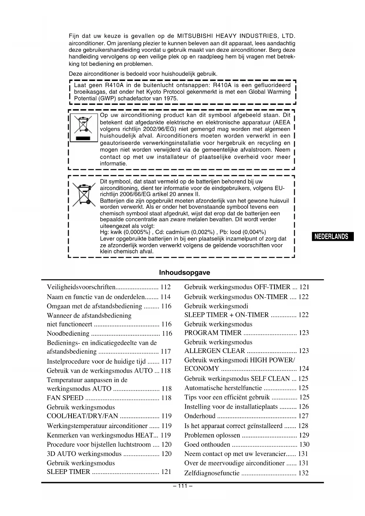 - Fijn dat uw keuze is gevallen op de MITSUBISHI HEAVY INDUSTRIES, LTD. airconditioner. Om jarenlang plezier te kunnen beleven aan dit apparaat, lees aandachtig deze gebruikershandleiding voordat u gebruik maakt van deze airconditioner. Berg deze handleiding vervolgens op een veilige plek op en raadpleeg hem bij vragen met betrek- king tot bediening en problemen. Deze airconditioner is bedoeld voor huishoudelijk gebruik. Inhoudsopgave Laat geen R410A in de buitenlucht ontsnappen: R410A is een gefluorideerd broeikasgas, dat onder het Kyoto Protocol gekenmerkt is met een Global Warming Potential (GWP) schadefactor van 1975. NEDERLANDS Veiligheidsvoorschriften p. 112