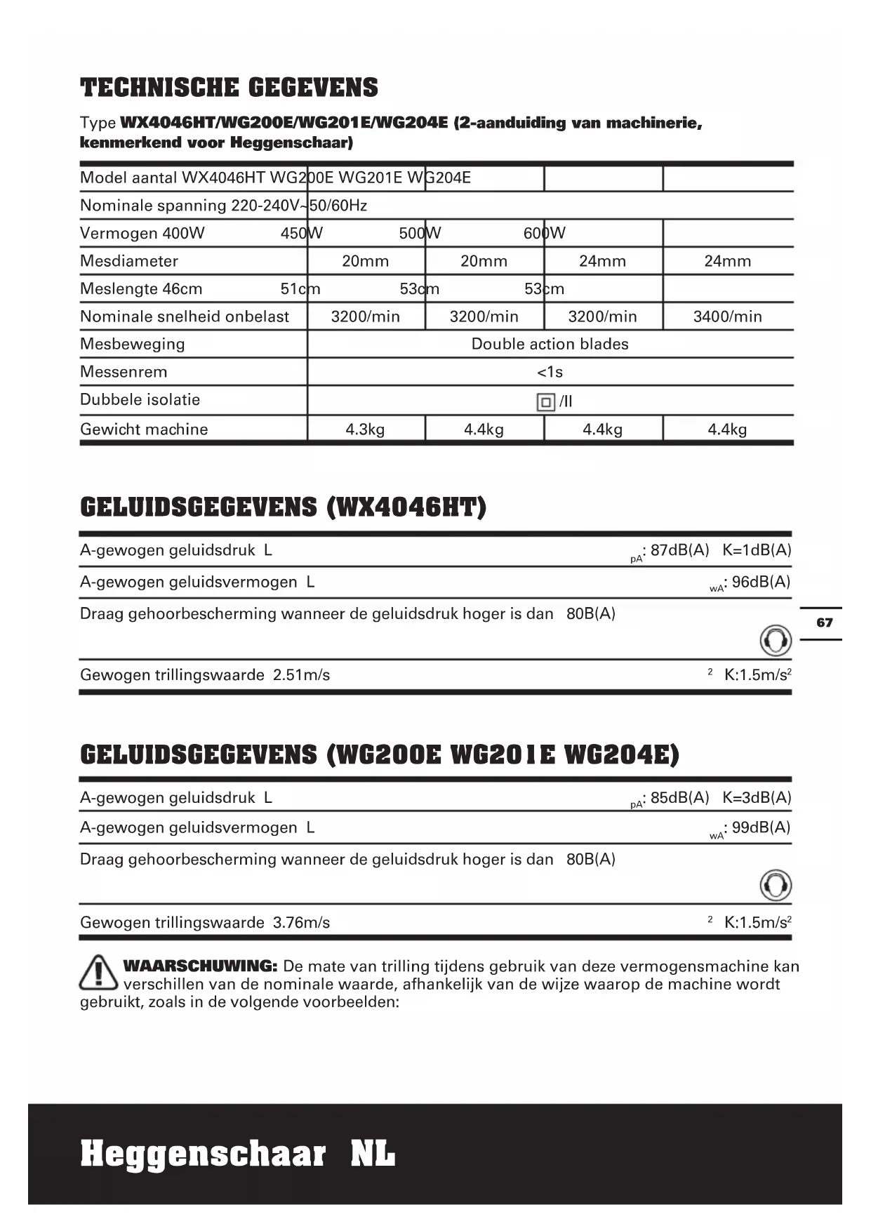 WAARSCHUWING: De mate van trilling tijdens gebruik van deze vermogensmachine kan verschillen van de nominale waarde, afhankelijk van de wijze waarop de machine wordt gebruikt, zoals in de volgende voorbeelden: Model aantal WX4046HT WG200E WG201E WG204E Nominale spanning 220-240V~50/60Hz Vermogen 400W 450W 500W 600W Mesdiameter 20mm 20mm 24mm 24mm Meslengte 46cm 51cm 53cm 53cm Nominale snelheid onbelast 3200/min 3200/min 3200/min 3400/min Mesbeweging Double action blades Messenrem <1s Dubbele isolatie /II Gewicht machine 4.3kg 4.4kg 4.4kg 4.4kgHeggenschaar NL