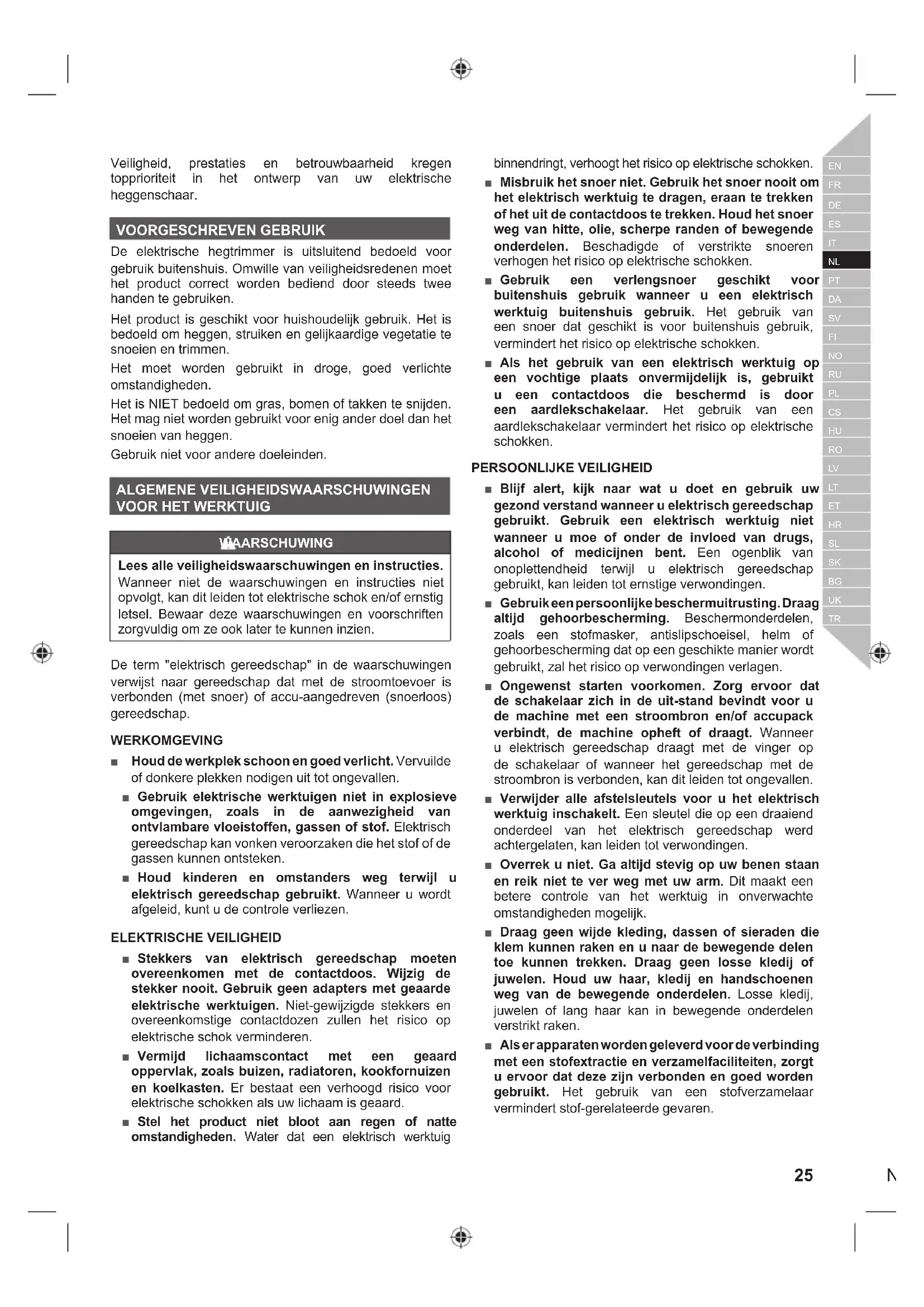 Veiligheid, prestaties en betrouwbaarheid kregen topprioriteit in het ontwerp van uw elektrische heggenschaar. VOORGESCHREVEN GEBRUIK De elektrische hegtrimmer is uitsluitend bedoeld voor gebruik buitenshuis. Omwille van veiligheidsredenen moet het product correct worden bediend door steeds twee handen te gebruiken. Het product is geschikt voor huishoudelijk gebruik. Het is bedoeld om heggen, struiken en gelijkaardige vegetatie te snoeien en trimmen. Het moet worden gebruikt in droge, goed verlichte omstandigheden. Het is NIET bedoeld om gras, bomen of takken te snijden. Het mag niet worden gebruikt voor enig ander doel dan het snoeien van heggen. Gebruik niet voor andere doeleinden. ALGEMENE VEILIGHEIDSWAARSCHUWINGEN