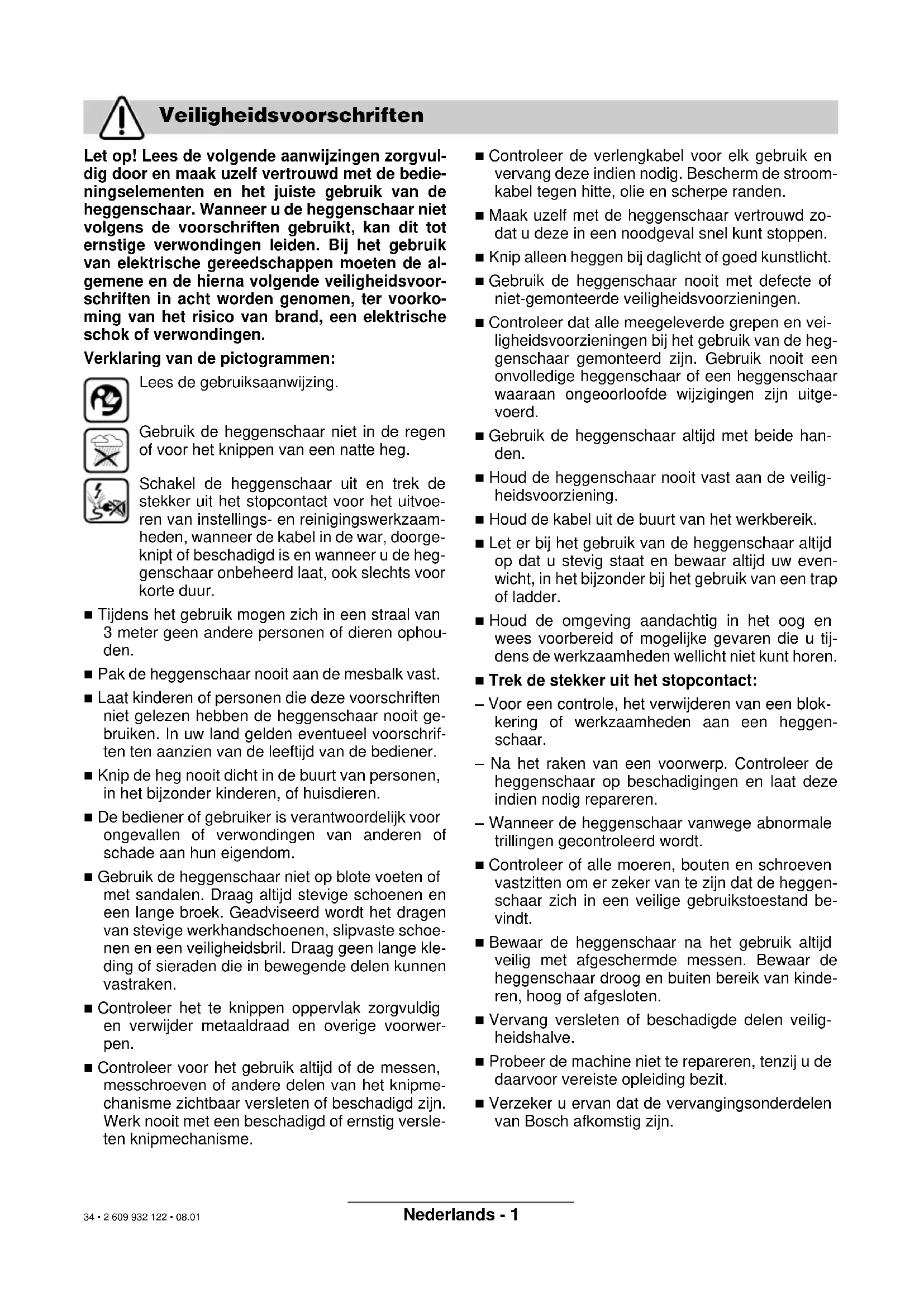 ga- rantito è minore di 96 dB (A) AHS 40/48/55/60/65, 98 dB (A) AHS 6000/7000. Procedimento di valuta- zione della conformità secondo appendice V. Leinfelden, 01.08.2001. Dr. Gerhard Felten Dr. Eckerhard Strötgen Robert Bosch GmbH, Geschäftsbereich Elektrowerkzeuge Con riserva di modifiche Garanzia Misure ecologiche Servizio post-vendita Dichiarazione di conformità 33 • 2 609 932 122 • 08.01Nederlands - 1 Let op! Lees de volgende aanwijzingen zorgvul- dig door en maak uzelf vertrouwd met de bedie- ningselementen en het juiste gebruik van de heggenschaar. Wanneer u de heggenschaar niet volgens de voorschriften gebruikt, kan dit tot ernstige verwondingen leiden. Bij het gebruik van elektrische gereedschappen moeten de al- gemene en de hierna volgende veiligheidsvoor- schriften in acht worden genomen, ter voorko- ming van het risico van brand, een elektrische schok of verwondingen. Verklaring van de pictogrammen: Lees de gebruiksaanwijzing. Gebruik de heggenschaar niet in de regen of voor het knippen van een natte heg. Schakel de heggenschaar uit en trek de stekker uit het stopcontact voor het uitvoe- ren van instellings- en reinigingswerkzaam- heden, wanneer de kabel in de war, doorge- knipt of beschadigd is en wanneer u de heg- genschaar onbeheerd laat, ook slechts voor korte duur. ■ Tijdens het gebruik mogen zich in een straal van 3 meter geen andere personen of dieren ophou- den. ■ Pak de heggenschaar nooit aan de mesbalk vast. ■ Laat kinderen of personen die deze voorschriften niet gelezen hebben de heggenschaar nooit ge- bruiken. In uw land gelden eventueel voorschrif- ten ten aanzien van de leeftijd van de bediener. ■ Knip de heg nooit dicht in de buurt van personen, in het bijzonder kinderen, of huisdieren. ■ De bediener of gebruiker is verantwoordelijk voor ongevallen of verwondingen van anderen of schade aan hun eigendom. ■ Gebruik de heggenschaar niet op blote voeten of met sandalen. Draag altijd stevige schoenen en een lange broek. Geadviseerd wordt het dragen van stevige werkhandschoenen, slipvaste schoe- nen en een veiligheidsbril. Draag geen lange kle- ding of sieraden die in bewegende delen kunnen vastraken. ■ Controleer het te knippen oppervlak zorgvuldig en verwijder metaaldraad en overige voorwer- pen. ■ Controleer voor het gebruik altijd of de messen, messchroeven of andere delen van het knipme- chanisme zichtbaar versleten of beschadigd zijn. Werk nooit met een beschadigd of ernstig versle- ten knipmechanisme. ■ Controleer de verlengkabel voor elk gebruik en vervang deze indien nodig. Bescherm de stroom- kabel tegen hitte, olie en scherpe randen. ■ Maak uzelf met de heggenschaar vertrouwd zo- dat u deze in een noodgeval snel kunt stoppen. ■ Knip alleen heggen bij daglicht of goed kunstlicht. ■ Gebruik de heggenschaar nooit met defecte of niet-gemonteerde veiligheidsvoorzieningen. ■ Controleer dat alle meegeleverde grepen en vei- ligheidsvoorzieningen bij het gebruik van de heg- genschaar gemonteerd zijn. Gebruik nooit een onvolledige heggenschaar of een heggenschaar waaraan ongeoorloofde wijzigingen zijn uitge- voerd. ■ Gebruik de heggenschaar altijd met beide han- den. ■ Houd de heggenschaar nooit vast aan de veilig- heidsvoorziening. ■ Houd de kabel uit de buurt van het werkbereik. ■ Let er bij het gebruik van de heggenschaar altijd op dat u stevig staat en bewaar altijd uw even- wicht, in het bijzonder bij het gebruik van een trap of ladder. ■ Houd de omgeving aandachtig in het oog en wees voorbereid of mogelijke gevaren die u tij- dens de werkzaamheden wellicht niet kunt horen. ■ Trek de stekker uit het stopcontact: – Voor een controle, het verwijderen van een blok- kering of werkzaamheden aan een heggen- schaar. – Na het raken van een voorwerp. Controleer de heggenschaar op beschadigingen en laat deze indien nodig repareren. – Wanneer de heggenschaar vanwege abnormale trillingen gecontroleerd wordt. ■ Controleer of alle moeren, bouten en schroeven vastzitten om er zeker van te zijn dat de heggen- schaar zich in een veilige gebruikstoestand be- vindt. ■ Bewaar de heggenschaar na het gebruik altijd veilig met afgeschermde messen. Bewaar de heggenschaar droog en buiten bereik van kinde- ren, hoog of afgesloten. ■ Vervang versleten of beschadigde delen veilig- heidshalve. ■ Probeer de machine niet te repareren, tenzij u de daarvoor vereiste opleiding bezit. ■ Verzeker u ervan dat de vervangingsonderdelen van Bosch afkomstig zijn. Veiligheidsvoorschriften 34 • 2 609 932 122 • 08.01Nederlands - 2 Heggenschaar AHS 40 - 24 AHS 48 - 24 AHS 55 - 24S AHS 60 - 24S Bestelnummer 0 600 845 0.. 0 600 845 1.. 0 600 845 2.. 0 600 845 4.. Opgenomen vermogen 500 W 500 W 550 W 550 W Onbelast aantal knipbewegingen 1400 min