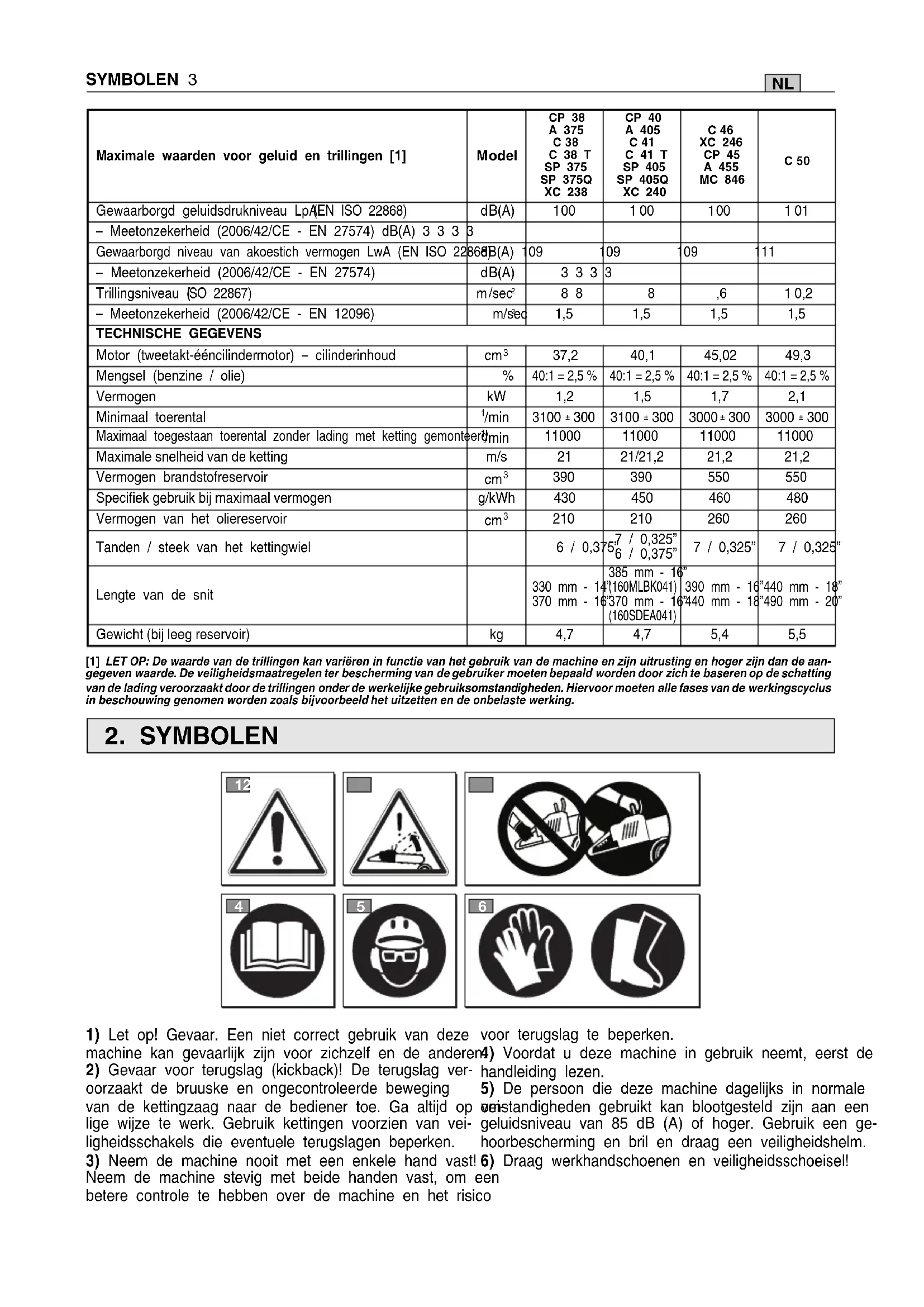 Tanden / steek van het kettingwiel 6 / 0,375” 7 / 0,325” 6 / 0,375” 7 / 0,325” 7 / 0,325” Lengte van de snit 330 mm - 14” 370 mm - 16” 385 mm - 16” (160MLBK041) 370 mm - 16” (160SDEA041) 390 mm - 16” 440 mm - 18” 440 mm - 18” 490 mm - 20” Gewicht (bij leeg reservoir) kg 4,7 4,7 5,4 5,5 [1] LET OP: De waarde van de trillingen kan variëren in functie van het gebruik van de machine en zijn uitrusting en hoger zijn dan de aan- gegeven waarde. De veiligheidsmaatregelen ter bescherming van de gebruiker moeten bepaald worden door zich te baseren op de schatting van de lading veroorzaakt door de trillingen onder de werkelijke gebruiksomstandigheden. Hiervoor moeten alle fases van de werkingscyclus in beschouwing genomen worden zoals bijvoorbeeld het uitzetten en de onbelaste werking.NL
