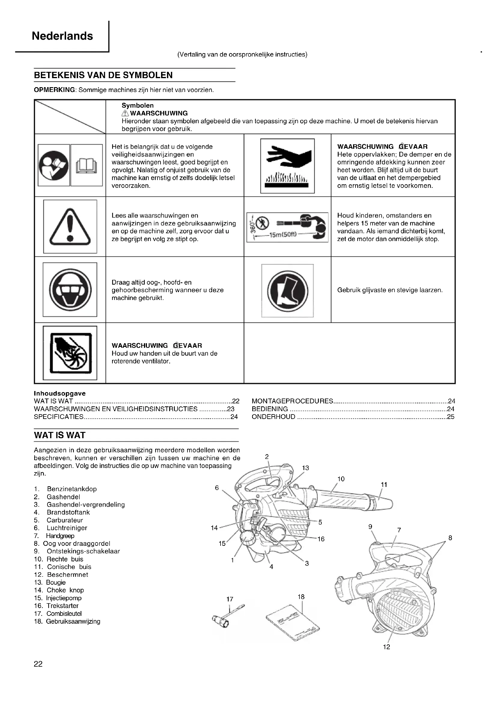 OPMERKING: Sommige machines zijn hier niet van voorzien. Symbolen WAARSCHUWING Hieronder staan symbolen afgebeeld die van toepassing zijn op deze machine. U moet de betekenis hiervan begrijpen voor gebruik. Het is belangrijk dat u de volgende veiligheidsaanwijzingen en waarschuwingen leest, goed begrijpt en opvolgt. Nalatig of onjuist gebruik van de machine kan ernstig of zelfs dodelijk letsel veroorzaken. WAARSCHUWING GEVAAR Hete oppervlakken; De demper en de omringende afdekking kunnen zeer heet worden. Blijf altijd uit de buurt van de uitlaat en het dempergebied om ernstig letsel te voorkomen. Lees alle waarschuwingen en aanwijzingen in deze gebruiksaanwijzing en op de machine zelf, zorg ervoor dat u ze begrijpt en volg ze stipt op. Houd kinderen, omstanders en helpers 15 meter van de machine vandaan. Als iemand dichterbij komt, zet de motor dan onmiddellijk stop. Draag altijd oog-, hoofd- en gehoorbescherming wanneer u deze machine gebruikt. Gebruik glijvaste en stevige laarzen. WAARSCHUWING GEVAAR Houd uw handen uit de buurt van de roterende ventilator. Inhoudsopgave