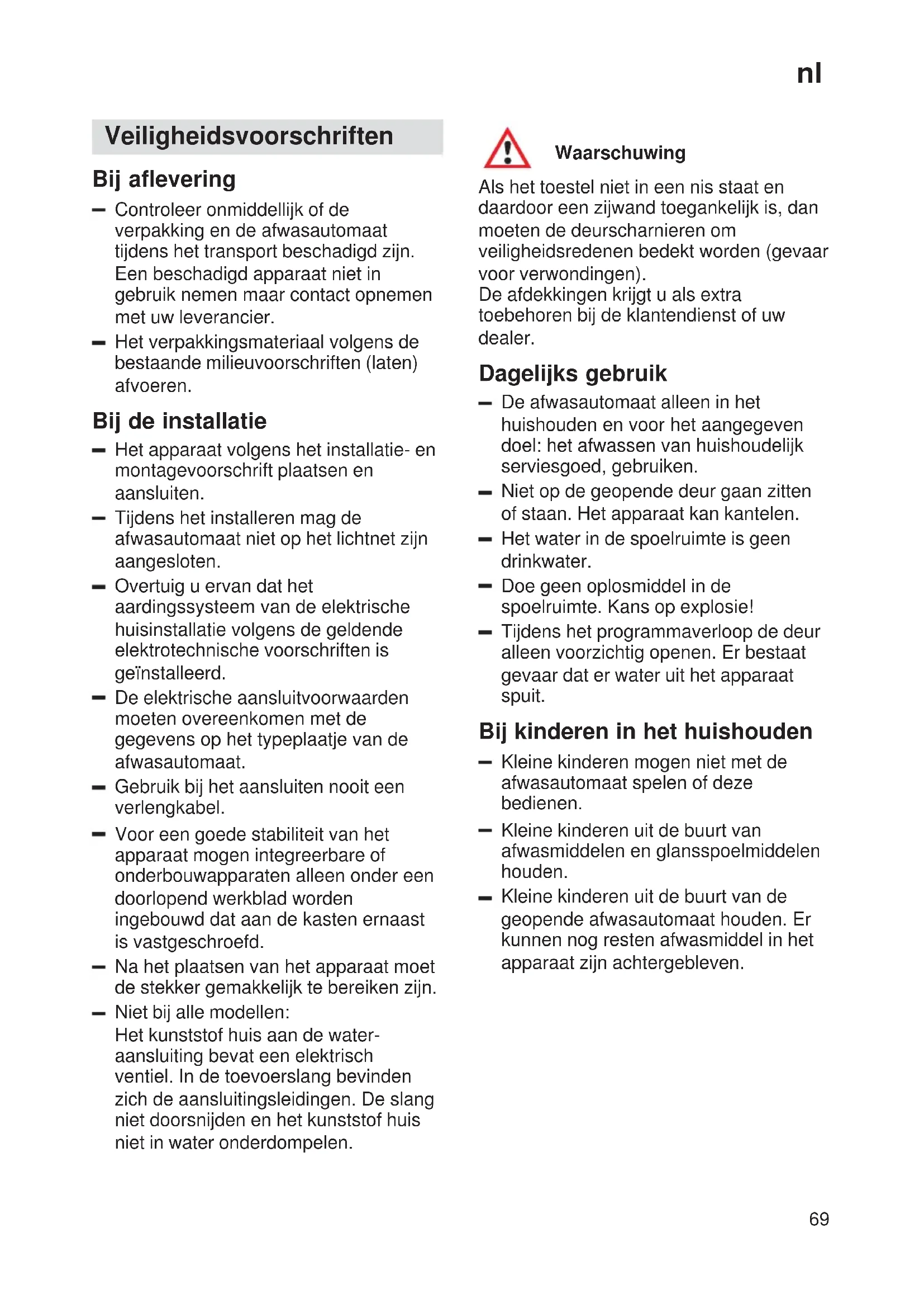 Veiligheidsvoorschriften Bij aflevering Controleer onmiddellijk of de verpakking en de afwasautomaat tijdens het transport beschadigd zijn. Een beschadigd apparaat niet in gebruik nemen maar contact opnemen met uw leverancier. Het verpakkingsmateriaal volgens de bestaande milieuvoorschriften (laten) afvoeren. Bij de installatie Het apparaat volgens het installatie- en montagevoorschrift plaatsen en aansluiten. Tijdens het installeren mag de afwasautomaat niet op het lichtnet zijn aangesloten. Overtuig u ervan dat het aardingssysteem van de elektrische huisinstallatie volgens de geldende elektrotechnische voorschriften is geïnstalleerd. De elektrische aansluitvoorwaarden moeten overeenkomen met de gegevens op het typeplaatje van de afwasautomaat. Gebruik bij het aansluiten nooit een verlengkabel. Voor een goede stabiliteit van het apparaat mogen integreerbare of onderbouwapparaten alleen onder een doorlopend werkblad worden ingebouwd dat aan de kasten ernaast is vastgeschroefd. Na het plaatsen van het apparaat moet de stekker gemakkelijk te bereiken zijn. Niet bij alle modellen: Het kunststof huis aan de water- aansluiting bevat een elektrisch ventiel. In de toevoerslang bevinden zich de aansluitingsleidingen. De slang niet doorsnijden en het kunststof huis niet in water onderdompelen. Waarschuwing Als het toestel niet in een nis staat en daardoor een zijwand toegankelijk is, dan moeten de deurscharnieren om veiligheidsredenen bedekt worden (gevaar voor verwondingen). De afdekkingen krijgt u als extra toebehoren bij de klantendienst of uw dealer. Dagelijks gebruik De afwasautomaat alleen in het huishouden en voor het aangegeven doel: het afwassen van huishoudelijk serviesgoed, gebruiken. Niet op de geopende deur gaan zitten of staan. Het apparaat kan kantelen. Het water in de spoelruimte is geen drinkwater. Doe geen oplosmiddel in de spoelruimte. Kans op explosie! Tijdens het programmaverloop de deur alleen voorzichtig openen. Er bestaat gevaar dat er water uit het apparaat spuit. Bij kinderen in het huishouden Kleine kinderen mogen niet met de afwasautomaat spelen of deze bedienen. Kleine kinderen uit de buurt van afwasmiddelen en glansspoelmiddelen houden. Kleine kinderen uit de buurt van de geopende afwasautomaat houden. Er kunnen nog resten afwasmiddel in het apparaat zijn achtergebleven.nl