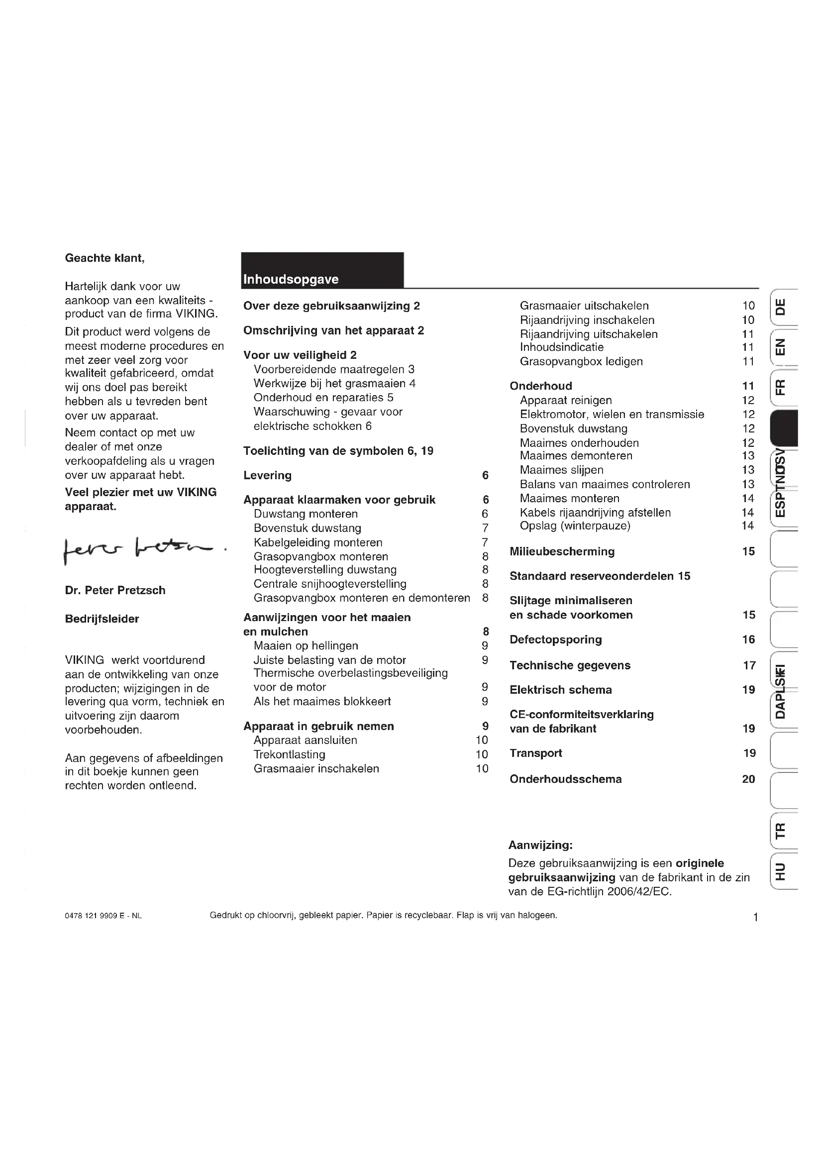 Geachte klant, Hartelijk dank voor uw aankoop van een kwaliteits - product van de firma VIKING. Dit product werd volgens de meest moderne procedures en met zeer veel zorg voor kwaliteit gefabriceerd, omdat wij ons doel pas bereikt hebben als u tevreden bent over uw apparaat. Neem contact op met uw dealer of met onze verkoopafdeling als u vragen over uw apparaat hebt. Veel plezier met uw VIKING apparaat. Dr. Peter Pretzsch Bedrijfsleider VIKING werkt voortdurend aan de ontwikkeling van onze producten; wijzigingen in de levering qua vorm, techniek en uitvoering zijn daarom voorbehouden. Aan gegevens of afbeeldingen in dit boekje kunnen geen rechten worden ontleend. Inhoudsopgave Over deze gebruiksaanwijzing 2 Omschrijving van het apparaat 2 Voor uw veiligheid 2 Voorbereidende maatregelen 3 Werkwijze bij het grasmaaien 4 Onderhoud en reparaties 5 Waarschuwing - gevaar voor elektrische schokken 6 Toelichting van de symbolen 6, 19 Levering 6 Apparaat klaarmaken voor gebruik 6 Duwstang monteren 6 Bovenstuk duwstang 7 Kabelgeleiding monteren 7 Grasopvangbox monteren 8 Hoogteverstelling duwstang 8 Centrale snijhoogteverstelling 8 Grasopvangbox monteren en demonteren 8 Aanwijzingen voor het maaien en mulchen 8 Maaien op hellingen 9 Juiste belasting van de motor 9 Thermische overbelastingsbeveiliging voor de motor 9 Als het maaimes blokkeert 9 Apparaat in gebruik nemen 9 Apparaat aansluiten 10 Trekontlasting 10 Grasmaaier inschakelen 10 Grasmaaier uitschakelen 10 Rijaandrijving inschakelen 10 Rijaandrijving uitschakelen 11 Inhoudsindicatie 11 Grasopvangbox ledigen 11 Onderhoud 11 Apparaat reinigen 12 Elektromotor, wielen en transmissie 12 Bovenstuk duwstang 12 Maaimes onderhouden 12 Maaimes demonteren 13 Maaimes slijpen 13 Balans van maaimes controleren 13 Maaimes monteren 14 Kabels rijaandrijving afstellen 14 Opslag (winterpauze) 14 Milieubescherming 15 Standaard reserveonderdelen 15 Slijtage minimaliseren en schade voorkomen 15 Defectopsporing 16 Technische gegevens 17 Elektrisch schema 19 CE-conformiteitsverklaring van de fabrikant 19 Transport 19 Onderhoudsschema 20 Aanwijzing: Deze gebruiksaanwijzing is een originele gebruiksaanwijzing van de fabrikant in de zin van de EG-richtlijn 2006/42/EC. Gedrukt op chloorvrij, gebleekt papier. Papier is recyclebaar. Flap is vrij van halogeen. 0478_121_9909_e:0478_121_9909_e 05.12.2012 15:11 Seite 12 0478 121 9909 E - NL Dit symbool koppelt de afbeeldingen op de pagina’s met afbeeldingen met het desbetreffende tekstgedeelte in de gebruiksaanwijzing. Afbeeldingssymbolen Over deze gebruiksaanwijzing