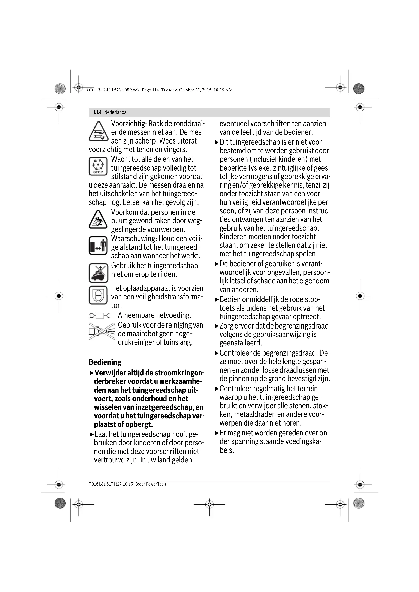 *afhankelijk van het apparaattype **afhankelijk van vorm en complexiteit van het gazonoppervlak (zie voorbeelden in afbeelding 3) ***afhankelijk van maaihoogte, grastoestand en vochtigheid De gegevens gelden voor nominale spanningen [U] 230 V. Bij afwijkende spanningen en bij per land verschillende uitvoeringen kunnen deze gegevens afwijken. OBJ_BUCH-1573-008.book Page 118 Tuesday, October 27, 2015 10:35 AMNederlands | 119 Bosch Power Tools F 016 L81 517 | (27.10.15) Informatie over geluid en trillingen Geluidsemissiewaarden vastgesteld volgens EN 50636-2-107. Het A-gewogen geluidsniveau van het apparaat bedraagt ken- merkend: geluidsdrukniveau 64 dB(A); geluidsvermogenni- veau 72 dB(A). Onzekerheid K =2,74 dB. Conformiteitsverklaring We verklaren als alleen verantwoordelijke dat het onder „Technische gegevens” beschreven product voldoet aan alle geldende bepalingen van de richtlijnen 2006/42/EG, 1999/5/EG (t/m 13 juni 2016), 2014/53/EU (vanaf 14 juni 2016), 2000/14/EG, 2009/125/EG, 2011/65/EU inclusief de wijzigingen en overeenstemt met de volgende normen: EN 60335-1:2012+A11:2014/EN 50636-2-107:2015 (productveiligheid), EN 61558-1:2005+A1:2009/ EN 61558-2-16:2009+A1:2013 (veiligheid van transforma- toren), EN 301 489-7 V1.3.1 (EMC en ERM voor GSM en DCS), EN 301 511 V9.0.2 (essentiële eisen voor GSM 900 en GSM 1800), EN 55014-1:2006+A2:2011 (EMC sto- ringsemissies), EN 55014-2:1997+A2:2008 (EMC storings- bestendigheid). 2000/14/EG: Gegarandeerd geluidsdrukniveau 75 dB (A). Wegingsmethode van de conformiteit volgens aanhangsel VI. Productcategorie: 32 Aangewezen instantie 2000/14/EG: SRL, Sudbury, England, Nr. 1088 Technisch dossier (2006/42/EG, 2000/14/EG) bij: Bosch Lawn and Garden Ltd., PT-HG/ENS-PA2, Stowmarket, Suffolk IP14 1EY, England Robert Bosch GmbH, Power Tools Division 70764 Leinfelden-Echterdingen, GERMANY Leinfelden, 27.10.2015 Oplaadstation Productnummer F 016 ... ... L69.104 ... L69.104 ... L69.104 ... L69.104 ... L69.104 ... L69.104 Ingangsspanning V4242 42 42 42 42 Energieverbruik W150150 150 150 150 150 Laadstroom A2,02,0 2,0 2,0 2,0 2,0 Toegestaan oplaadtempe- ratuurbereik °C 5–45 5–45 5–45 5–45 5–45 5–45 Gewicht kg 2,0 2,0 2,0 2,0 2,0 2,0 Beschermingsklasse
