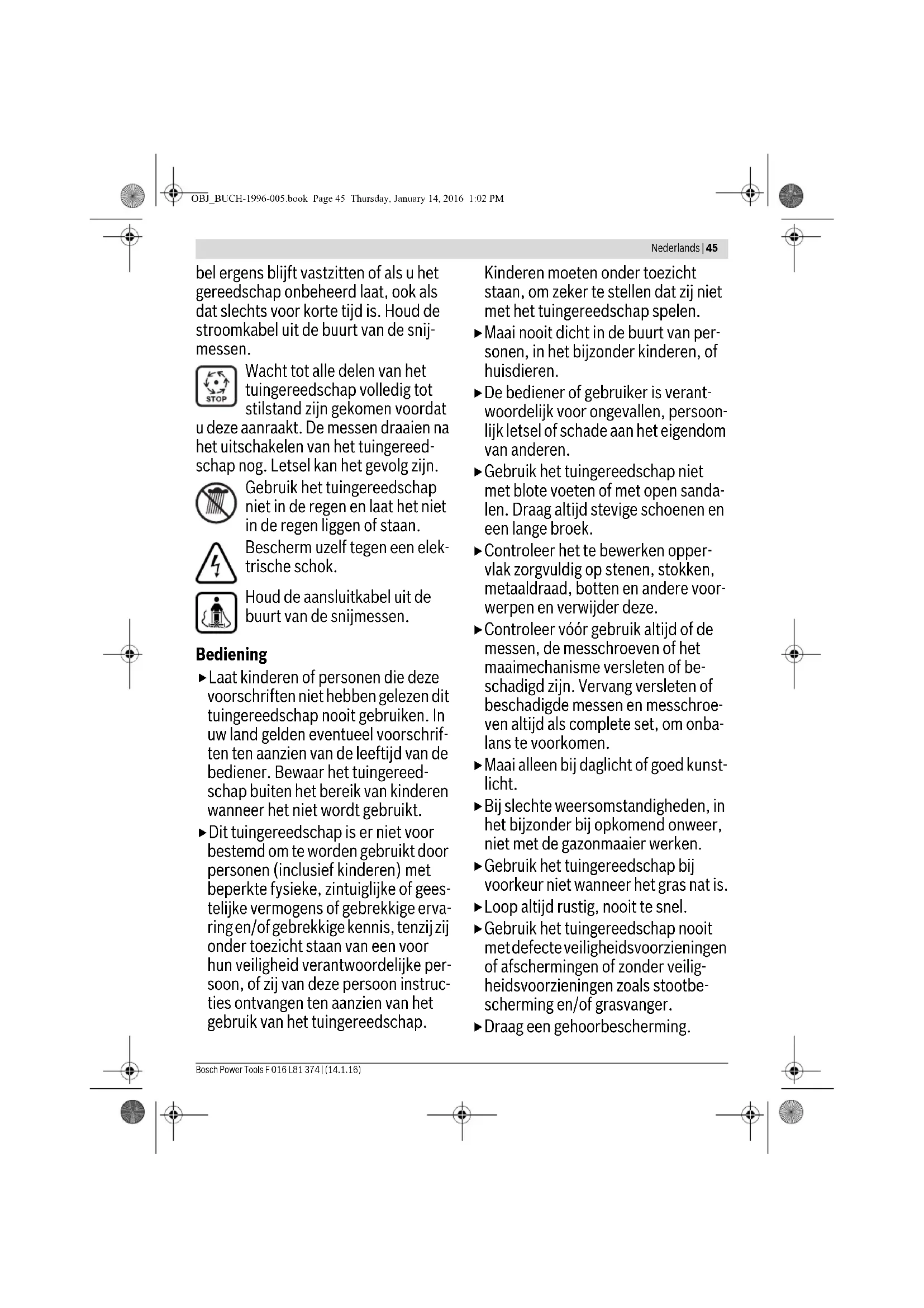 STOP Problema Possibili cause Rimedi Il motore non funziona Tensione di rete assente Controllare ed inserire Presa elettrica difettosa Utilizzare un’altra presa Cavo di prolunga danneggiato Controllare il cavo e, se necessario, sostituirlo Il fusibile è scattato Sostituire il fusibile Erba troppo lunga Regolare un’altezza di taglio maggiore e ribaltare l’apparecchio per il giardinaggio per ridurre la solle- citazione iniziale La protezione del motore è scattata Lasciare raffreddare il motore e regolare un’altezza di taglio maggiore L’apparecchio per il giardinaggio funziona con interruzioni Cavo di prolunga danneggiato Controllare il cavo e, se necessario, sostituirlo Cablaggio interno dell’apparecchio per il giardinaggio difettoso Contattare il centro assistenza clienti La protezione del motore è scattata Lasciare raffreddare il motore e regolare un’altezza di taglio maggiore L’apparecchio per il giardinaggio lascia tracce di taglio irregolari e/o Il motore lavora con difficoltà Altezza di taglio troppo bassa Regolare una maggiore altezza di taglio Lame senza filo Sostituzione della lama Possibile ostruzione Controllare la parte inferiore dell’apparecchio per il giardinaggio e, se necessario, eliminare l’ostruzio- ne (portare sempre guanti per giardinaggio) Lama montata in posizione errata Montare la lama nella posizione corretta OBJ_BUCH-1996-005.book Page 43 Thursday, January 14, 2016 1:02 PM44 | Nederlands F 016 L81 374 | (14.1.16) Bosch Power Tools Assistenza clienti e consulenza impieghi www.bosch-garden.com Per ogni tipo di richiesta o di ordinazione di pezzi di ricambio, è indispensabile comunicare sempre il codice prodotto a die- ci cifre riportato sulla targhetta di fabbricazione dell’apparec- chio per il giardinaggio. Italia Officina Elettroutensili Robert Bosch S.p.A. Corso Europa 2/A 20020 LAINATE (MI) Tel.: (02) 3696 2663 Fax: (02) 3696 2662 Fax: (02) 3696 8677 E-Mail: officina.elettroutensili@it.bosch.com Svizzera Sul sito www.bosch-pt.com/ch/it è possible ordinare diretta- mente on-line i ricambi. Tel.: (044) 8471513 Fax: (044) 8471553 E-Mail: Aftersales.Service@de.bosch.com Smaltimento Avviare ad un riciclaggio rispettoso dell’ambiente apparecchi per il giardinaggio, accessori ed imballaggi dismessi. Non gettare gli apparecchi per il giardinaggio tra i rifiuti dome- stici! Solo per i Paesi della CE: Conformemente alla direttiva europea 2012/19/UE sui rifiuti di apparecchiature elettriche ed elettroniche ed all’attuazione del recepimento nel diritto nazionale, le ap- parecchiature elettriche ed elettroniche di- ventate inservibili devono essere raccolte se- paratamente ed essere inviati ad una riutilizzazione ecologica. Con ogni riserva di modifiche tecniche. Nederlands Veiligheidsvoorschriften Let op! Lees de volgende voorschrif- ten zorgvuldig door. Maak uzelf ver- trouwd met de bedieningselementen en het juiste gebruik van het tuinge- reedschap. Bewaar de gebruiksaan- wijzing om deze later te kunnen raad- plegen. Verklaring van de symbolen op het tuingereedschap Algemene waarschuwing. Lees de gebruiksaanwijzing door. Voorkom dat personen in de buurt gewond raken door weg- geslingerde voorwerpen. Waarschuwing: Houd een veili- ge afstand tot het tuingereed- schap aan wanneer het werkt. Voorzichtig: Raak de ronddraai- ende messen niet aan. De mes- sen zijn scherp. Wees uiterst voorzichtig met tenen en vingers. Niet van toepassing. Schakel het tuingereedschap uit en trek de netstekker uit het stopcontact voordat u het ge- reedschap instelt of reinigt, als de ka- La lama da taglio non ruota dopo aver acceso l’apparecchio per il giardinaggio Lama bloccata da erba Spegnere l’apparecchio per il giardinaggio Eliminare l’ostruzione (portare sempre guanti per giardinaggio) Dado/vite della lama allentato/allentata Serrare saldamente il dado/vite della lama (17 Nm) Vibrazioni e rumore eccessivi Dado/vite della lama allentato/allentata Serrare saldamente il dado/vite della lama (17 Nm) Lama danneggiata Sostituzione della lama Problema Possibili cause Rimedi OBJ_BUCH-1996-005.book Page 44 Thursday, January 14, 2016 1:02 PMNederlands | 45 Bosch Power Tools F 016 L81 374 | (14.1.16) bel ergens blijft vastzitten of als u het gereedschap onbeheerd laat, ook als dat slechts voor korte tijd is. Houd de stroomkabel uit de buurt van de snij- messen. Wacht tot alle delen van het tuingereedschap volledig tot stilstand zijn gekomen voordat u deze aanraakt. De messen draaien na het uitschakelen van het tuingereed- schap nog. Letsel kan het gevolg zijn. Gebruik het tuingereedschap niet in de regen en laat het niet in de regen liggen of staan. Bescherm uzelf tegen een elek- trische schok. Houd de aansluitkabel uit de buurt van de snijmessen. Bediening Laat kinderen of personen die deze voorschriften niet hebben gelezen dit tuingereedschap nooit gebruiken. In uw land gelden eventueel voorschrif- ten ten aanzien van de leeftijd van de bediener. Bewaar het tuingereed- schap buiten het bereik van kinderen wanneer het niet wordt gebruikt. Dit tuingereedschap is er niet voor bestemd om te worden gebruikt door personen (inclusief kinderen) met beperkte fysieke, zintuiglijke of gees- telijke vermogens of gebrekkige erva- ring en/of gebrekkige kennis, tenzij zij onder toezicht staan van een voor hun veiligheid verantwoordelijke per- soon, of zij van deze persoon instruc- ties ontvangen ten aanzien van het gebruik van het tuingereedschap. Kinderen moeten onder toezicht staan, om zeker te stellen dat zij niet met het tuingereedschap spelen. Maai nooit dicht in de buurt van per- sonen, in het bijzonder kinderen, of huisdieren. De bediener of gebruiker is verant- woordelijk voor ongevallen, persoon- lijk letsel of schade aan het eigendom van anderen. Gebruik het tuingereedschap niet met blote voeten of met open sanda- len. Draag altijd stevige schoenen en een lange broek. Controleer het te bewerken opper- vlak zorgvuldig op stenen, stokken, metaaldraad, botten en andere vo