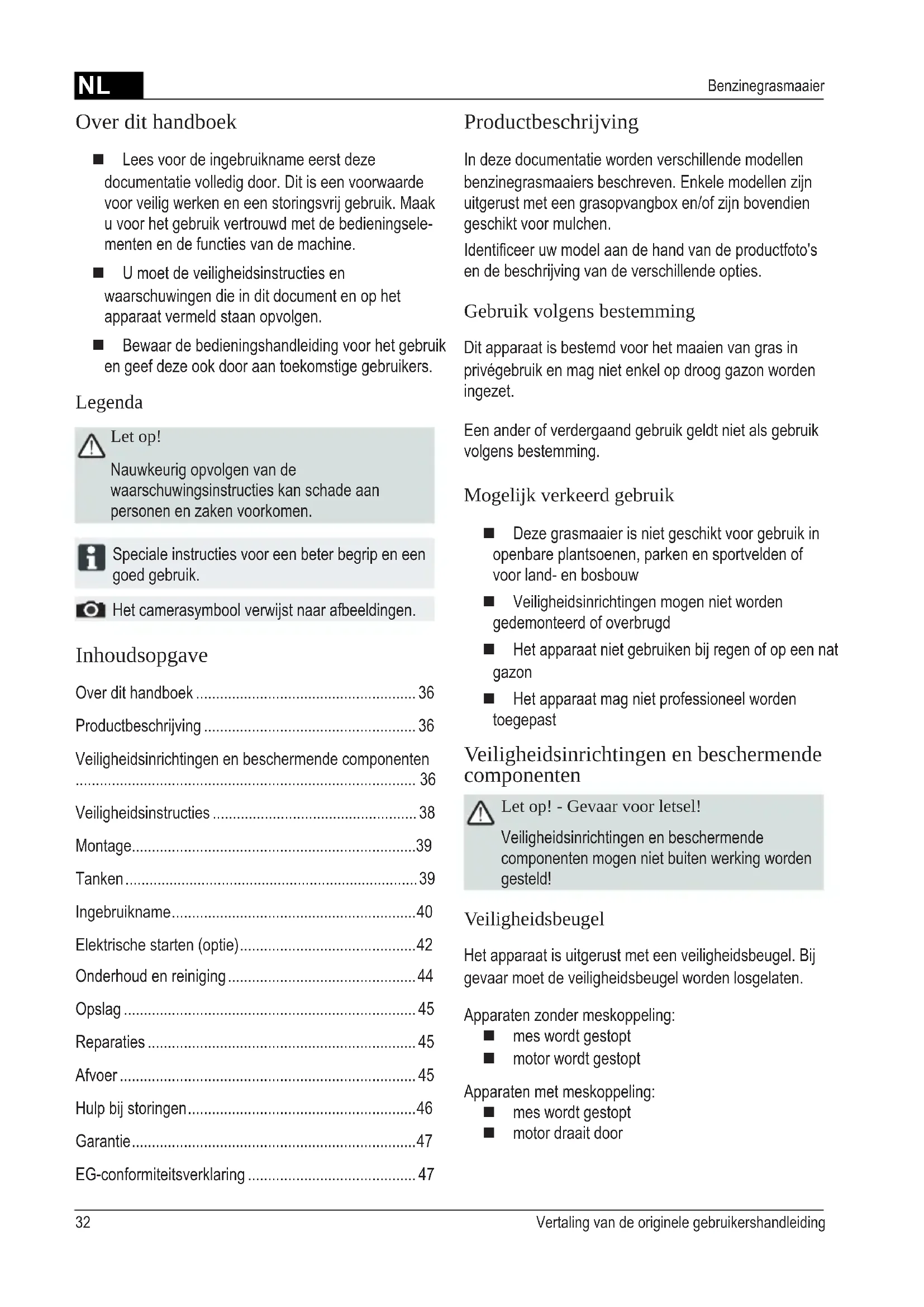 - EG-conformiteitsverklaring Over dit handboek Lees voor de ingebruikname eerst deze documentatie volledig door. Dit is een voorwaarde voor veilig werken en een storingsvrij gebruik. Maak u voor het gebruik vertrouwd met de bedieningsele- menten en de functies van de machine. U moet de veiligheidsinstructies en waarschuwingen die in dit document en op het apparaat vermeld staan opvolgen. Bewaar de bedieningshandleiding voor het gebruik en geef deze ook door aan toekomstige gebruikers. Legenda Let op! Nauwkeurig opvolgen van de waarschuwingsinstructies kan schade aan personen en zaken voorkomen. Speciale instructies voor een beter begrip en een goed gebruik. Het camerasymbool verwijst naar afbeeldingen. Productbeschrijving In deze documentatie worden verschillende modellen benzinegrasmaaiers beschreven. Enkele modellen zijn uitgerust met een grasopvangbox en/of zijn bovendien geschikt voor mulchen. Identiceeruwmodelaandehandvandeproductfoto's en de beschrijving van de verschillende opties. Gebruik volgens bestemming Dit apparaat is bestemd voor het maaien van gras in privégebruik en mag niet enkel op droog gazon worden ingezet. Een ander of verdergaand gebruik geldt niet als gebruik volgens bestemming. Mogelijk verkeerd gebruik Deze grasmaaier is niet geschikt voor gebruik in openbare plantsoenen, parken en sportvelden of voor land- en bosbouw Veiligheidsinrichtingen mogen niet worden gedemonteerd of overbrugd Het apparaat niet gebruiken bij regen of op een nat gazon Het apparaat mag niet professioneel worden toegepast Veiligheidsinrichtingen en beschermende componenten Let op! - Gevaar voor letsel! Veiligheidsinrichtingen en beschermende componenten mogen niet buiten werking worden gesteld! Veiligheidsbeugel Het apparaat is uitgerust met een veiligheidsbeugel. Bij gevaar moet de veiligheidsbeugel worden losgelaten. Apparaten zonder meskoppeling: mes wordt gestopt motor wordt gestopt Apparaten met meskoppeling: mes wordt gestopt motor draait doorNL 33455 999_a1 Startkabel 9 Snijhoogteverstelling*2 Start, stop* 10 Meskoppeling*3 Wielaandrijving* 11 Varioaandrijving*4 Veiligheidsbeugel 12 Gebruikshandleiding5 Ergonomische hoogteverstelling* 13 Uitwerpinzet*6 Vulstandindicatie* 14 Sluitklep*7 Veiligheidsklep* 15 Mulchkit*8 Grasopvangbox* 16 Zünschloss voor elektrische start17 Korte handleidingSymbolen op het apparaatLet op! Voorzichtig handelen bij gebruik.Voordat u werkzaamheden gaat uitvoeren aan het snijmechanisme, eerst de bougiedop uittrekken.Vóór de ingebruikname gebruiksaanwijzing lezen!Korte handleiding Motorrem losmaken.Derden buiten het gevarenbereik houden!Korte handleiding Wielaandrijving inschakelen.Handen en voeten bij messen vandaan houdenKorte handleiding Snelheidsregelaar start / stop.Afstand houden van het gevarenbereik. p. 47