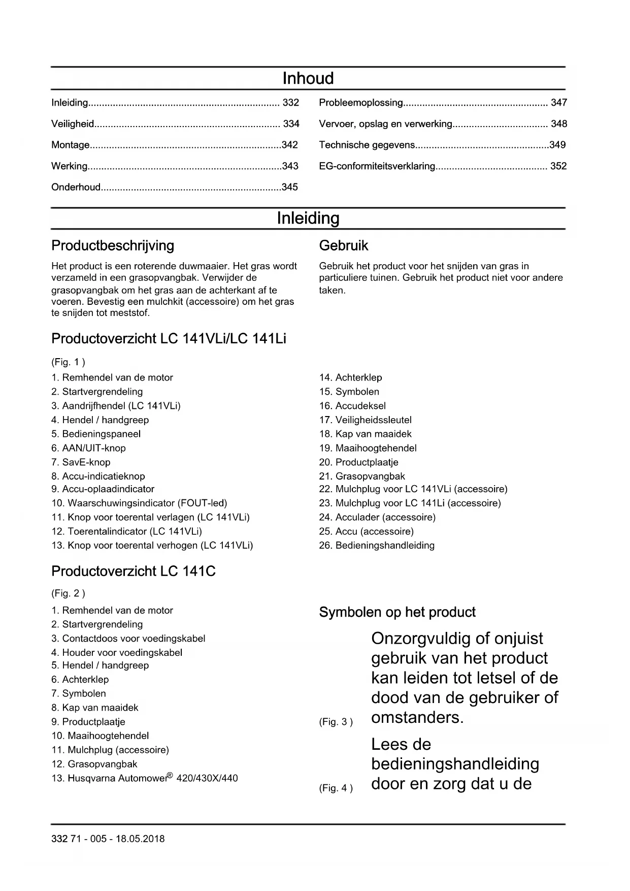 420/430X/440 Symbolen op het product (Fig. 3 ) Onzorgvuldig of onjuist gebruik van het product kan leiden tot letsel of de dood van de gebruiker of omstanders. (Fig. 4 ) Lees de bedieningshandleiding door en zorg dat u de 332 71 - 005 - 18.05.2018instructies hebt begrepen voordat u dit product gebruikt. (Fig. 5 ) Houd personen en dieren op veilige afstand van het werkgebied. (Fig. 6 ) Kijk uit voor weggeslingerde en afgeketste voorwerpen. (Fig. 7 ) Waarschuwing: Houd handen en voeten uit de buurt van het roterende mes. (Fig. 8 ) Waarschuwing: Houd handen en voeten uit de buurt van draaiende onderdelen. (Fig. 9 ) Verwijder de veiligheidssleutel voordat u onderhoud aan het product uitvoert. (model LC 141VLi/LC 141Li) (Fig. 10 ) Koppel het product los uit de contactdoos voordat u onderhoud aan het product uitvoert. (model LC 141C) (Fig. 11 ) IPX1 - Het product biedt bescherming tegen waterdruppels (model LC 141VLi/LC 141Li) (Fig. 12 ) IPX4 - Het product biedt bescherming tegen opspattend water (model LC 141C) (Fig. 13 ) Zorg dat er geen regen op het product valt (model LC 141VLi/LC 141Li) (Fig. 14 ) Waarschuwing: Ga niet met het product over de voedingskabel heen, omdat dit een elektrische schok of beschadiging van het product kan veroorzaken. (model LC 141C) (Fig. 15 ) Dit product voldoet aan de geldende EG- richtlijnen. (Fig. 16 ) Geluidsemissie naar de omgeving volgens de richtlijn van de Europese Gemeenschap. De emissie van het product is vermeld in het hoofdstuk "Technische gegevens" en op het label. (Fig. 17 ) Gelijkstroom. 36V (Fig. 18 ) Dubbele isolatie.