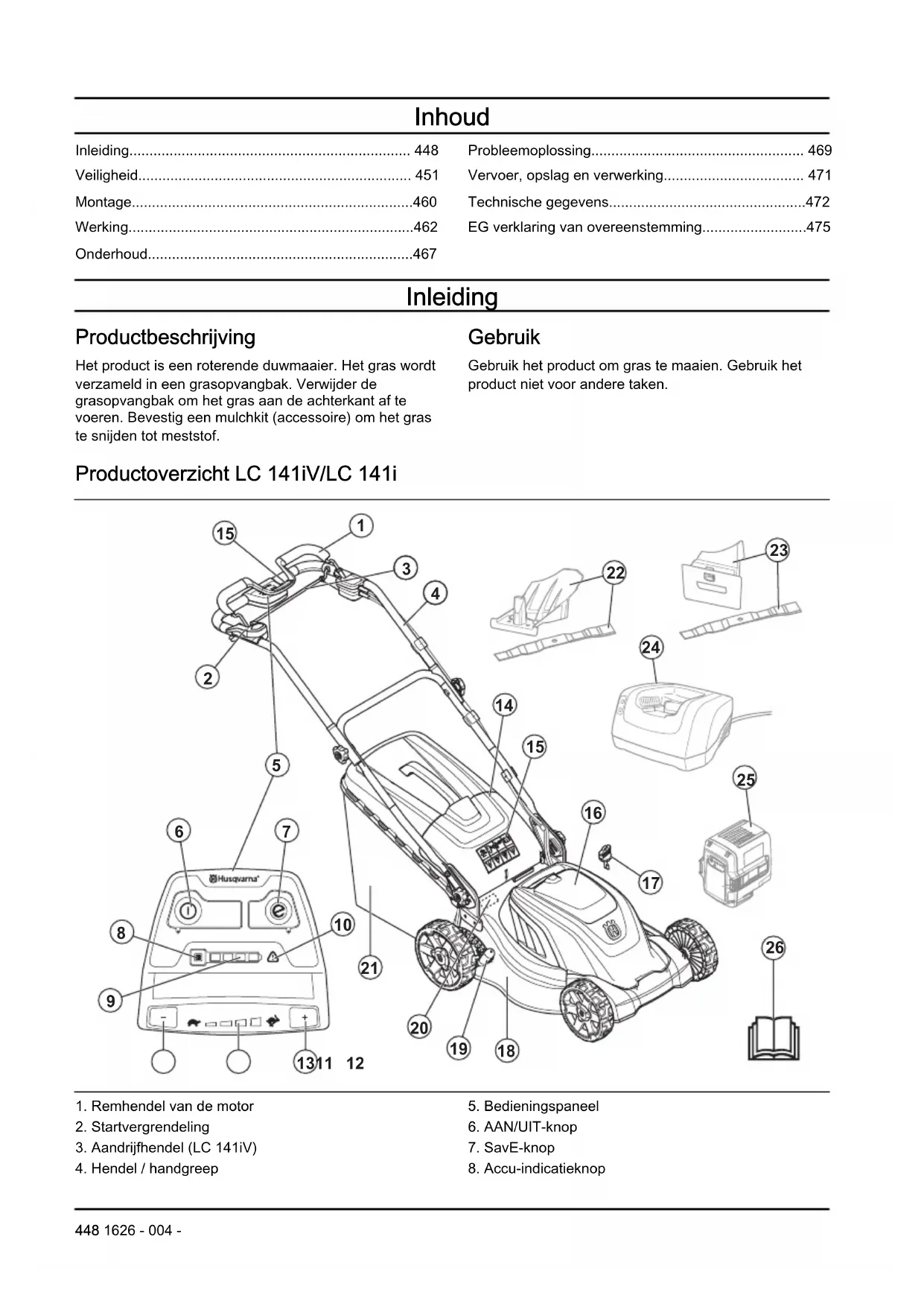 - EG verklaring van overeenstemming Inleiding Productbeschrijving Het product is een roterende duwmaaier. Het gras wordt verzameld in een grasopvangbak. Verwijder de grasopvangbak om het gras aan de achterkant af te voeren. Bevestig een mulchkit (accessoire) om het gras te snijden tot meststof. Gebruik Gebruik het product om gras te maaien. Gebruik het product niet voor andere taken. Productoverzicht LC 141iV/LC 141i p. 475