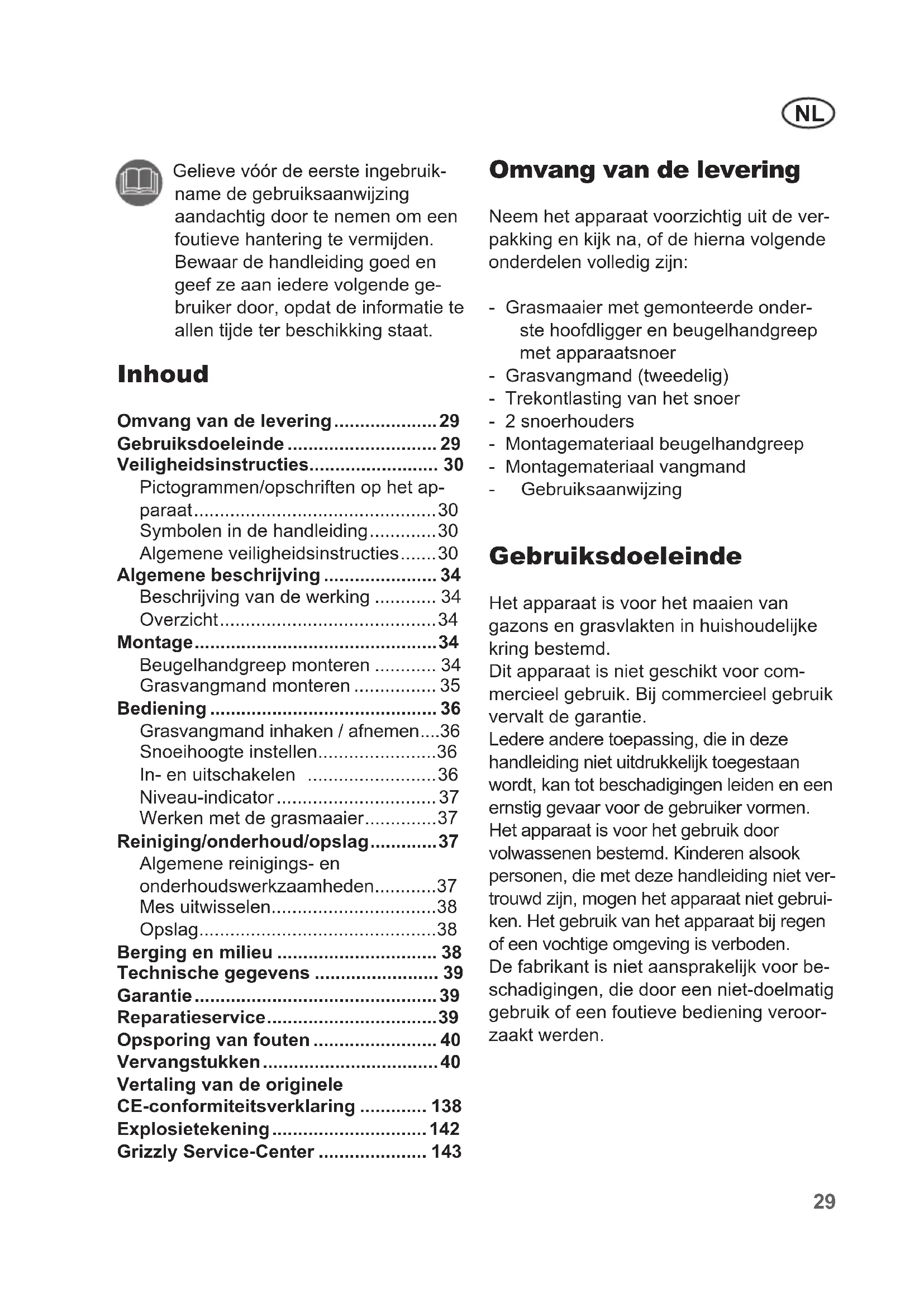 - Grizzly Service-Center Omvang van de levering Neem het apparaat voorzichtig uit de ver- pakking en kijk na, of de hierna volgende onderdelen volledig zijn: - Grasmaaier met gemonteerde onder- ste hoofdligger en beugelhandgreep met apparaatsnoer - Grasvangmand (tweedelig) - Trekontlasting van het snoer - 2 snoerhouders - Montagemateriaal beugelhandgreep - Montagemateriaal vangmand - Gebruiksaanwijzing Gebruiksdoeleinde Het apparaat is voor het maaien van gazons en grasvlakten in huishoudelijke kring bestemd. Dit apparaat is niet geschikt voor com- mercieel gebruik. Bij commercieel gebruik vervalt de garantie. Ledere andere toepassing, die in deze handleiding niet uitdrukkelijk toegestaan wordt, kan tot beschadigingen leiden en een ernstig gevaar voor de gebruiker vormen. Het apparaat is voor het gebruik door volwassenen bestemd. Kinderen alsook personen, die met deze handleiding niet ver- trouwd zijn, mogen het apparaat niet gebrui- ken. Het gebruik van het apparaat bij regen of een vochtige omgeving is verboden. De fabrikant is niet aansprakelijk voor be- schadigingen, die door een niet-doelmatig gebruik of een foutieve bediening veroor- zaakt werden. Gelieve vóór de eerste ingebruik- name de gebruiksaanwijzing aandachtig door te nemen om een foutieve hantering te vermijden. Bewaar de handleiding goed en geef ze aan iedere volgende ge- bruiker door, opdat de informatie te allen tijde ter beschikking staat.NL p. 143