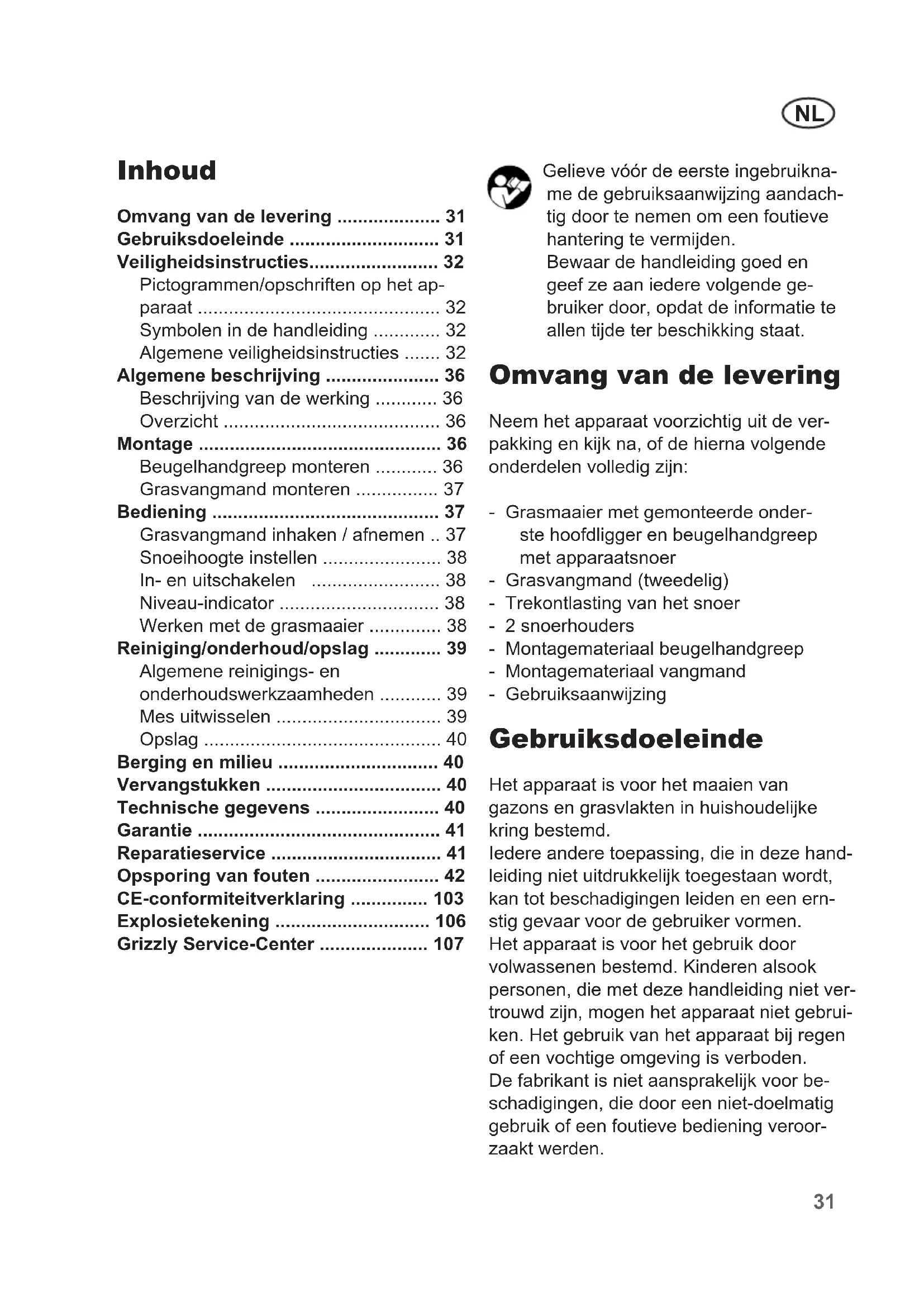 - Grizzly Service-Center Gelieve vóór de eerste ingebruikna- me de gebruiksaanwijzing aandach- tig door te nemen om een foutieve hantering te vermijden. Bewaar de handleiding goed en geef ze aan iedere volgende ge- bruiker door, opdat de informatie te allen tijde ter beschikking staat. Omvang van de levering Neem het apparaat voorzichtig uit de ver- pakking en kijk na, of de hierna volgende onderdelen volledig zijn: - Grasmaaier met gemonteerde onder- ste hoofdligger en beugelhandgreep met apparaatsnoer - Grasvangmand (tweedelig) - Trekontlasting van het snoer - 2 snoerhouders - Montagemateriaal beugelhandgreep - Montagemateriaal vangmand - Gebruiksaanwijzing Gebruiksdoeleinde Het apparaat is voor het maaien van gazons en grasvlakten in huishoudelijke kring bestemd. Iedere andere toepassing, die in deze hand- leiding niet uitdrukkelijk toegestaan wordt, kan tot beschadigingen leiden en een ern- stig gevaar voor de gebruiker vormen. Het apparaat is voor het gebruik door volwassenen bestemd. Kinderen alsook personen, die met deze handleiding niet ver- trouwd zijn, mogen het apparaat niet gebrui- ken. Het gebruik van het apparaat bij regen of een vochtige omgeving is verboden. De fabrikant is niet aansprakelijk voor be- schadigingen, die door een niet-doelmatig gebruik of een foutieve bediening veroor- zaakt werden.NL p. 107