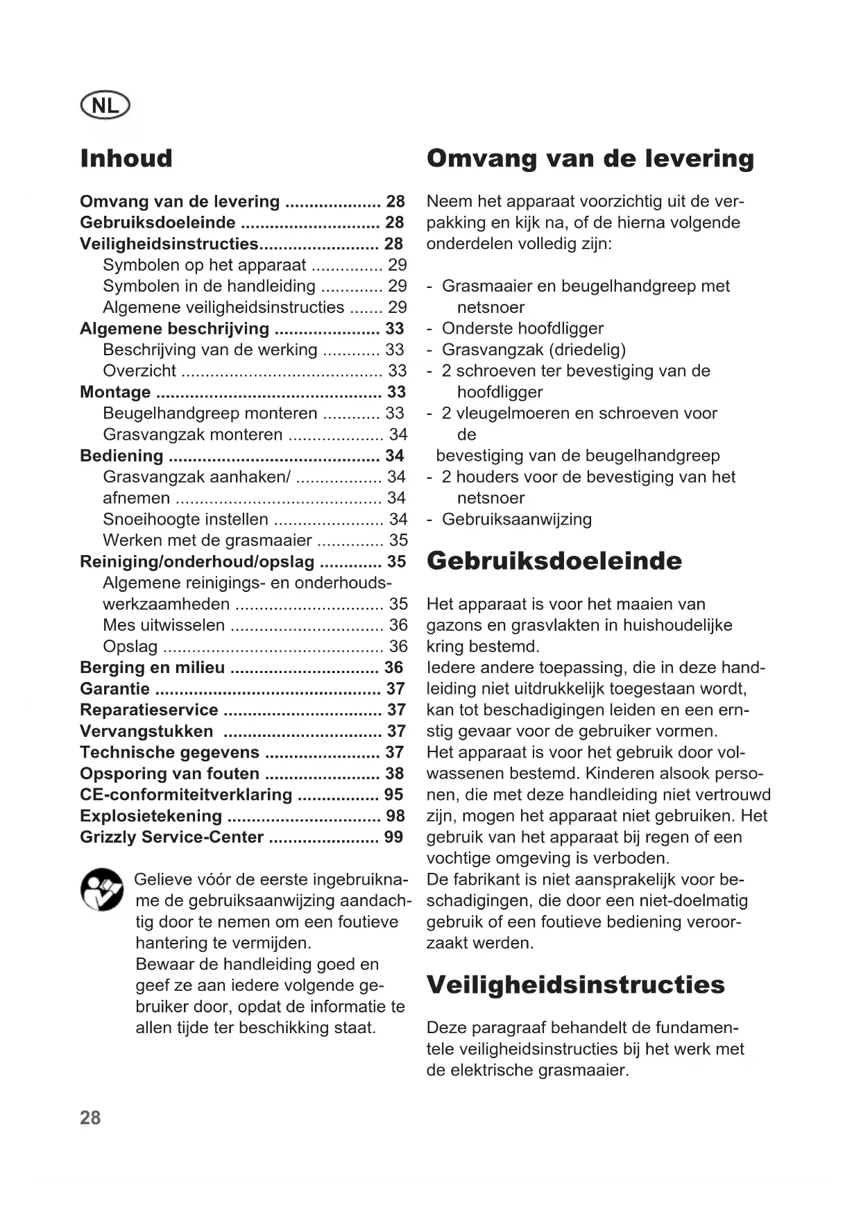 - Grizzly Service-Center Omvang van de levering Neem het apparaat voorzichtig uit de ver- pakking en kijk na, of de hierna volgende onderdelen volledig zijn: - Grasmaaier en beugelhandgreep met netsnoer - Onderste hoofdligger - Grasvangzak (driedelig) - 2 schroeven ter bevestiging van de hoofdligger - 2 vleugelmoeren en schroeven voor p. 99