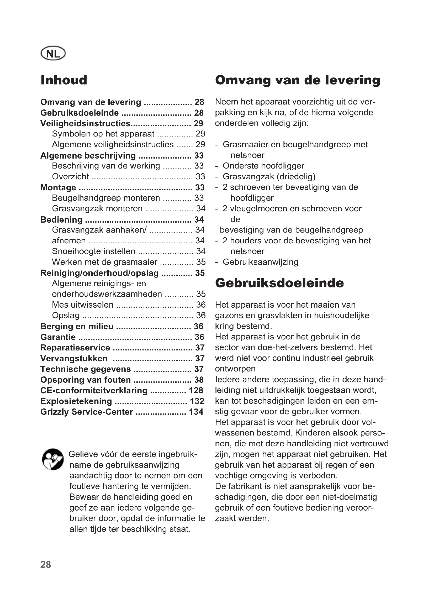 - Grizzly Service-Center Omvang van de levering Neem het apparaat voorzichtig uit de ver- pakking en kijk na, of de hierna volgende onderdelen volledig zijn: - Grasmaaier en beugelhandgreep met netsnoer - Onderste hoofdligger - Grasvangzak (driedelig) - 2 schroeven ter bevestiging van de hoofdligger - 2 vleugelmoeren en schroeven voor p. 134