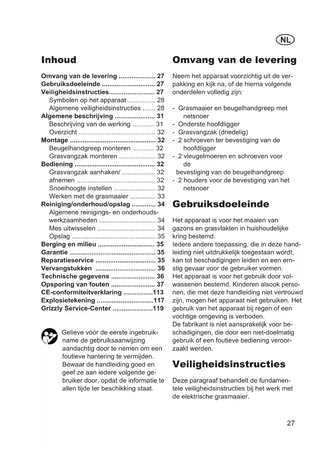 - Controller de grasmaier telkens voor gebruik op klaarblijijke tekortkomingen, zoals losse, verslen of beschadigde onderdelen. Ga de vaste zitting van alle moeren, bouteen en schroeven na.