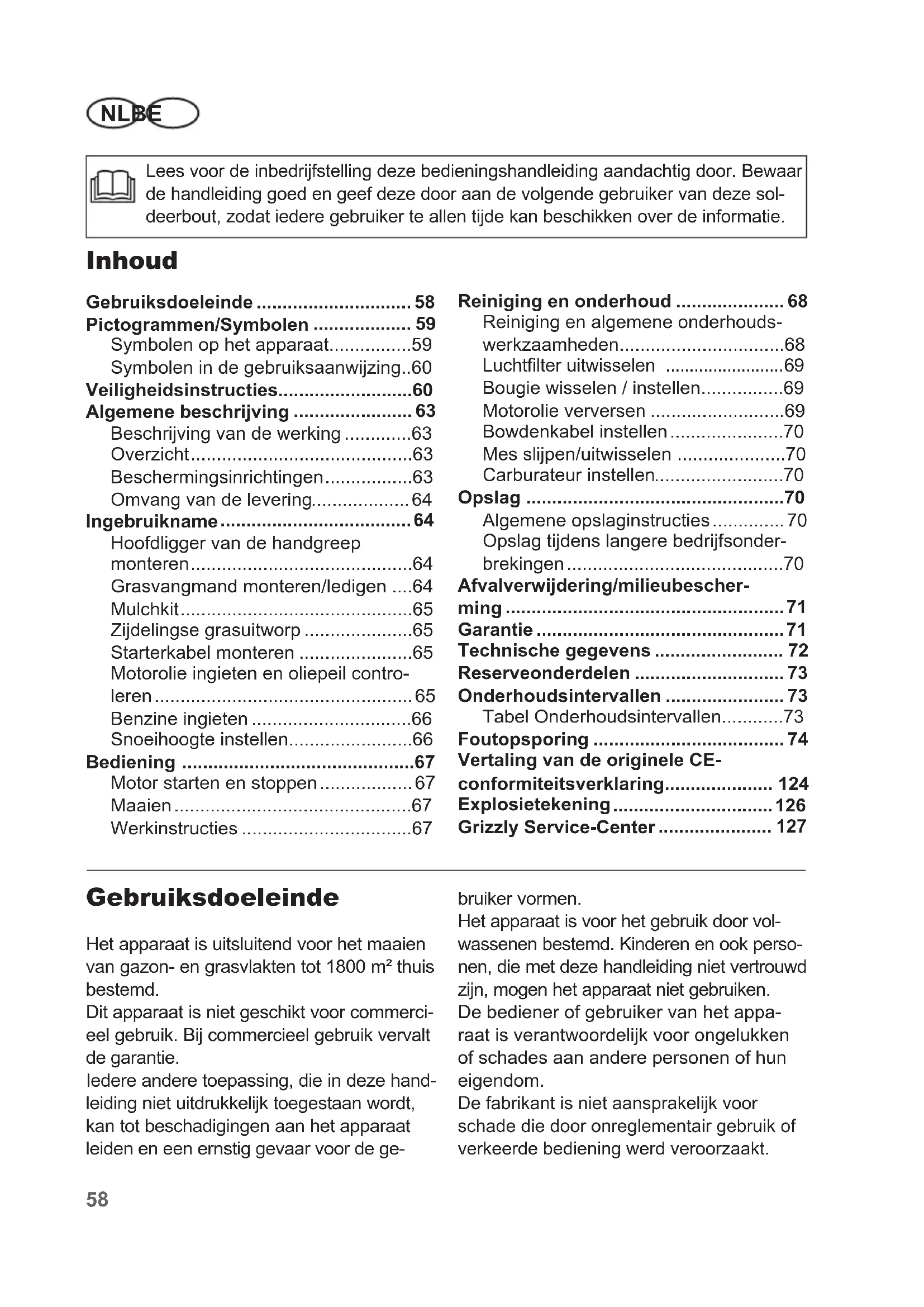 - Breng het apparaat, de toebehoren en de verpakking naar een geschikt recy- clagepunt. - Ledig de benzine- en olietank zorg- vuldig en geef uw apparaat in een recyclingpark af. De gebruikte kunst- stof- en metalen onderdelen kunnen per soort gescheiden worden en zodoende aan een recycling onder- worpen worden. - Oude olie en benzineresten in een recyclingpark afgeven en niet in de riolering of in de afvoer gieten. - Raadpleeg hiervoor uw Grizzly-dea- ler.