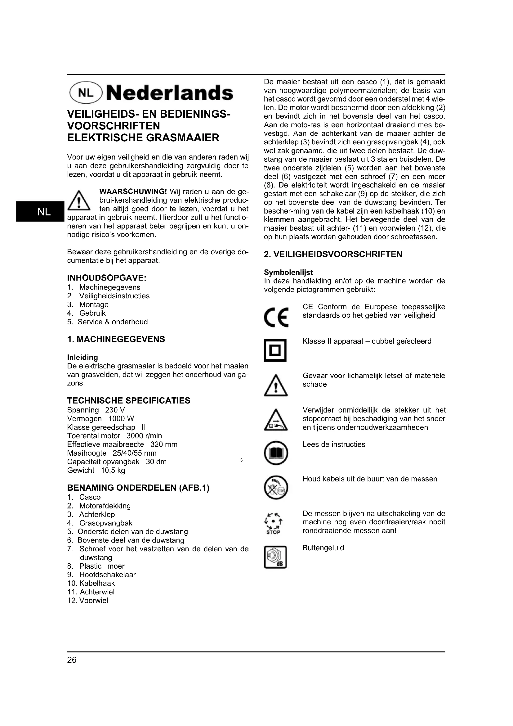 Inleiding De elektrische grasmaaier is bedoeld voor het maaien van grasvelden, dat wil zeggen het onderhoud van ga- zons. TECHNISCHE SPECIFICATIES Spanning 230 V Vermogen 1000 W Klasse gereedschap II Toerental motor 3000 r/min Effectieve maaibreedte 320 mm Maaihoogte 25/40/55 mm Capaciteit opvangbak 30 dm