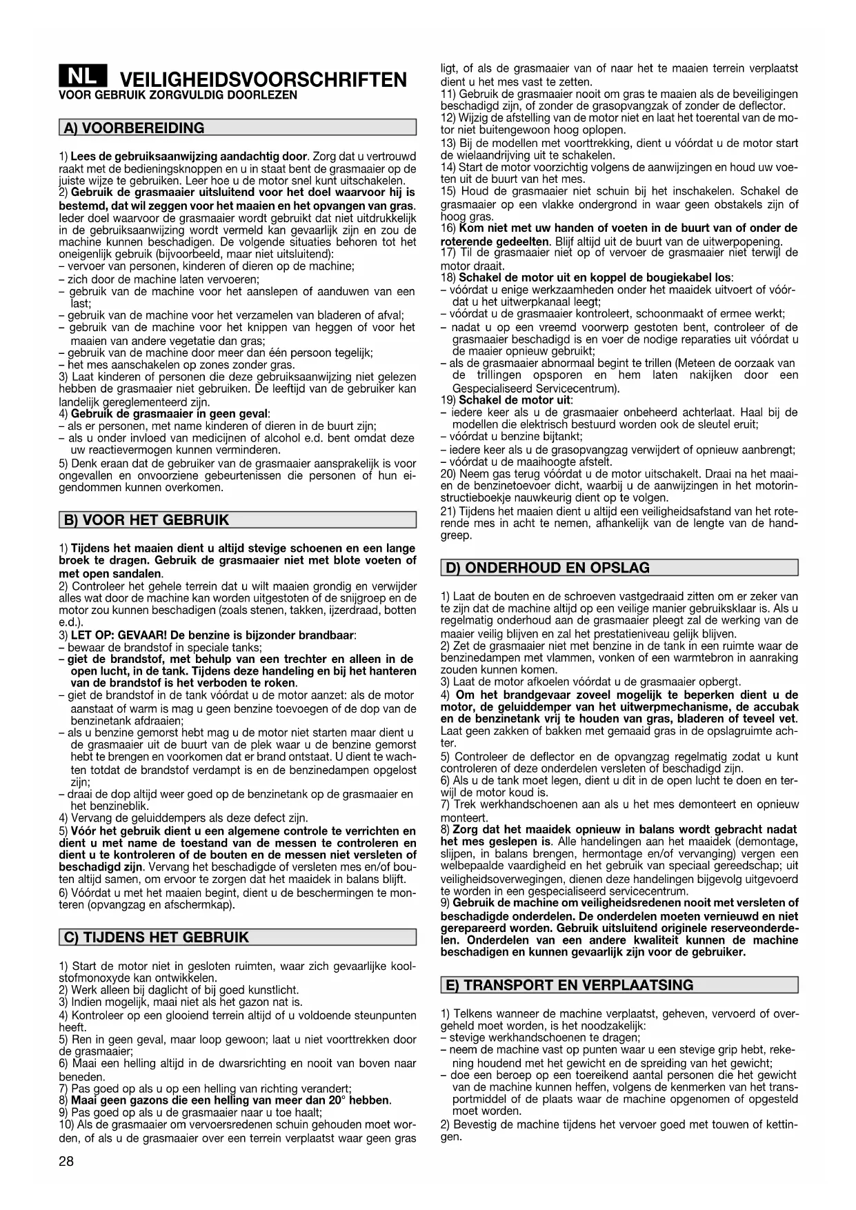 – bewaar de brandstof in speciale tanks; – giet de brandstof, met behulp van een trechter en alleen in de open lucht, in de tank. Tijdens deze handeling en bij het hanteren van de brandstof is het verboden te roken. – giet de brandstof in de tank vóórdat u de motor aanzet: als de motor aanstaat of warm is mag u geen benzine toevoegen of de dop van de benzinetank afdraaien; – als u benzine gemorst hebt mag u de motor niet starten maar dient u de grasmaaier uit de buurt van de plek waar u de benzine gemorst hebt te brengen en voorkomen dat er brand ontstaat. U dient te wach- ten totdat de brandstof verdampt is en de benzinedampen opgelost zijn; – draai de dop altijd weer goed op de benzinetank op de grasmaaier en het benzineblik.