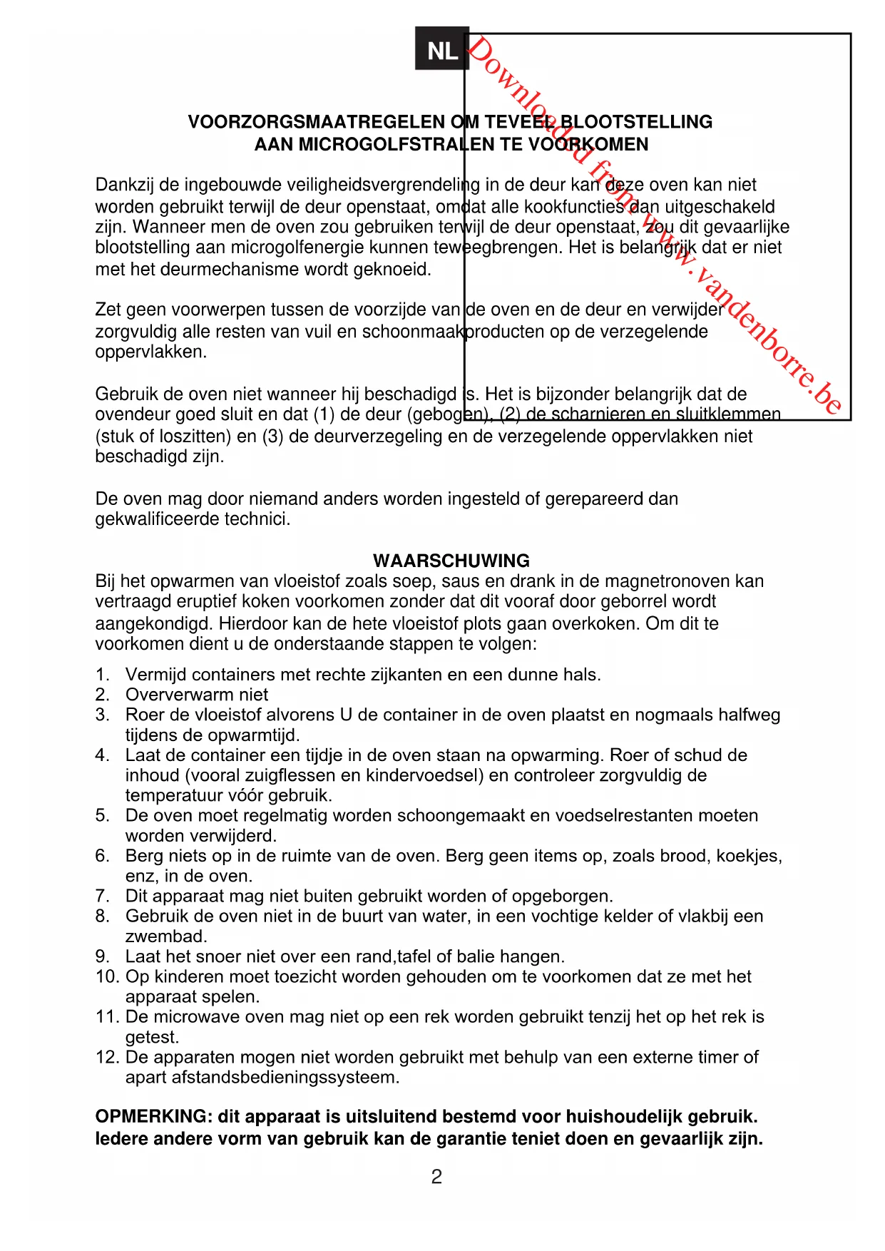 Dankzij de ingebouwde veiligheidsvergrendeling in de deur kan deze oven kan niet worden gebruikt terwijl de deur openstaat, omdat alle kookfuncties dan uitgeschakeld zijn. Wanneer men de oven zou gebruiken terwijl de deur openstaat, zou dit gevaarlijke blootstelling aan microgolfenergie kunnen teweegbrengen. Het is belangrijk dat er niet met het deurmechanisme wordt geknoeid. Zet geen voorwerpen tussen de voorzijde van de oven en de deur en verwijder zorgvuldig alle resten van vuil en schoonmaakproducten op de verzegelende oppervlakken. Gebruik de oven niet wanneer hij beschadigd is. Het is bijzonder belangrijk dat de ovendeur goed sluit en dat (1) de deur (gebogen), (2) de scharnieren en sluitklemmen (stuk of loszitten) en (3) de deurverzegeling en de verzegelende oppervlakken niet beschadigd zijn. De oven mag door niemand anders worden ingesteld of gerepareerd dan gekwalificeerde technici. WAARSCHUWING Bij het opwarmen van vloeistof zoals soep, saus en drank in de magnetronoven kan vertraagd eruptief koken voorkomen zonder dat dit vooraf door geborrel wordt aangekondigd. Hierdoor kan de hete vloeistof plots gaan overkoken. Om dit te voorkomen dient u de onderstaande stappen te volgen: OPMERKING: dit apparaat is uitsluitend bestemd voor huishoudelijk gebruik. Iedere andere vorm van gebruik kan de garantie teniet doen en gevaarlijk zijn.