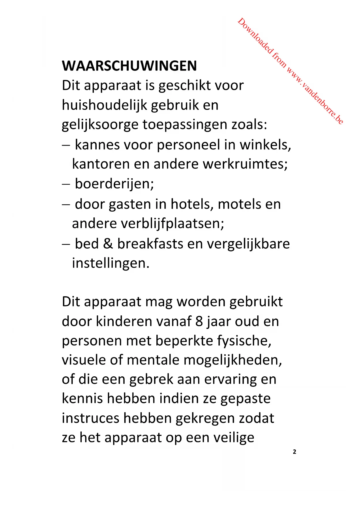 Downloaded from www.vandenborre.be2 WAARSCHUWINGEN Dit apparaat is geschikt voor huishoudelijk gebruik en gelijksoortige toepassingen zoals: kantines voor personeel in winkels, kantoren en andere werkruimtes; boerderijen; door gasten in hotels, motels en andere verblijfplaatsen; bed & breakfasts en vergelijkbare instellingen. Dit apparaat mag worden gebruikt door kinderen vanaf 8 jaar oud en personen met beperkte fysische, visuele of mentale mogelijkheden, of die een gebrek aan ervaring en kennis hebben indien ze gepaste instructies hebben gekregen zodat ze het apparaat op een veilige Downloaded from www.vandenborre.be3 manier kunnen gebruiken en op de hoogte zijn van de gevaren die het gebruik van het apparaat met zich meebrengt. Laat kinderen niet met het apparaat spelen. Kinderen mogen het apparaat niet zonder toezicht reinigen of onderhouden. Laat het snoer vervangen door de fabrikant, zijn reparateur of een gelijksoortig bevoegd persoon als het is beschadigd, om risico's te voorkomen. Voor details over de reinigingsmethode en -frequentie, zie de rubriek "Reiniging en onderhoud” op pagina 18&19.