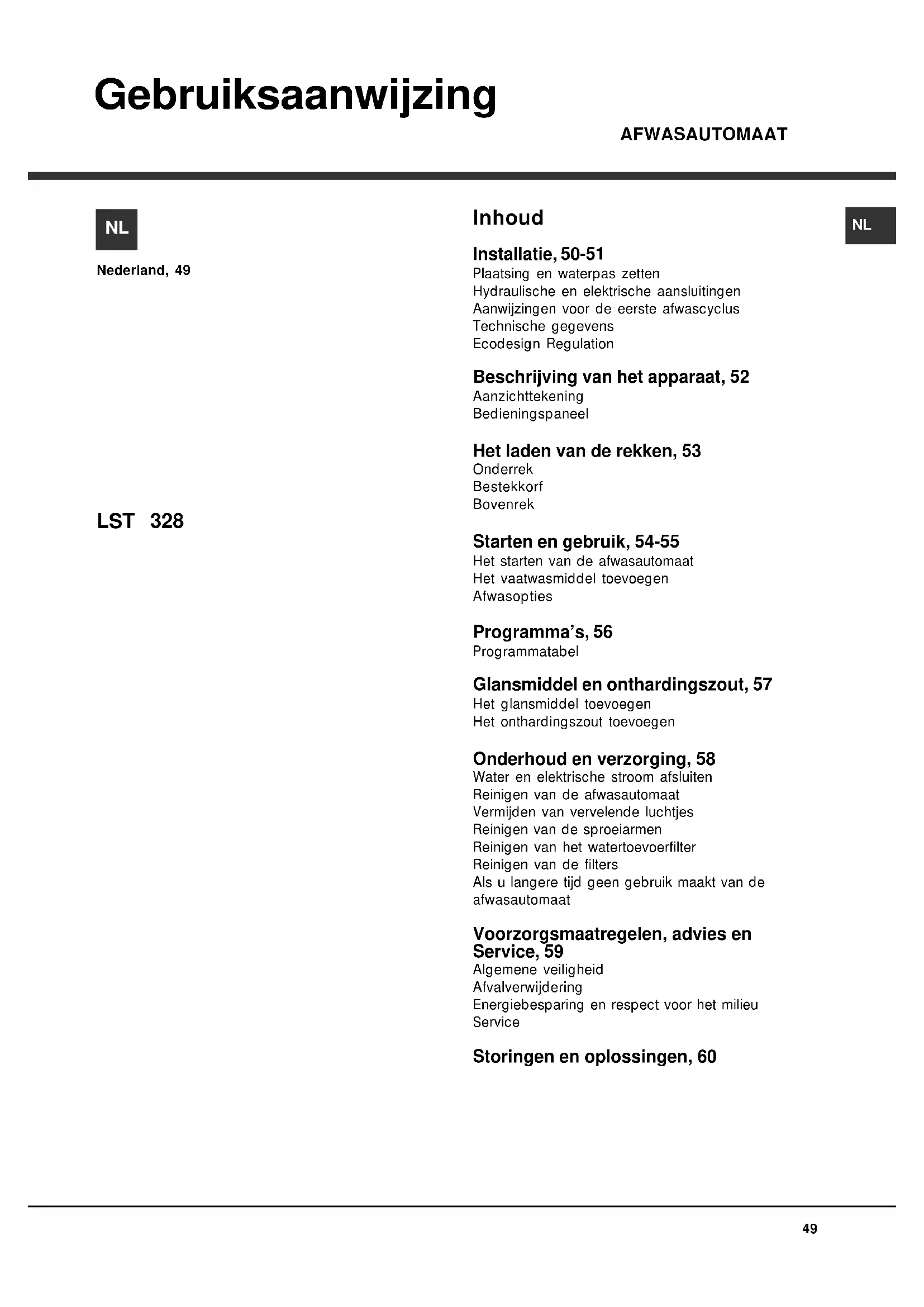 Gebruiksaanwijzing Inhoud Installatie, 50-51 Plaatsing en waterpas zetten Hydraulische en elektrische aansluitingen Aanwijzingen voor de eerste afwascyclus Technische gegevens Ecodesign Regulation Beschrijving van het apparaat, 52 Aanzichttekening Bedieningspaneel Het laden van de rekken, 53 Onderrek Bestekkorf Bovenrek Starten en gebruik, 54-55 Het starten van de afwasautomaat Het vaatwasmiddel toevoegen Afwasopties Programma’s, 56 Programmatabel Glansmiddel en onthardingszout, 57 Het glansmiddel toevoegen Het onthardingszout toevoegen Onderhoud en verzorging, 58 Water en elektrische stroom afsluiten Reinigen van de afwasautomaat Vermijden van vervelende luchtjes Reinigen van de sproeiarmen Reinigen van het watertoevoerfilter Reinigen van de filters Als u langere tijd geen gebruik maakt van de afwasautomaat Voorzorgsmaatregelen, advies en Service, 59 Algemene veiligheid Afvalverwijdering Energiebesparing en respect voor het milieu Service Storingen en oplossingen, 60 Nederland, 49