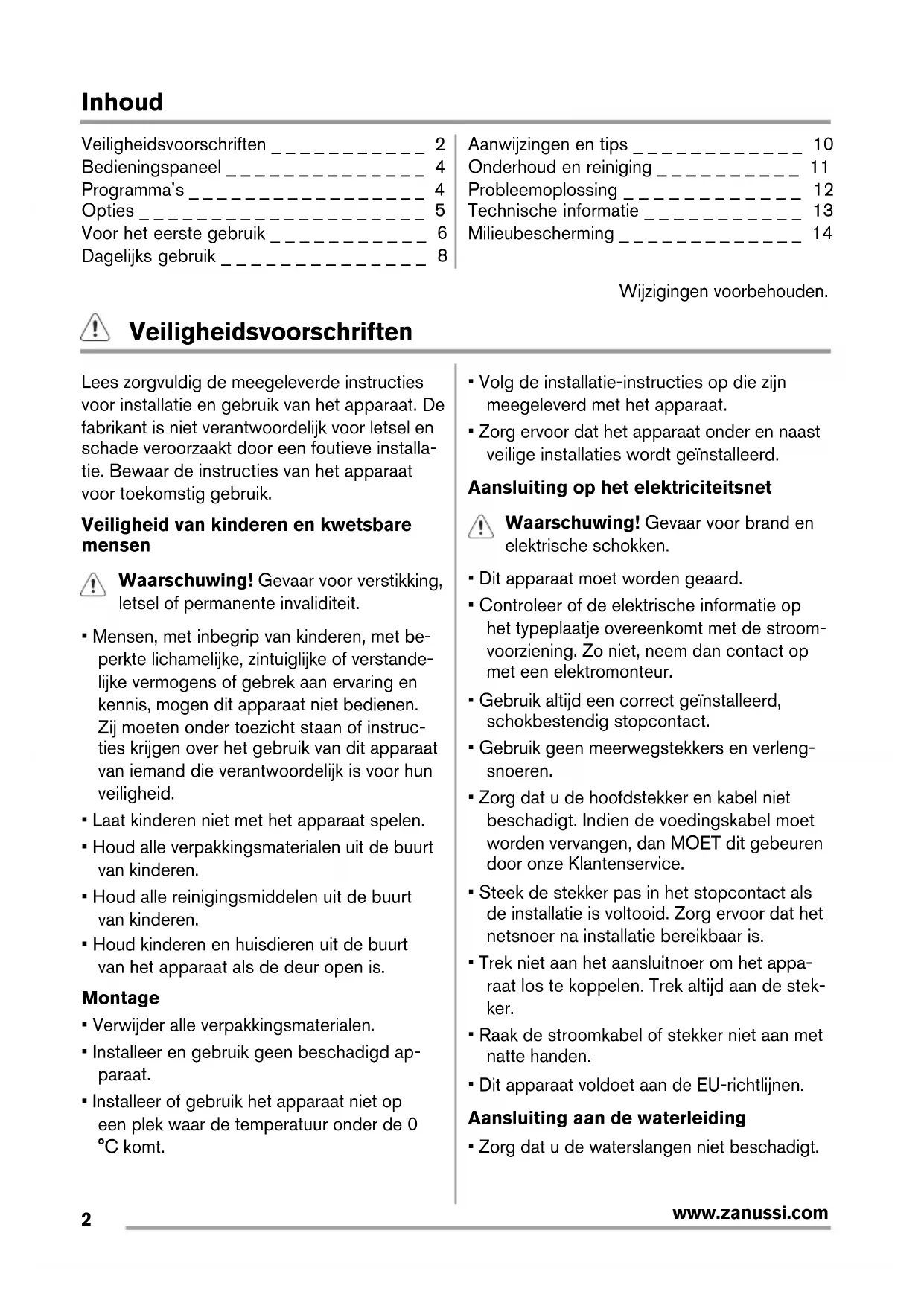www.zanussi.com• Laat het water stromen tot het schoon is voordat u het apparaat aansluit op nieuwe leidingen of leidingen die lang niet zijn ge- bruikt.