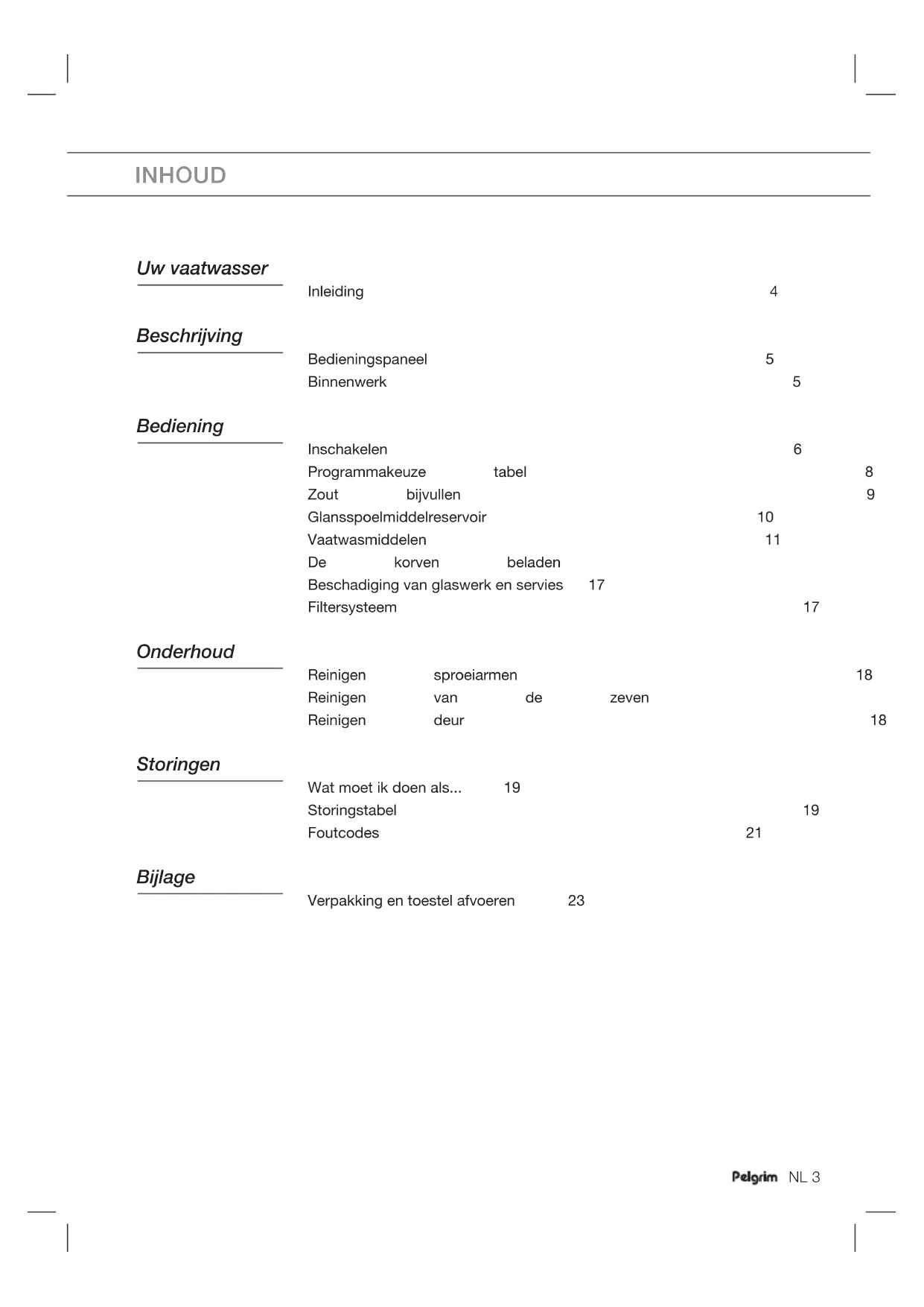 Handleiding Vaatwasser Mode d’emploi Lave-vaisselle Anleitung Geschirrspüler Instructions for use Dishwasher GVW481ONYNL Handleiding NL 3 - NL 23 FR Notice d’utilisation FR 3 - FR 23 DE Anleitung DE 3 - DE 23 EN User instruction EN 3 - EN 23 Gebruikte pictogrammen - Pictogrammes utilisés Benutzte Piktogramme - Pictograms used Belangrijk om te weten - Important à savoir Wissenswertes - Important information Tip - Conseil - Tipp - TipNL 3 INHOUD Uw vaatwasser Inleiding 4 Beschrijving Bedieningspaneel 5 Binnenwerk 5 Bediening Inschakelen 6 Programmakeuze tabel 8 Zout bijvullen 9 Glansspoelmiddelreservoir 10 Vaatwasmiddelen 11 De korven beladen 13 Beschadiging van glaswerk en servies 17 Filtersysteem 17 Onderhoud Reinigen sproeiarmen 18 Reinigen van de zeven 18 Reinigen deur 18 Storingen Wat moet ik doen als... 19 Storingstabel 19 Foutcodes 21 Bijlage Verpakking en toestel afvoeren 23NL 4 Inleiding U heeft gekozen voor een vaatwasser van Pelgrim. Optimaal gebruikscomfort en een eenvoudige bediening stonden voorop bij de ontwikkeling van dit product. In deze handleiding staat beschreven op welke manier u de vaatwasser zo optimaal mogelijk kunt benutten. U vindt informatie over de bediening en achtergrondinformatie over de werking van het toestel. Tevens treft u onderhoudstips aan. De veiligheidsvoorschriften die van belang zijn tijdens de installatie zijn opgenomen in het installatievoorschrift, dat bestemd is voor de installateur. Lees deze handleiding voordat u het toestel gaat gebruiken. Bewaar deze handleiding zorgvuldig zodat een eventuele volgende gebruiker er ook zijn voordeel mee kan doen. Lees voor gebruik eerst de separate veiligheidsinstructies! UW VAATWASSERNL 5 Bedieningpaneel