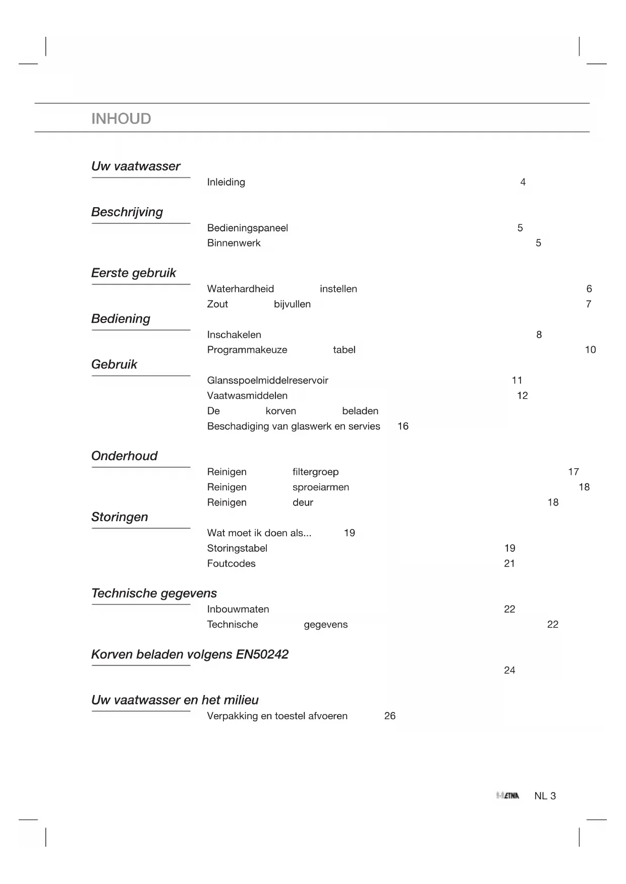 Bestekmand De informatie voor een vergelijktest in overeenstemming met EN50242 is als volgt:• Capaciteit: 12 couverts • Positie bovenkorf: bovenste wieltjes op geleiders• Programma: ECO• Spoelstand: 6• Waterhardheid instelling: H3NL 26 Afvoer van het apparaat en de verpakking Dit product is gemaakt van duurzame materialen. Aan het einde van zijn nuttige leven moet het apparaat echter op een verantwoorde manier worden afgevoerd. De overheid kan u hierover informeren. De verpakking van het apparaat kan worden gerecycled. Er is gebruikgemaakt van de volgende materialen: