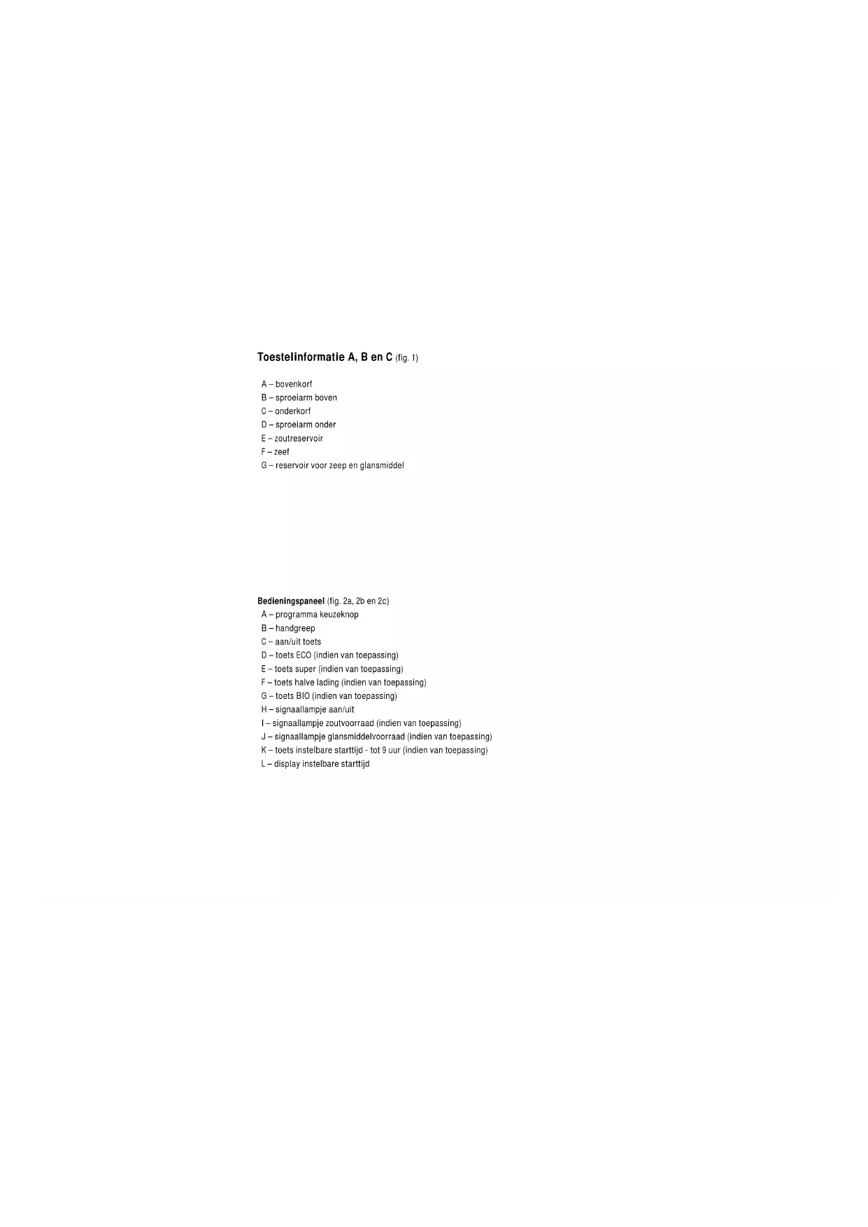 - H I I J JKLToestelinformatie A, B en C (fig. 1) A – bovenkorf B – sproeiarm boven C – onderkorf D – sproeiarm onder E – zoutreservoir F – zeef G – reservoir voor zeep en glansmiddel Bedieningspaneel (fig. 2a, 2b en 2c) A – programma keuzeknop B – handgreep C – aan/uit toets D – toets ECO (indien van toepassing) E – toets super (indien van toepassing) F – toets halve lading (indien van toepassing) G – toets BIO (indien van toepassing) H – signaallampje aan/uit I – signaallampje zoutvoorraad (indien van toepassing) J – signaallampje glansmiddelvoorraad (indien van toepassing) K – toets instelbare starttijd - tot 9 uur (indien van toepassing) L – display instelbare starttijd1 Introductie Als u deze gebruiksaanwijzing doorleest, bent u snel op de hoogte van alle mogelijkheden die dit toestel u biedt. U vindt informatie voor uw veiligheid en over het onderhoud van het toestel. Verder vindt u milieutips en aanwijzingen om energie te besparen. Bewaar de gebruiksaanwijzing en het installatievoorschrift. Een eventueel volgende gebruiker van dit toestel kan daar zijn voordeel mee doen. Dit toestel voldoet aan de geldende CE-richtlijnen. Inhoud NL ■ Introductie p. 1