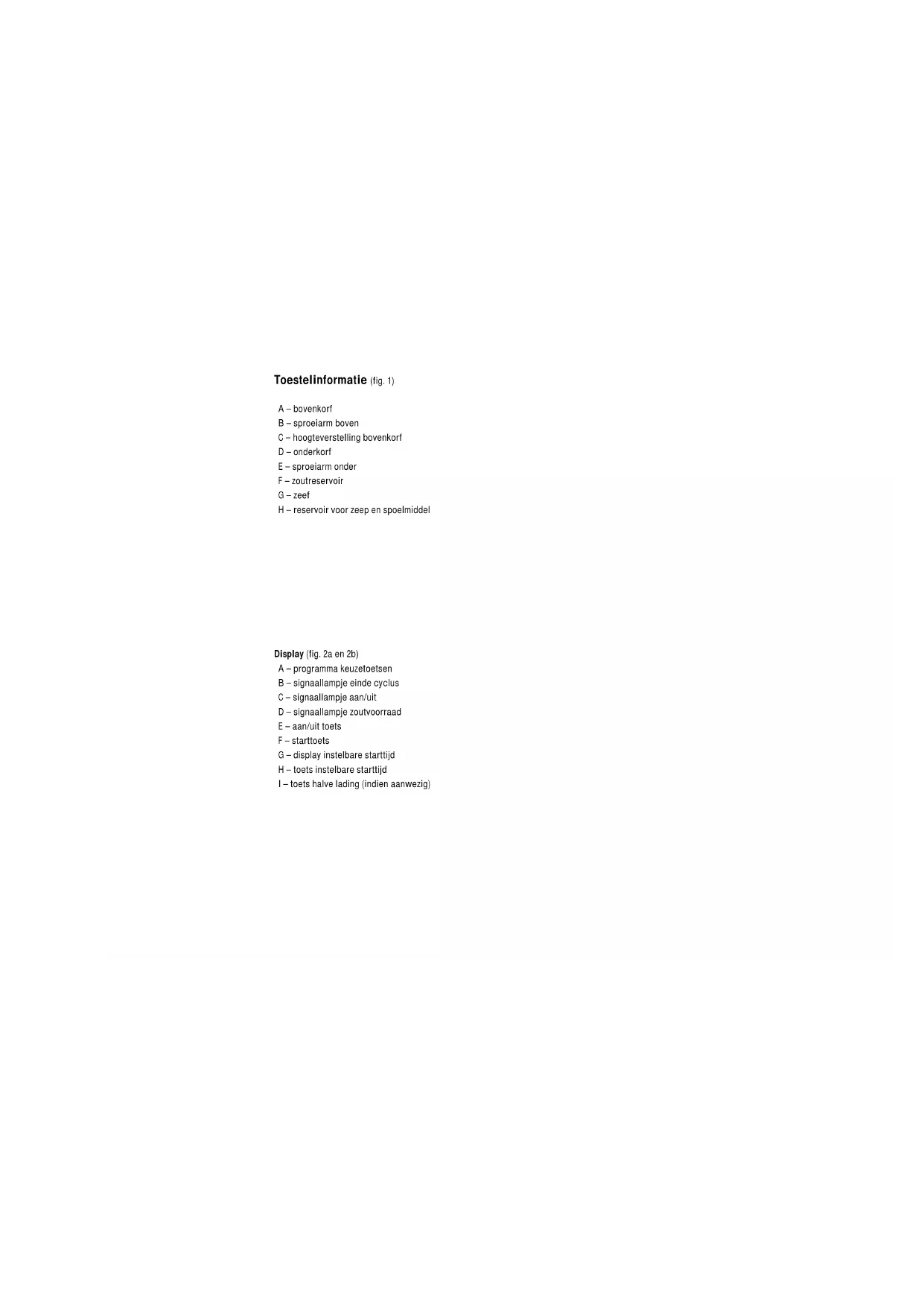 - 2Toestelinformatie (fig. 1) A – bovenkorf B – sproeiarm boven C – hoogteverstelling bovenkorf D – onderkorf E – sproeiarm onder F – zoutreservoir G – zeef H – reservoir voor zeep en spoelmiddel Display (fig. 2a en 2b) A – programma keuzetoetsen B – signaallampje einde cyclus C – signaallampje aan/uit D – signaallampje zoutvoorraad E – aan/uit toets F – starttoets G – display instelbare starttijd H – toets instelbare starttijd I – toets halve lading (indien aanwezig)1 Introductie Als u deze gebruiksaanwijzing doorleest, bent u snel op de hoogte van alle mogelijkheden die dit toestel u biedt. U vindt informatie voor uw veiligheid en over het onderhoud van het toestel. Verder vindt u milieutips en aanwijzingen om energie te besparen. Bewaar de gebruiksaanwijzing en het installatievoorschrift. Een eventueel volgende gebruiker van dit toestel kan daar zijn voordeel mee doen. Dit toestel voldoet aan de voorschriften van de richtlijn 89/336/EEG inzake elektromagnetische compatibiliteit. Inhoud NL ■ Veiligheid p. 2
