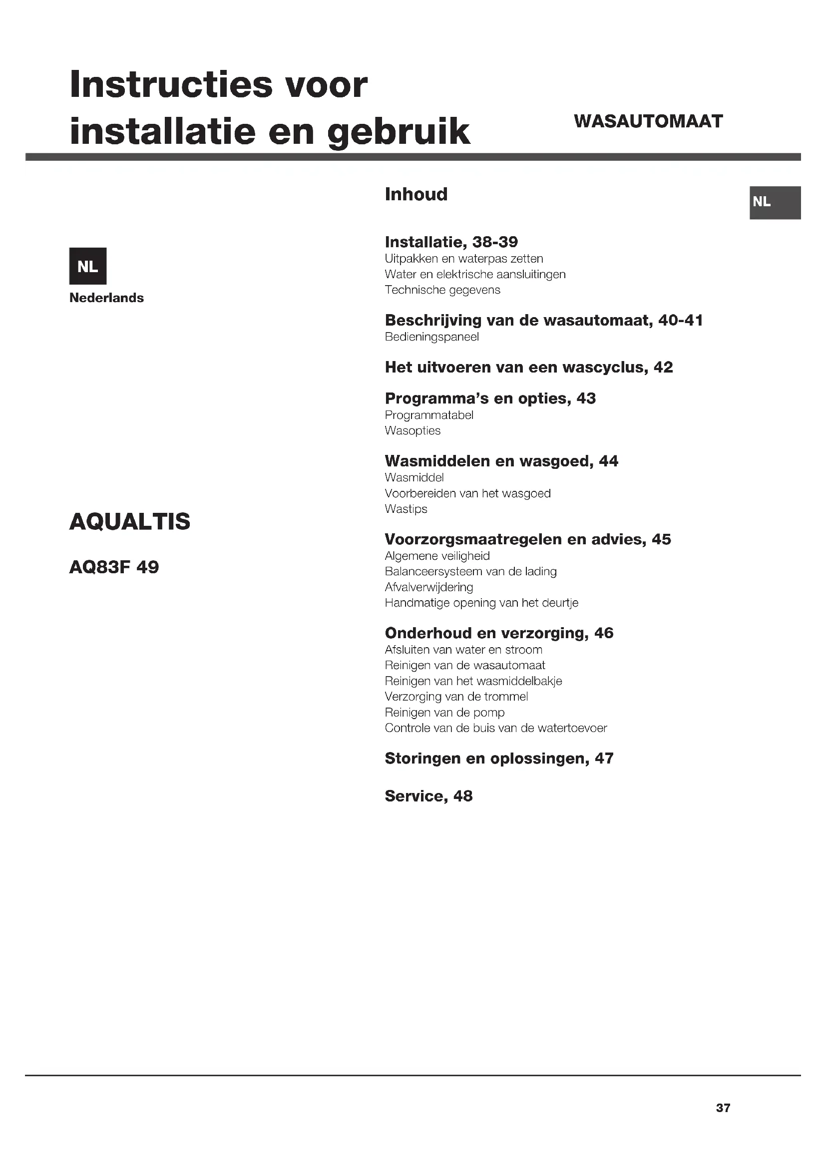 WASAUTOMAAT AQUALTIS AQ83F 49 Instructies voor installatie en gebruikNL