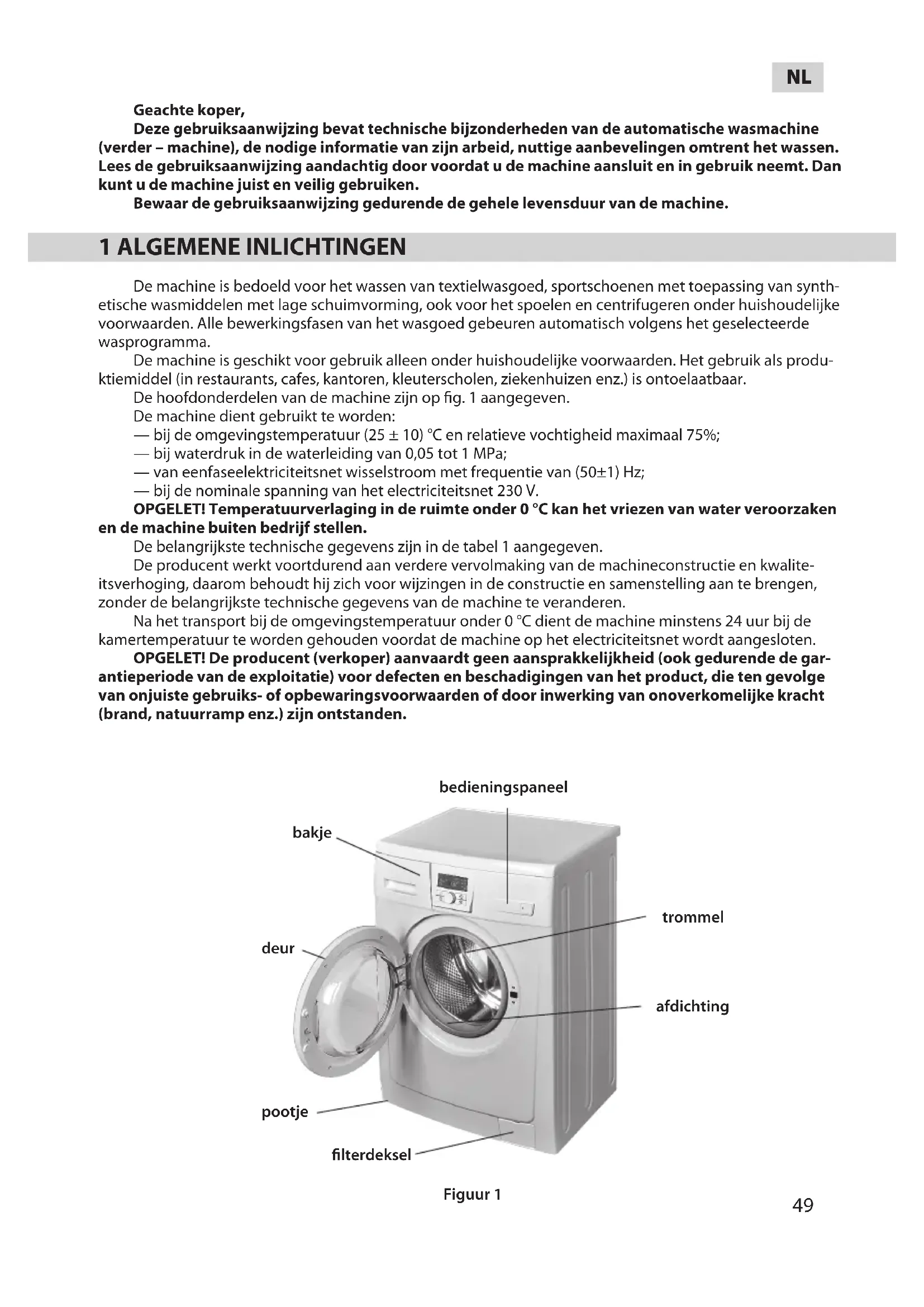 Figuur 1 bakje lterdeksel pootje deur afdichting trommel bedieningspaneel Geachte koper, Deze gebruiksaanwijzing bevat technische bijzonderheden van de automatische wasmachine (verder – machine), de nodige informatie van zijn arbeid, nuttige aanbevelingen omtrent het wassen. Lees de gebruiksaanwijzing aandachtig door voordat u de machine aansluit en in gebruik neemt. Dan kunt u de machine juist en veilig gebruiken. Bewaar de gebruiksaanwijzing gedurende de gehele levensduur van de machine. 1 ALGEMENE INLICHTINGEN De machine is bedoeld voor het wassen van textielwasgoed, sportschoenen met toepassing van synth- etische wasmiddelen met lage schuimvorming, ook voor het spoelen en centrifugeren onder huishoudelijke voorwaarden. Alle bewerkingsfasen van het wasgoed gebeuren automatisch volgens het geselecteerde wasprogramma. De machine is geschikt voor gebruik alleen onder huishoudelijke voorwaarden. Het gebruik als produ- ktiemiddel (in restaurants, cafes, kantoren, kleuterscholen, ziekenhuizen enz.) is ontoelaatbaar. De hoofdonderdelen van de machine zijn op fig. 1 aangegeven. De machine dient gebruikt te worden: — bij de omgevingstemperatuur (25 ± 10) °С en relatieve vochtigheid maximaal 75%; — bij waterdruk in de waterleiding van 0,05 tot 1 МPа; — van eenfaseelektriciteitsnet wisselstroom met frequentie van (50±1) Hz; — bij de nominale spanning van het electriciteitsnet 230 V. OPGELET! Temperatuurverlaging in de ruimte onder 0 °С kan het vriezen van water veroorzaken en de machine buiten bedrijf stellen. De belangrijkste technische gegevens zijn in de tabel 1 aangegeven. De producent werkt voortdurend aan verdere vervolmaking van de machineconstructie en kwalite- itsverhoging, daarom behoudt hij zich voor wijzingen in de constructie en samenstelling aan te brengen, zonder de belangrijkste technische gegevens van de machine te veranderen. Na het transport bij de omgevingstemperatuur onder 0 °С dient de machine minstens 24 uur bij de kamertemperatuur te worden gehouden voordat de machine op het electriciteitsnet wordt aangesloten. OPGELET! De producent (verkoper) aanvaardt geen aansprakkelijkheid (ook gedurende de gar- antieperiode van de exploitatie) voor defecten en beschadigingen van het product, die ten gevolge van onjuiste gebruiks- of opbewaringsvoorwaarden of door inwerking van onoverkomelijke kracht (brand, natuurramp enz.) zijn ontstanden.50