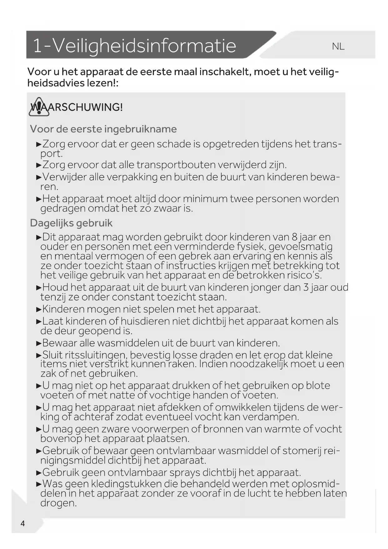 Voor u het apparaat de eerste maal inschakelt, moet u het veilig- heidsadvies lezen!: WAARSCHUWING! Voor de eerste ingebruikname ▶ Zorg ervoor dat er geen schade is opgetreden tijdens het trans- port. ▶ Zorg ervoor dat alle transportbouten verwijderd zijn. ▶ Verwijder alle verpakking en buiten de buurt van kinderen bewa- ren. ▶ Het apparaat moet altijd door minimum twee personen worden gedragen omdat het zo zwaar is. Dagelijks gebruik ▶ Dit apparaat mag worden gebruikt door kinderen van 8 jaar en ouder en personen met een verminderde fysiek, gevoelsmatig en mentaal vermogen of een gebrek aan ervaring en kennis als ze onder toezicht staan of instructies krijgen met betrekking tot het veilige gebruik van het apparaat en de betrokken risico’s. ▶ Houd het apparaat uit de buurt van kinderen jonger dan 3 jaar oud tenzij ze onder constant toezicht staan. ▶ Kinderen mogen niet spelen met het apparaat. ▶ Laat kinderen of huisdieren niet dichtbij het apparaat komen als de deur geopend is. ▶ Bewaar alle wasmiddelen uit de buurt van kinderen. ▶ Sluit ritssluitingen, bevestig losse draden en let erop dat kleine items niet verstrikt kunnen raken. Indien noodzakelijk moet u een zak of net gebruiken. ▶ U mag niet op het apparaat drukken of het gebruiken op blote voeten of met natte of vochtige handen of voeten. ▶ U mag het apparaat niet afdekken of omwikkelen tijdens de wer- king of achteraf zodat eventueel vocht kan verdampen. ▶ U mag geen zware voorwerpen of bronnen van warmte of vocht bovenop het apparaat plaatsen. ▶ Gebruik of bewaar geen ontvlambaar wasmiddel of stomerij rei- nigingsmiddel dichtbij het apparaat. ▶ Gebruik geen ontvlambaar sprays dichtbij het apparaat. ▶ Was geen kledingstukken die behandeld werden met oplosmid- delen in het apparaat zonder ze vooraf in de lucht te hebben laten drogen.NL 1-Veiligheidsinformatie